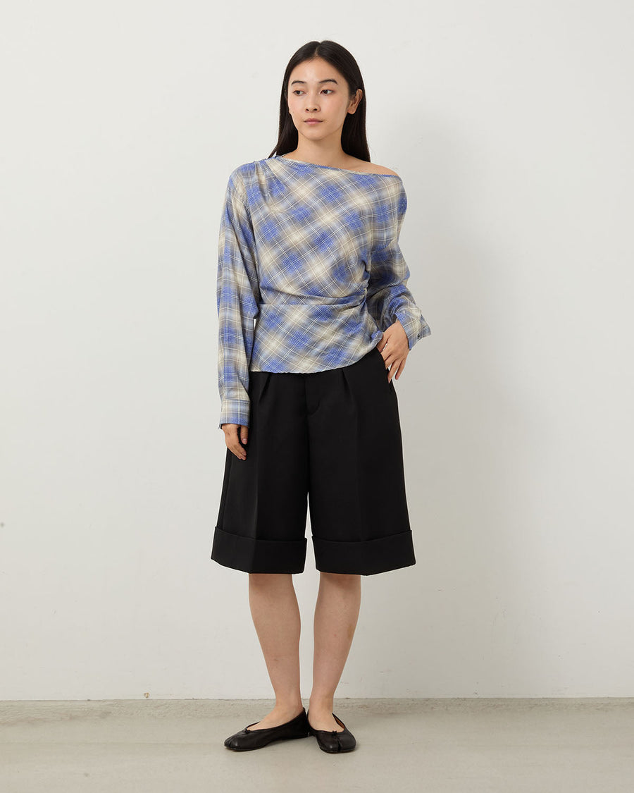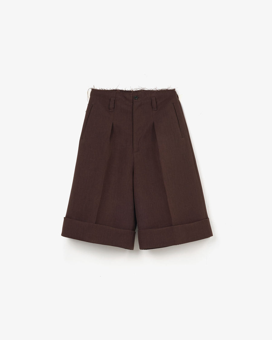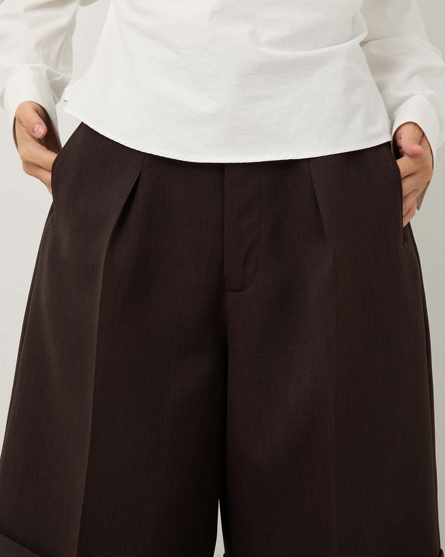 ワイドシルエットに太めの折り返し裾を設け、ベルトループには前後で高さを変えた遊び心のあるデザインが特徴です。