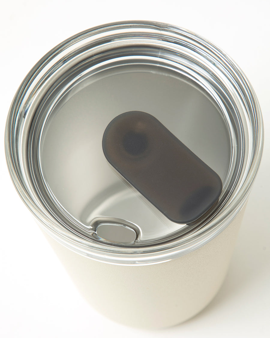 真空二重構造を採用した「TO GO TUMBLER」です。飲み心地にこだわった蓋の穴は、適量のドリンクが出るよう設計されています。
