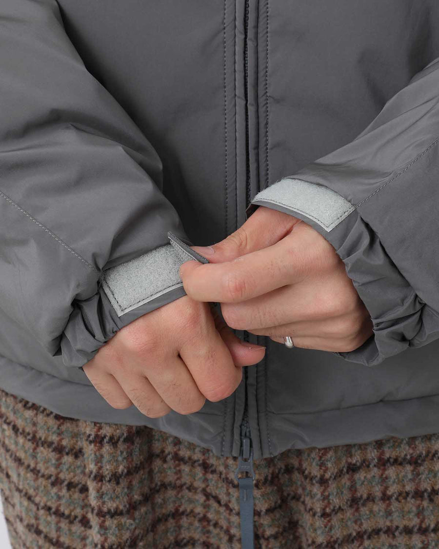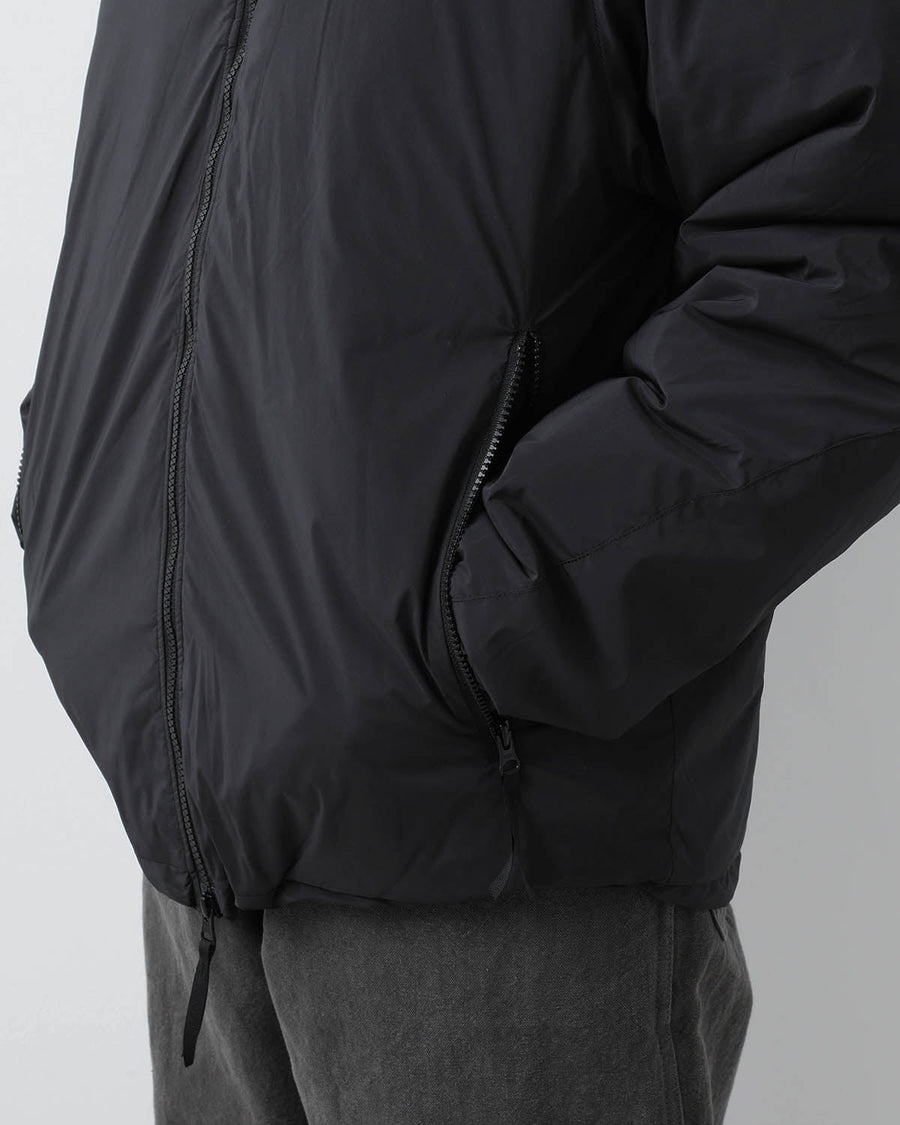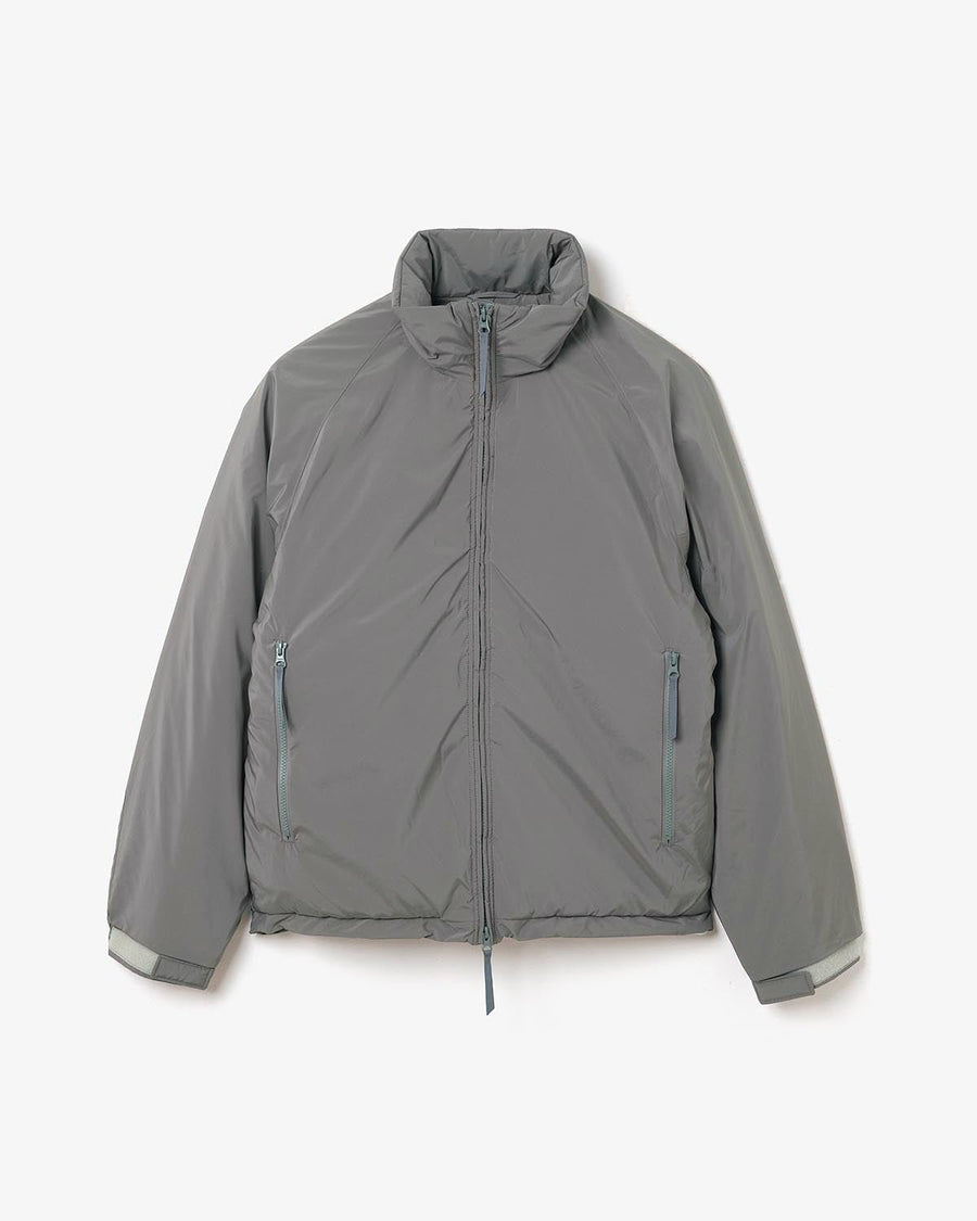 軽量な超細番手のポリエステル・ナイロン混紡糸を高密度に織り上げた、撥水ウェザー素材のパフジャケットです。
