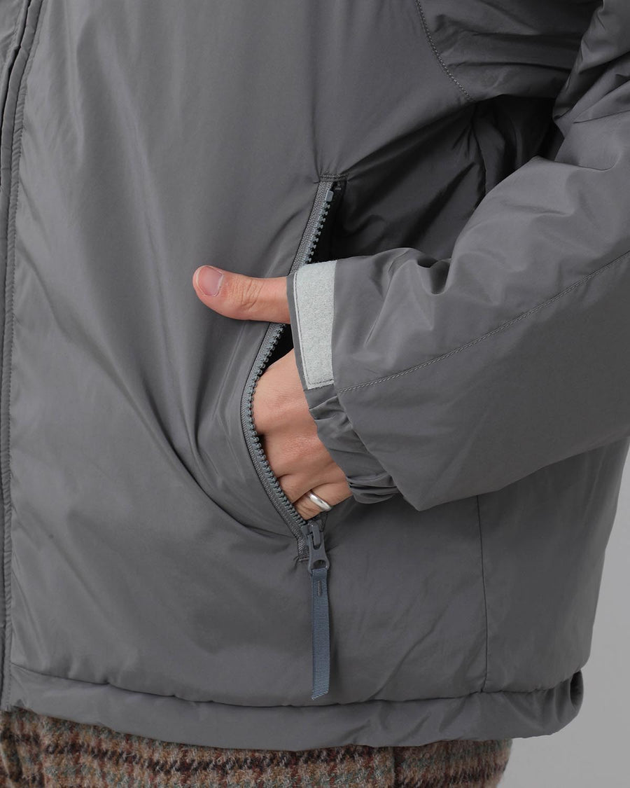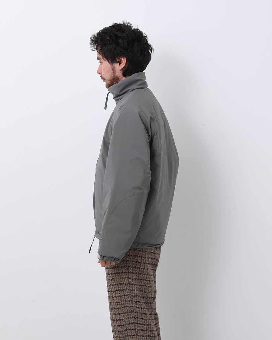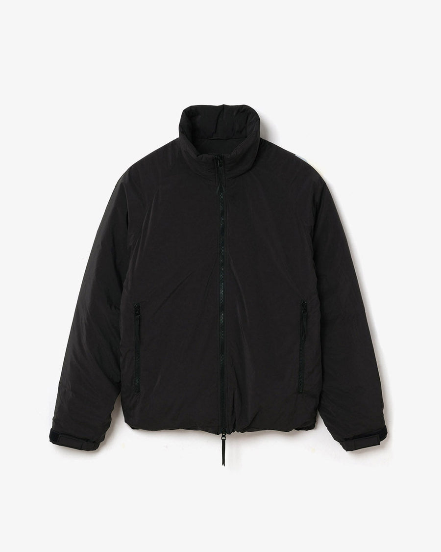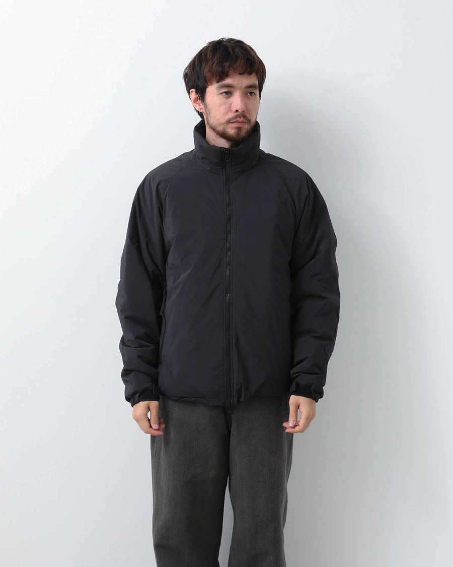 軽量な超細番手のポリエステル・ナイロン混紡糸を高密度に織り上げた、撥水ウェザー素材のパフジャケットです。