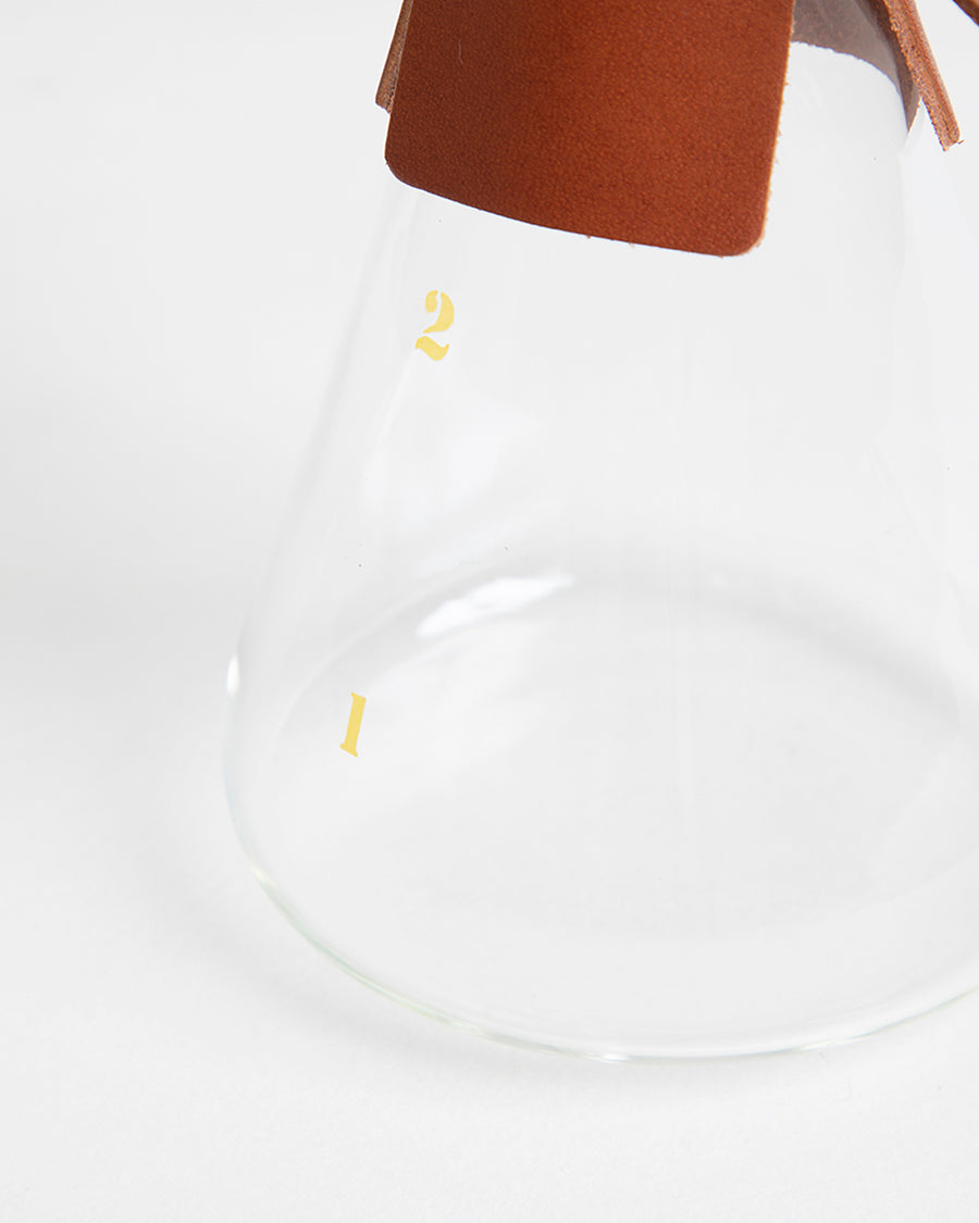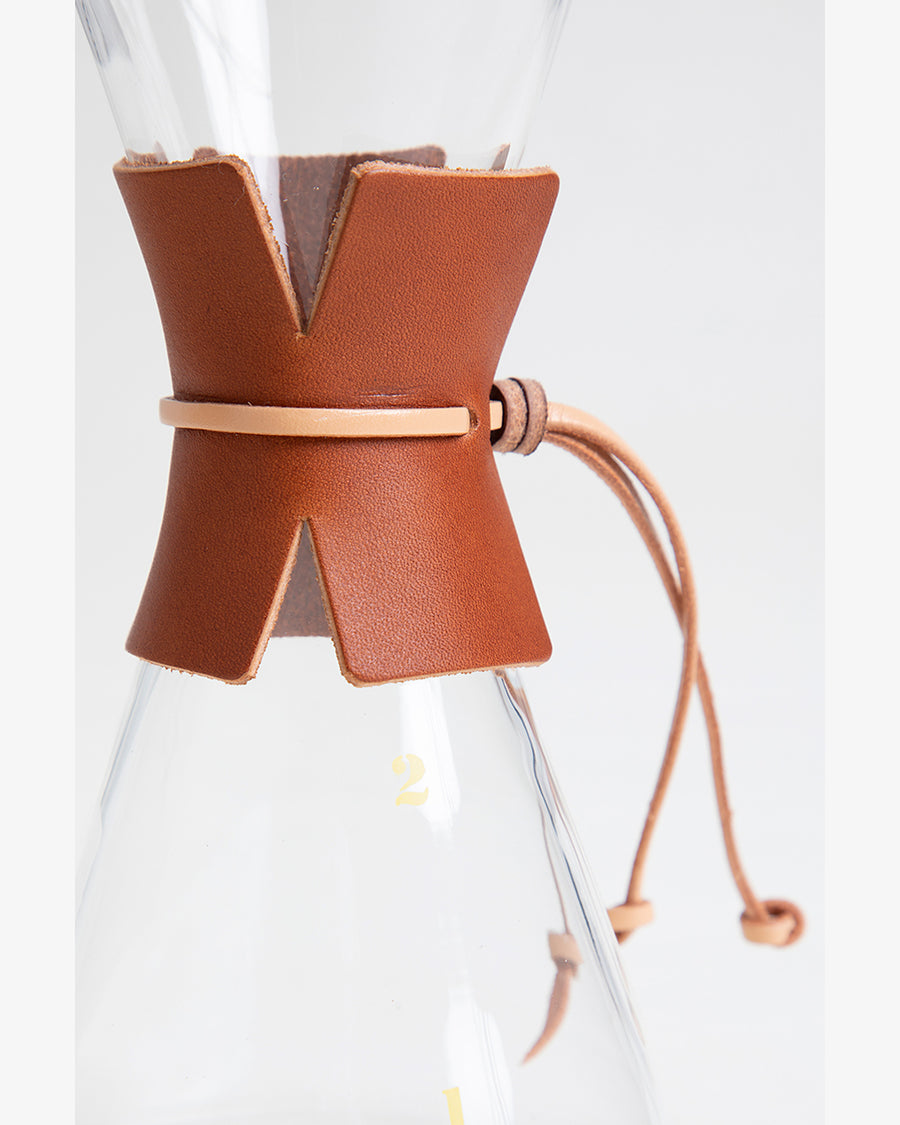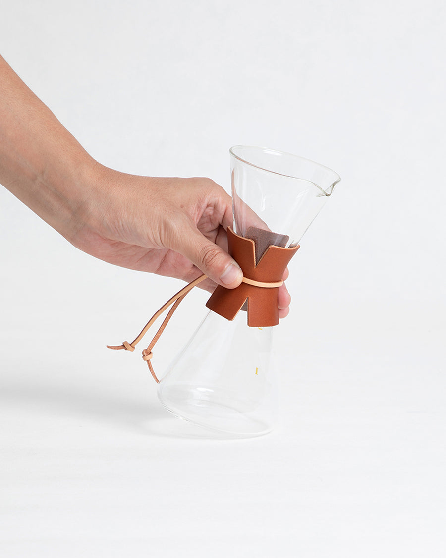 硬質ガラス素材にレザーカバーがついたコーヒードリッパーです。