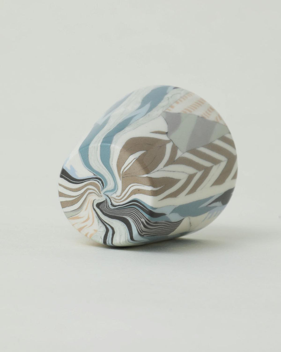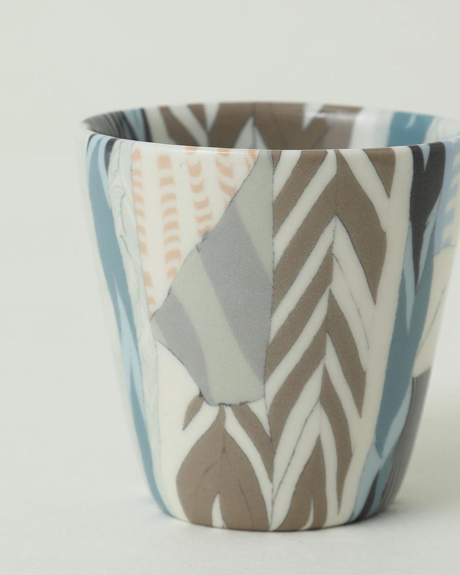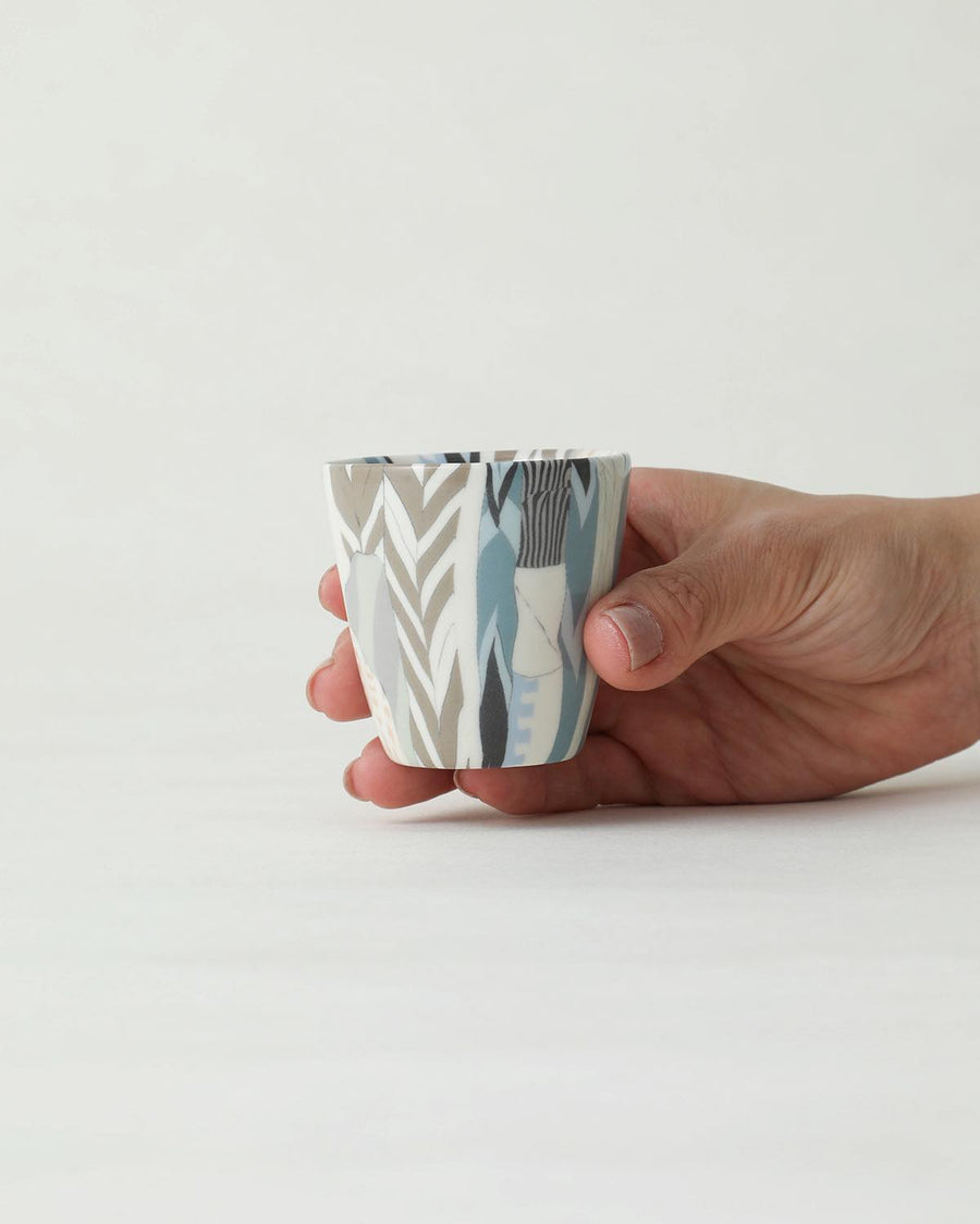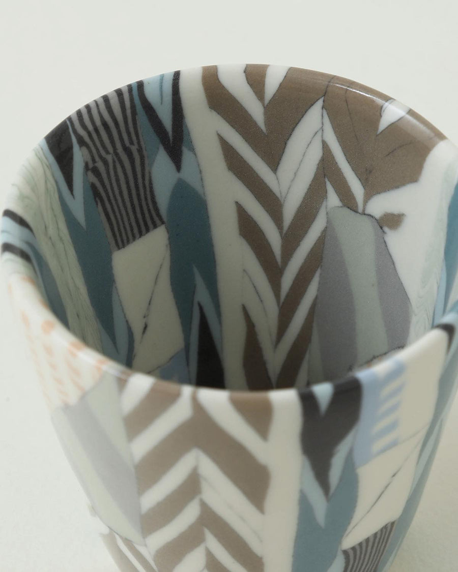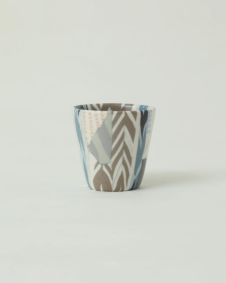 顔料を練りこんだ粘土を使用し柄を作る“練り上げ“と呼ばれる技法を用いて制作された「ぐい呑 ⼤ - stitch」です。