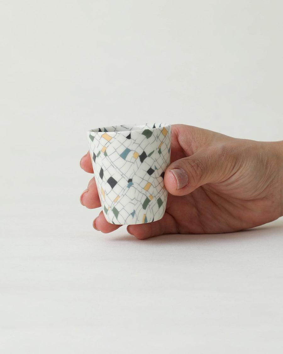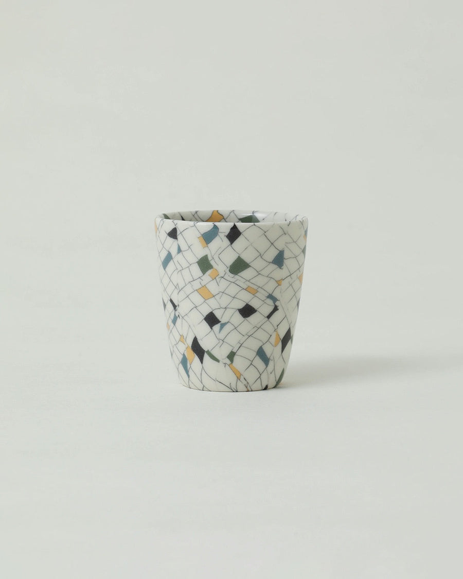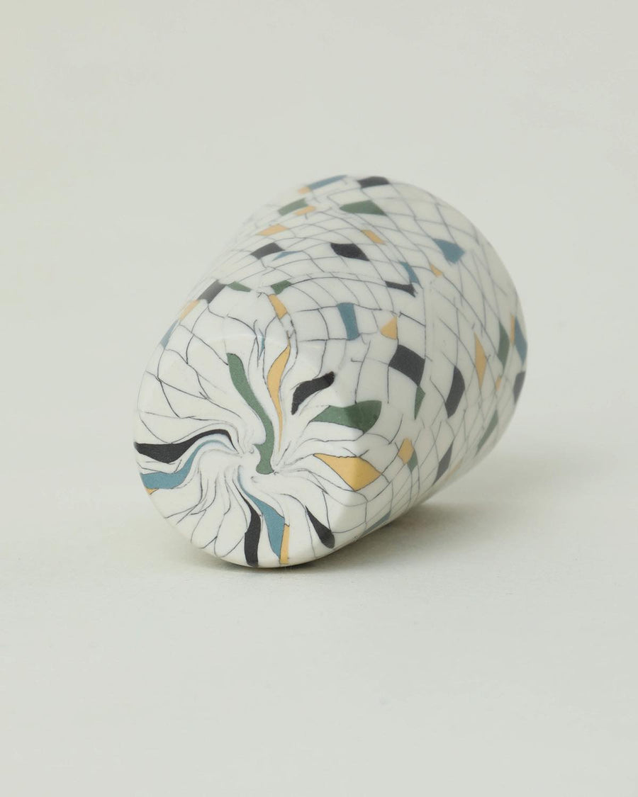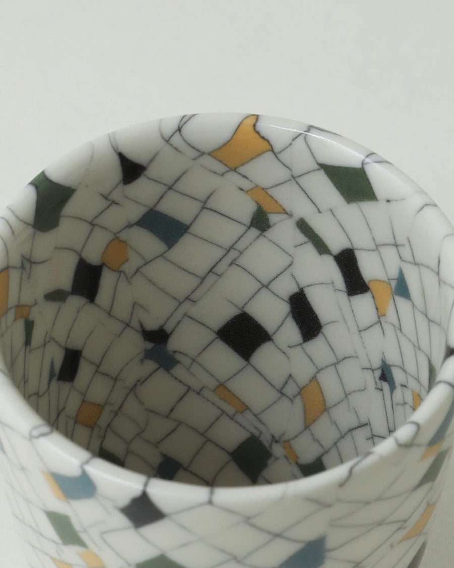 顔料を練りこんだ粘土を使用し柄を作る“練り上げ“と呼ばれる技法を用いて制作された「ぐい呑 - タイル」です。