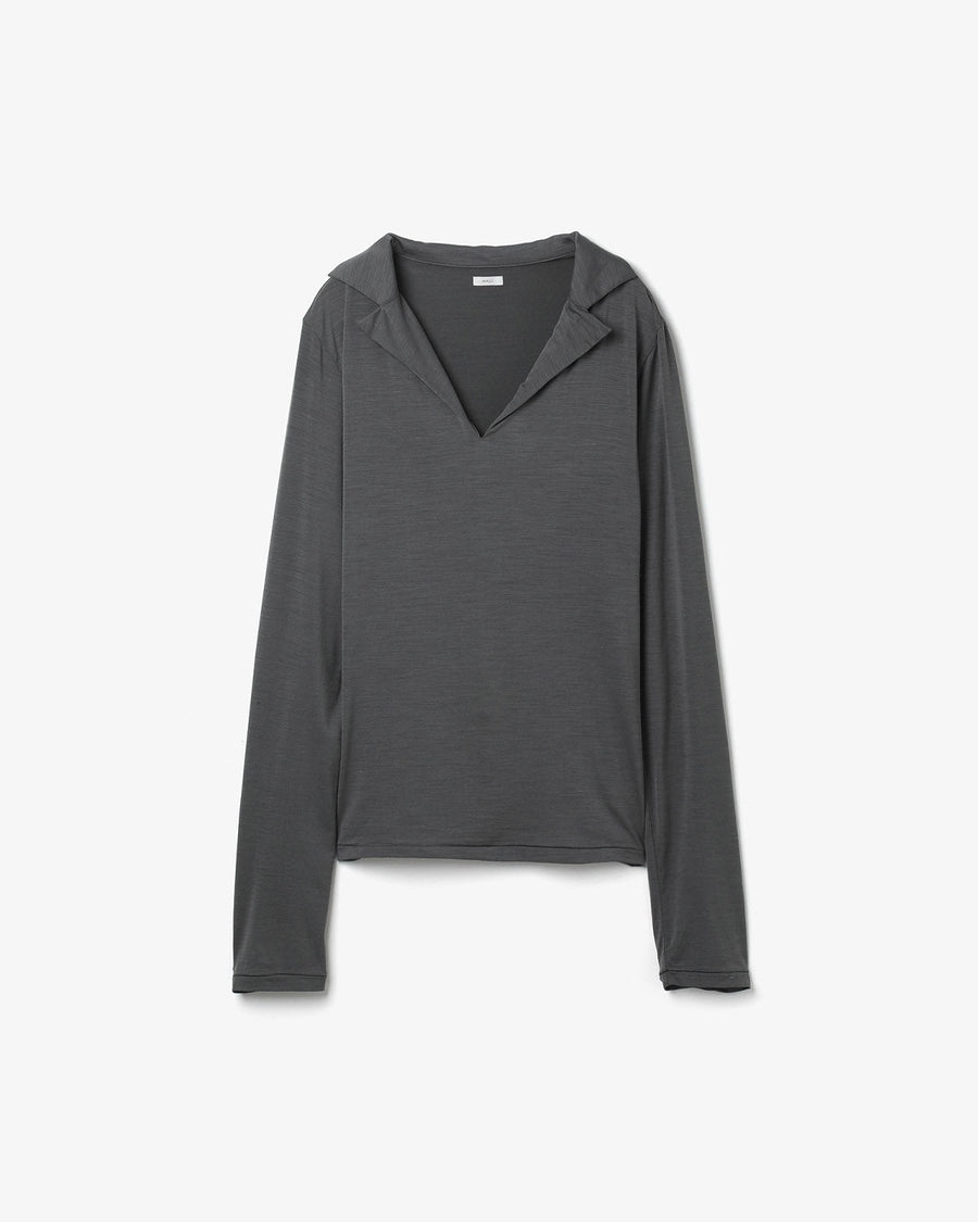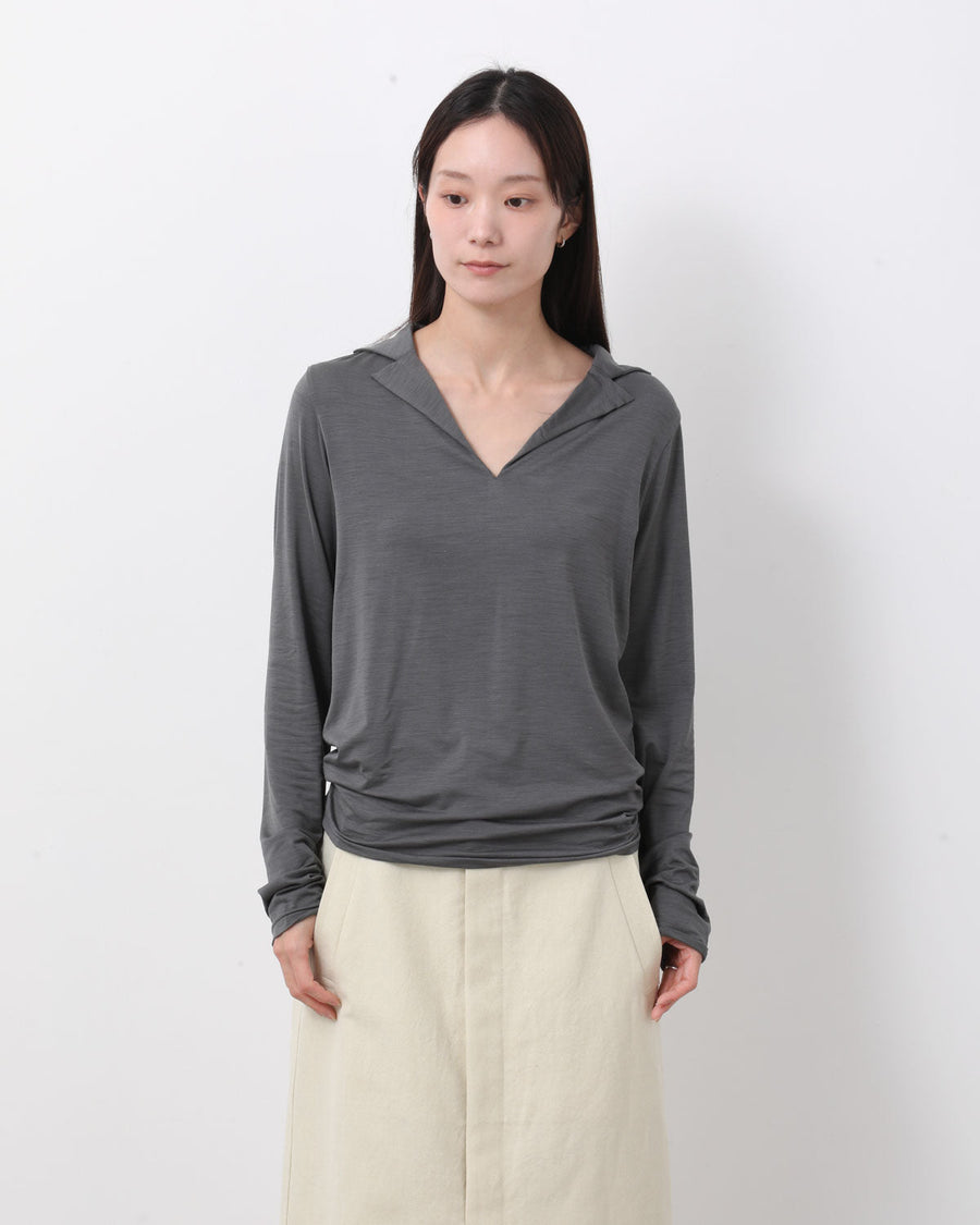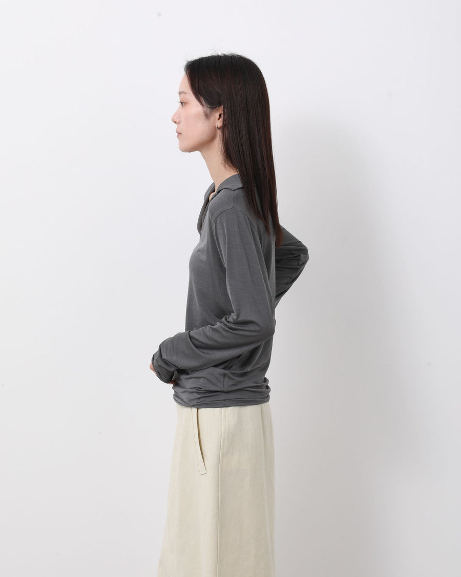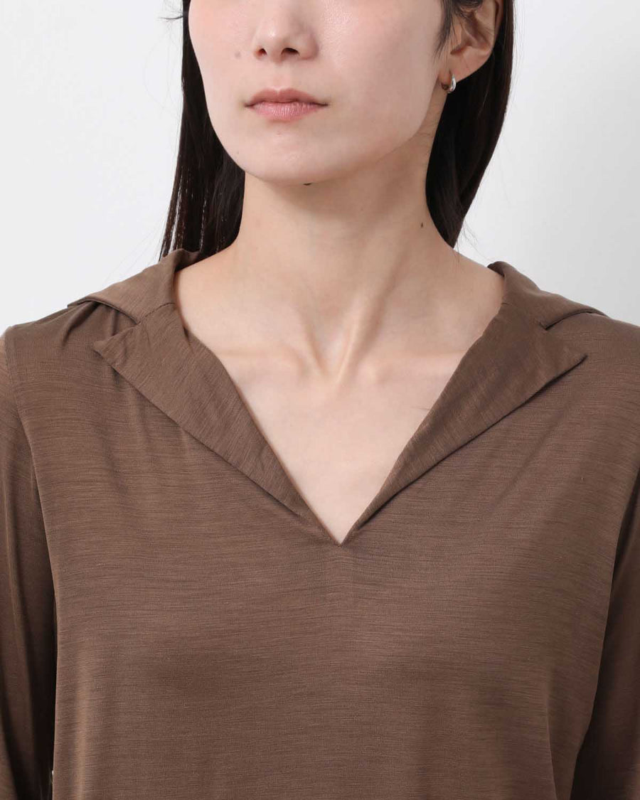 極細のシルク糸に伸縮性を持たせた、ストレッチシルク素材を使用したスキッパーカラーロングスリーブトップスです。