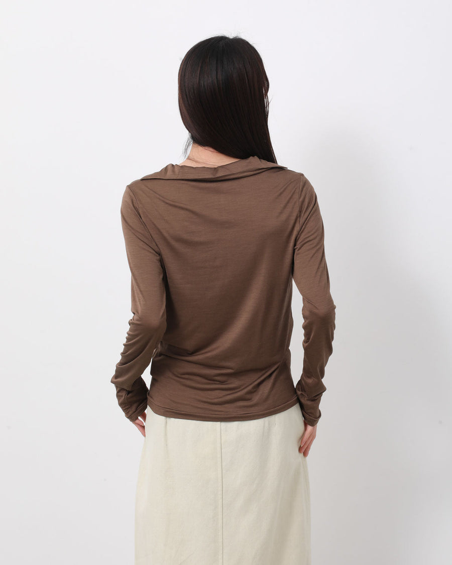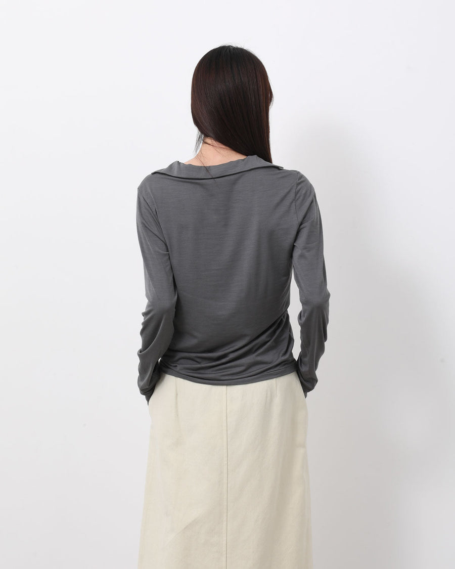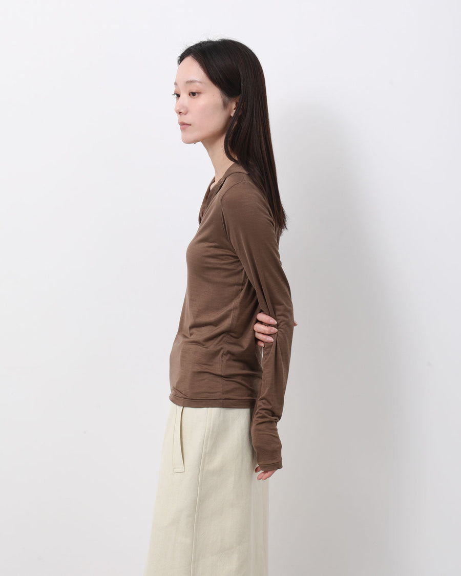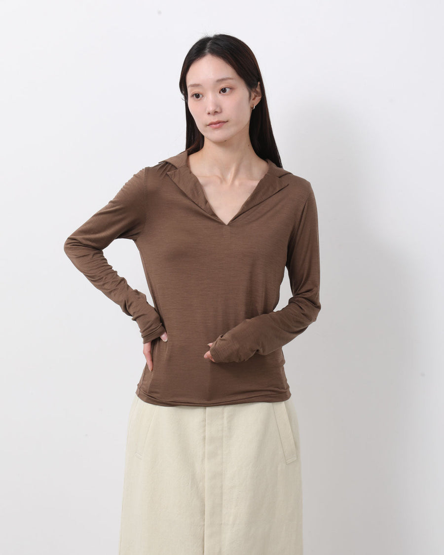 極細のシルク糸に伸縮性を持たせた、ストレッチシルク素材を使用したスキッパーカラーロングスリーブトップスです。