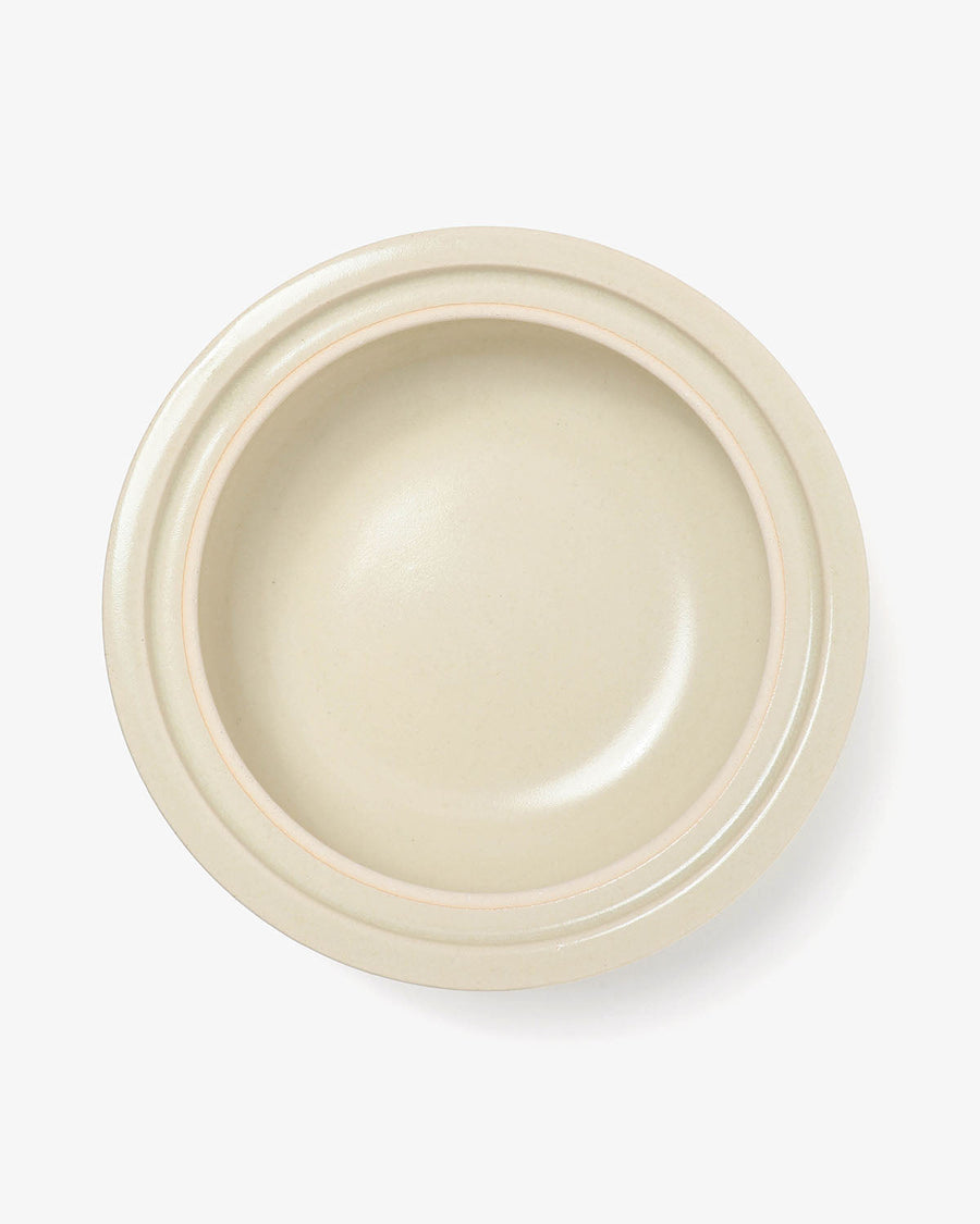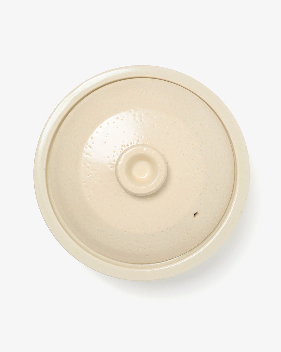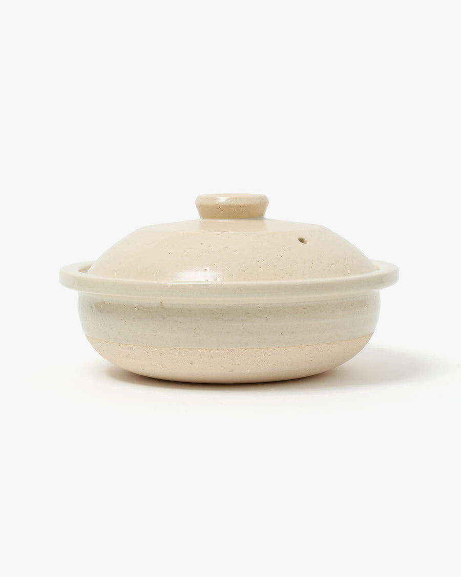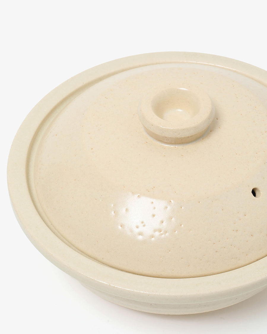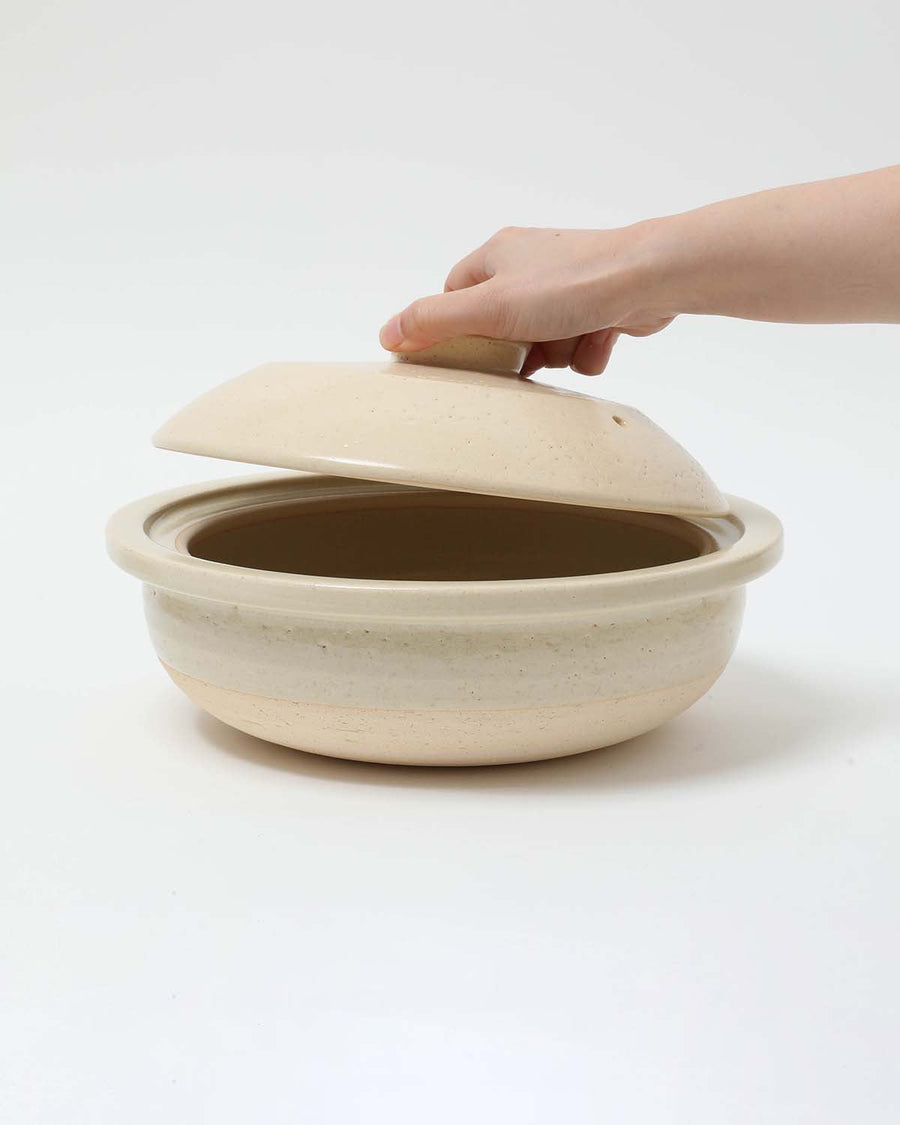 持ち手のない、フチ全体がせり出した独特のフォルムが印象的な「土鍋 4人用 - 生成」です。