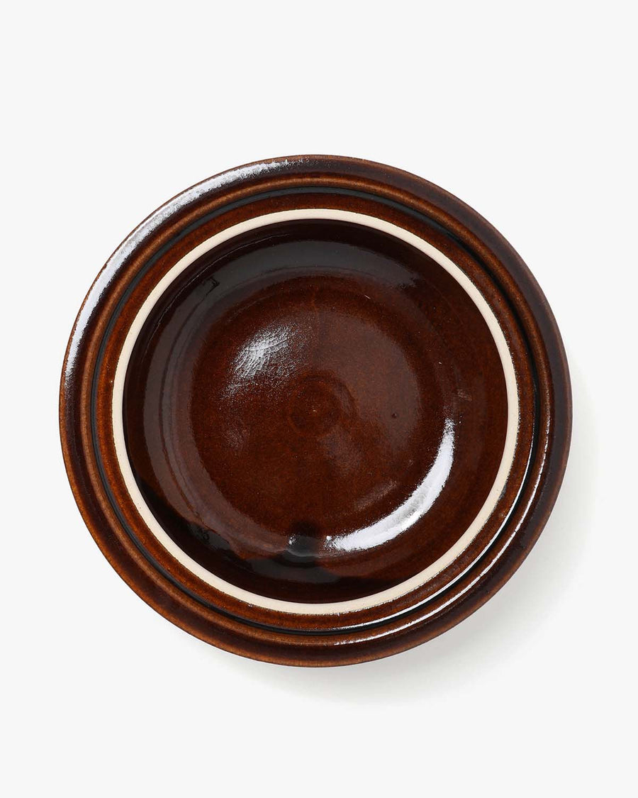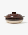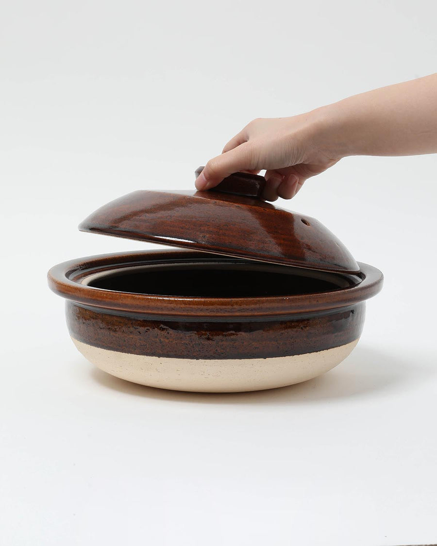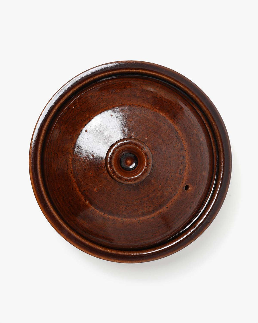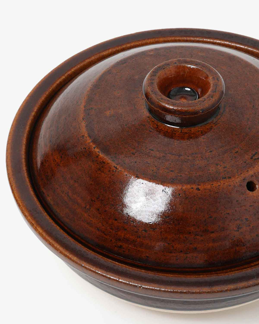 持ち手のない、フチ全体がせり出した独特のフォルムが印象的な「⼟鍋 4⼈⽤ - 飴⾊」です。