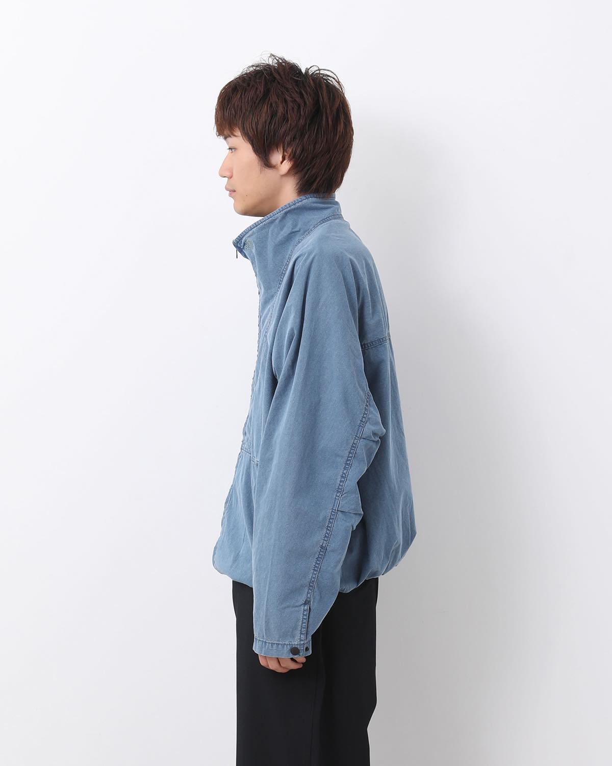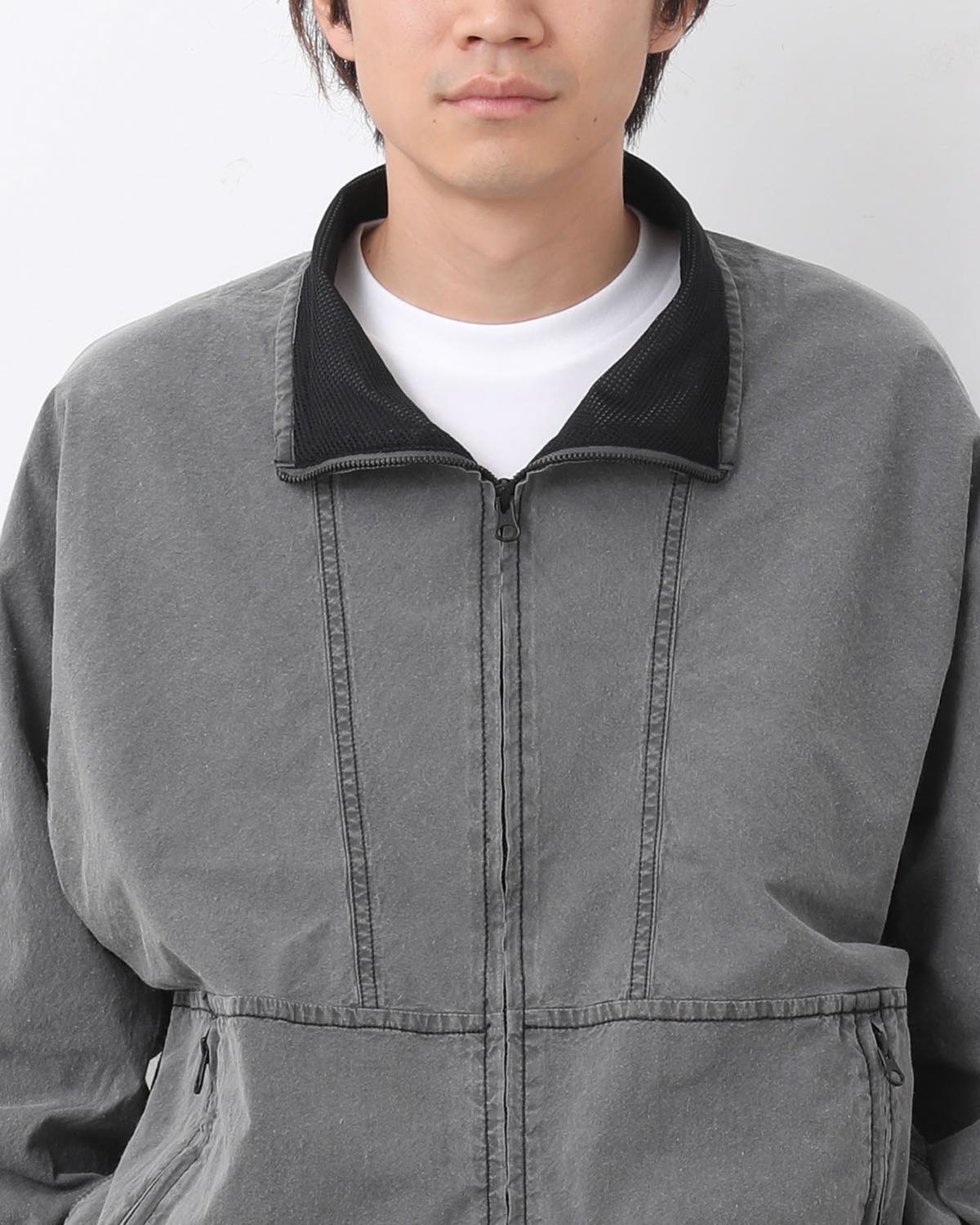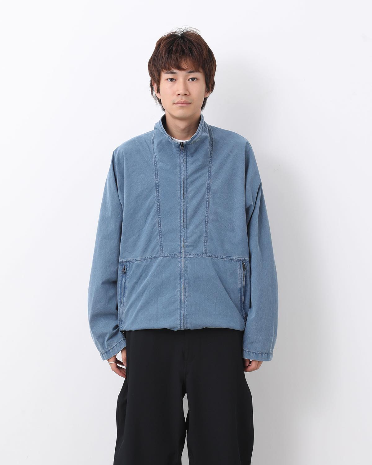 たて糸にネップ糸、よこ糸にリサイクルナイロンを織り上げたコットンナイロンインディゴウェザーのトラックジャケットです。
