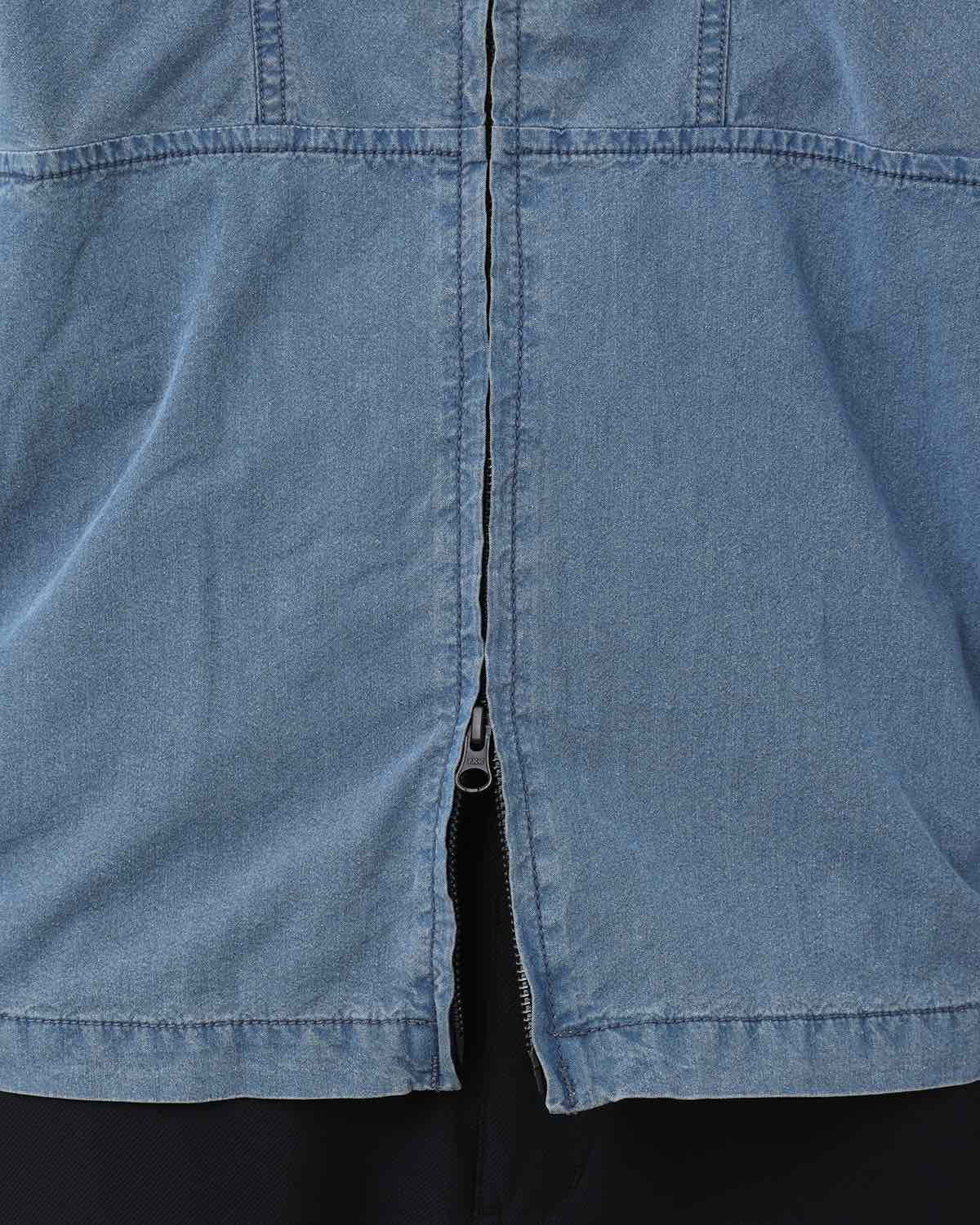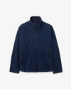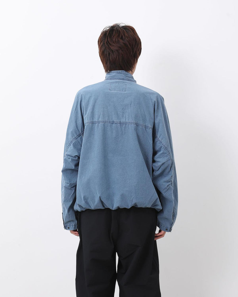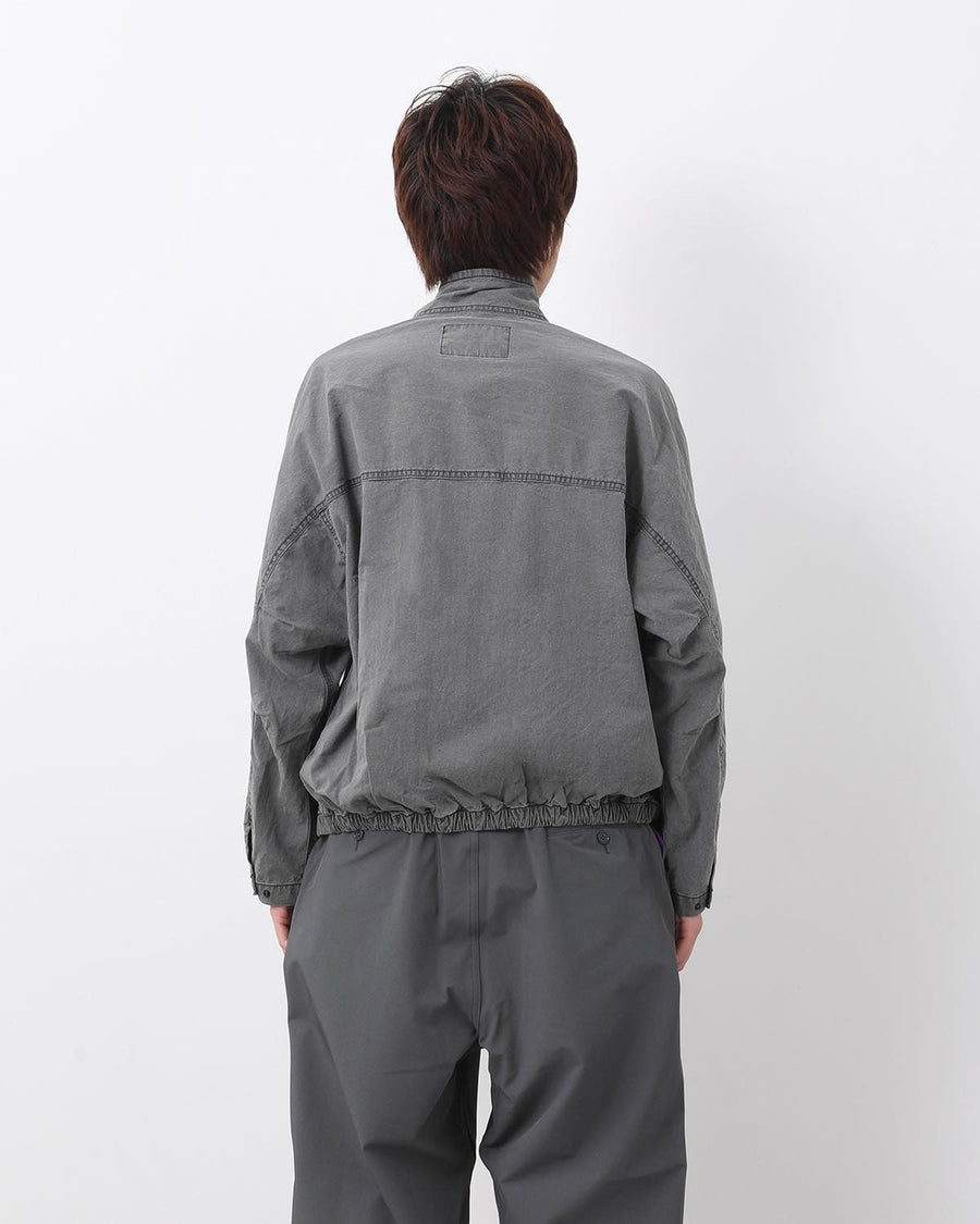 たて糸にネップ糸、よこ糸にリサイクルナイロンを織り上げたコットンナイロンインディゴウェザーのトラックジャケットです。