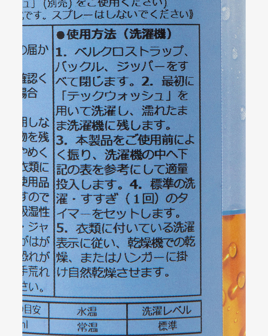 同ブランドの「テックウォッシュ」と合わせて使用することで、一度の処理で数回の洗濯に耐え、効果が持続します。 洗濯後に適量を投下し、洗濯機または手洗いで簡単に撥水処理ができる点も特徴です。