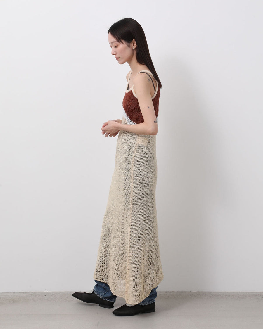 〈NÒMARHYTHM TEXTILE〉を象徴するオリジナルの柄模様を、手編みで表現したスリップドレスです。