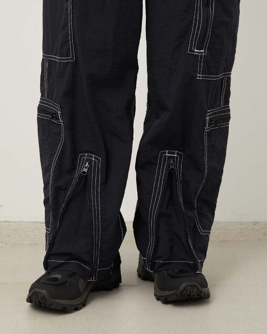 複数のポケットやジップディテールを配した、ミリタリー調のフライトパンツです。