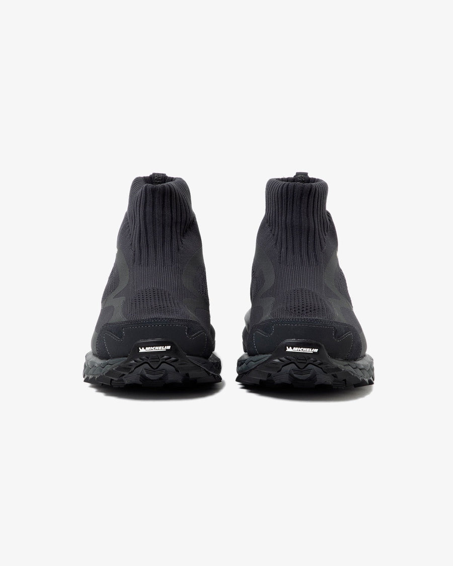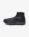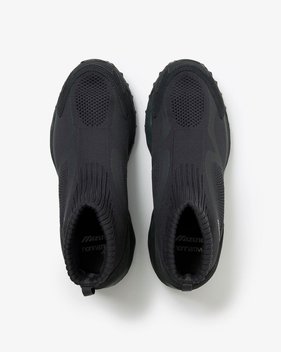 「ミッドカットのブーツシルエットで、GORE-TEX® ファブリクスを搭載した、シューレースのないシューズ」のコンセプトのもと、「MIZUNO WAVE MUJIN TL GTX 」をベースに〈nonnative〉のスタイルにフィットするようにアレンジされています。