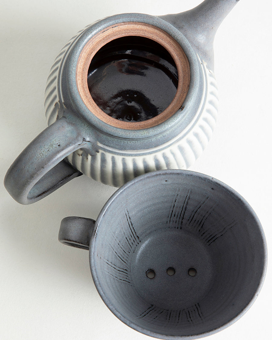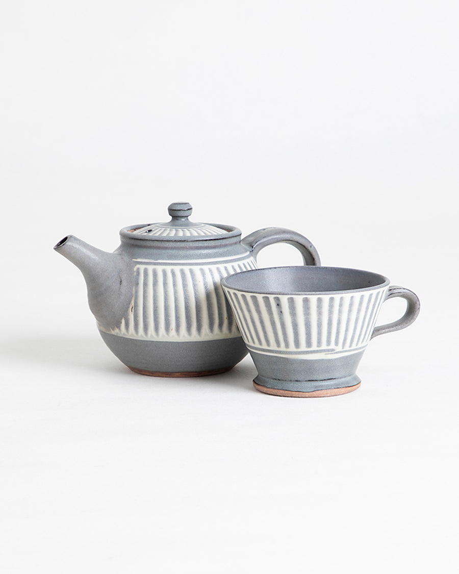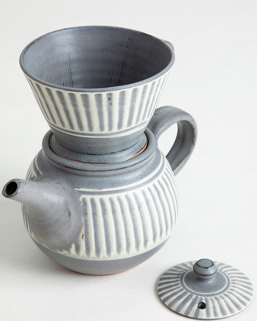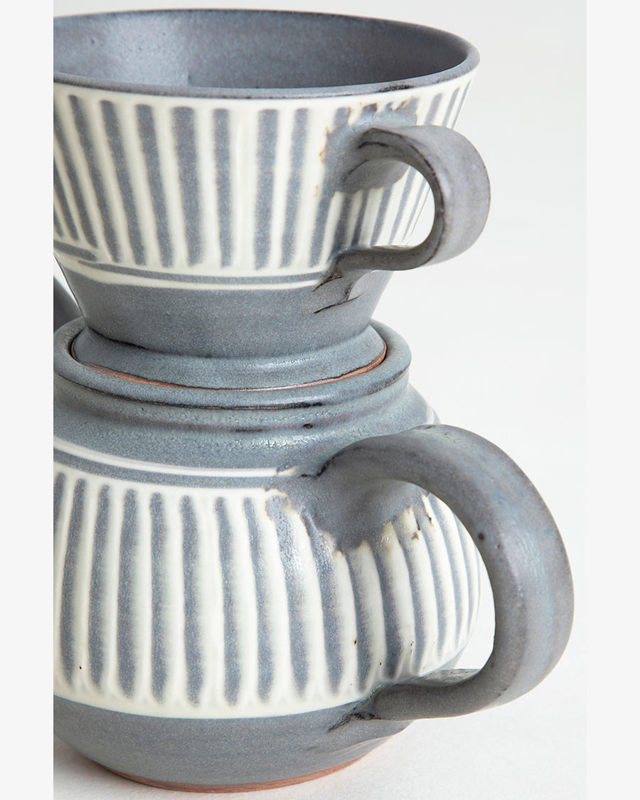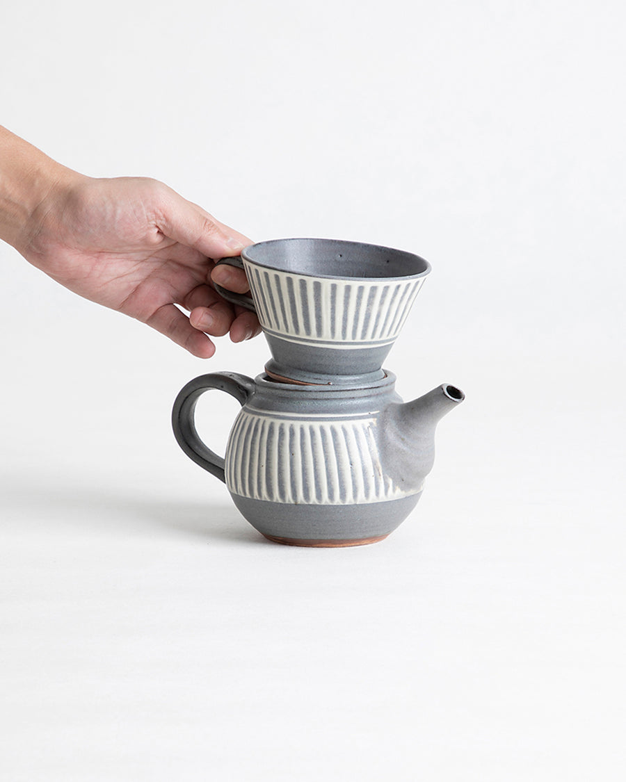 熟練の技術により等間隔に並んだ釉薬の色付けが特徴の〈鬼丸豊喜窯〉のコーヒードリッパーセットです。市販のペーパーフィルタをセットしてお使いいただけます。