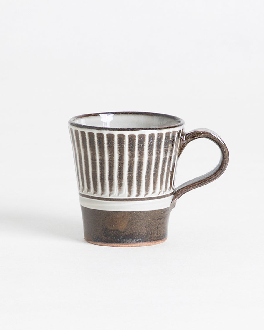 熟練の技術により等間隔に並んだ釉薬の色付けが特徴の〈鬼丸豊喜窯〉のマグカップです。