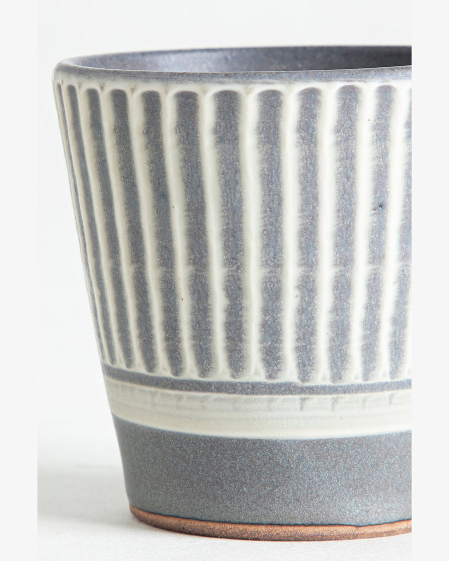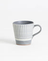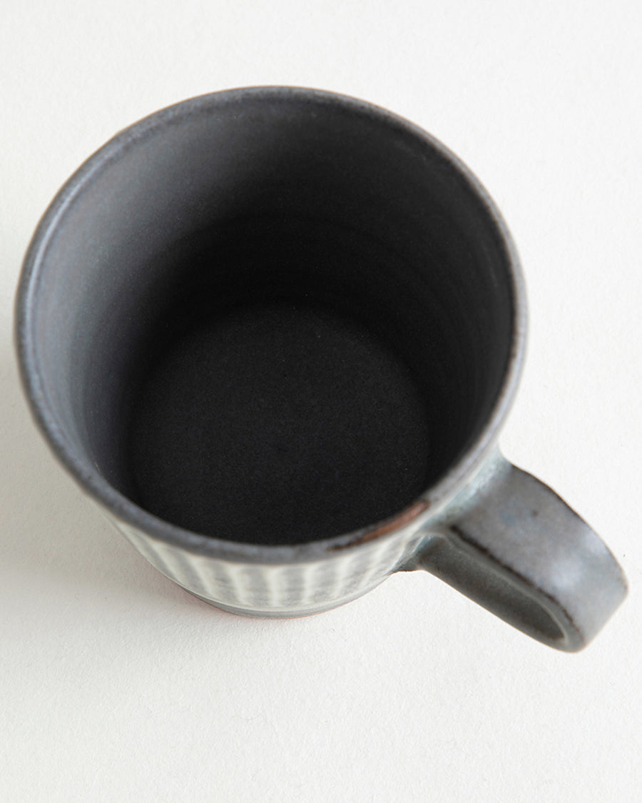 熟練の技術により等間隔に並んだ釉薬の色付けが特徴の〈鬼丸豊喜窯〉のマグカップです。