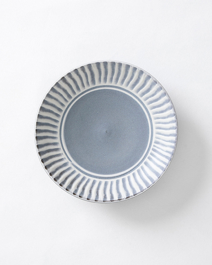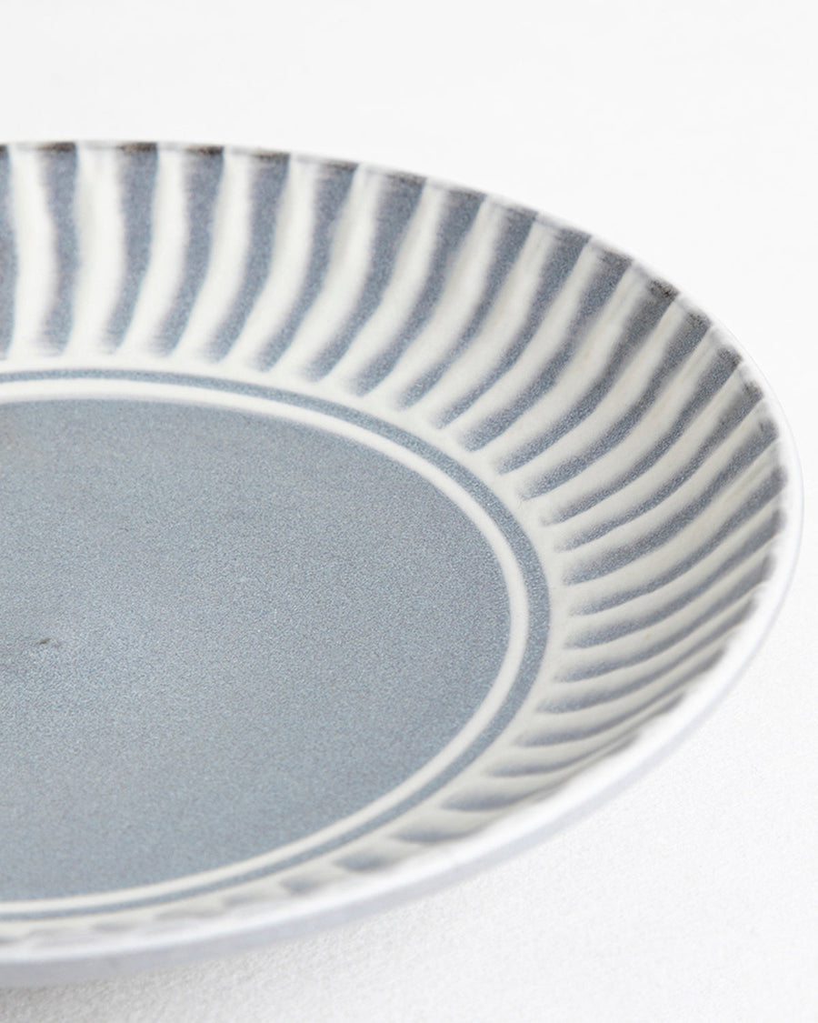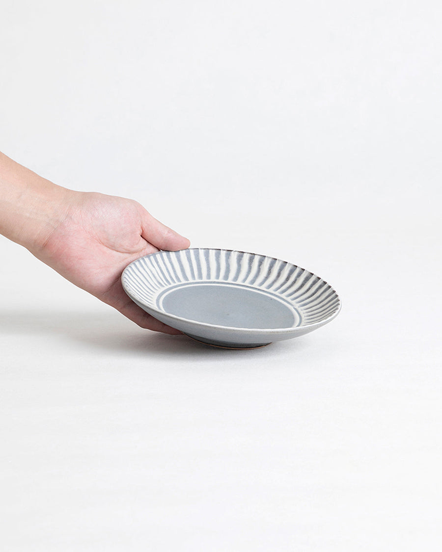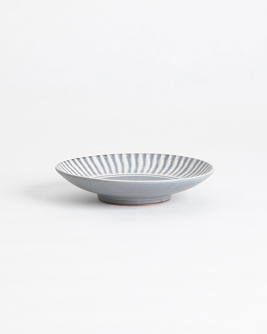 熟練の技術により等間隔に並んだ釉薬の色付けが特徴の〈鬼丸豊喜窯〉の中皿です。