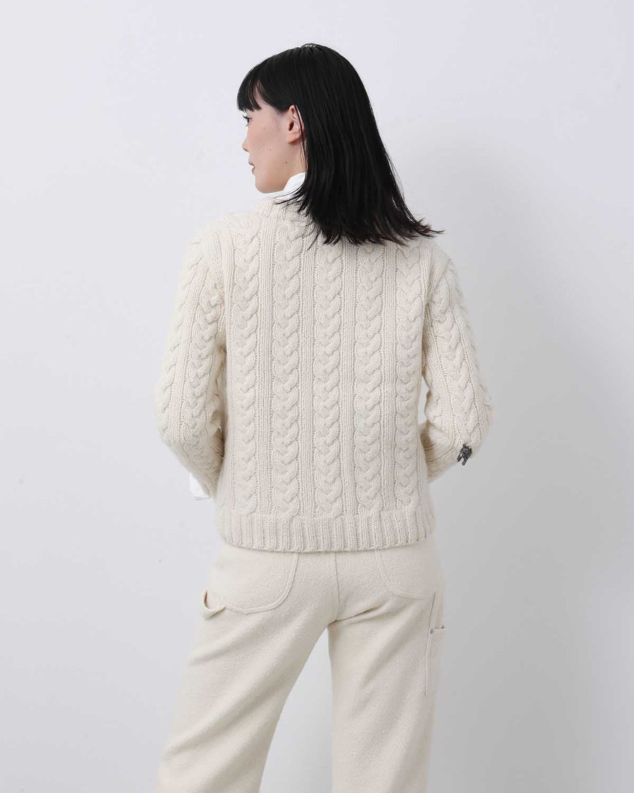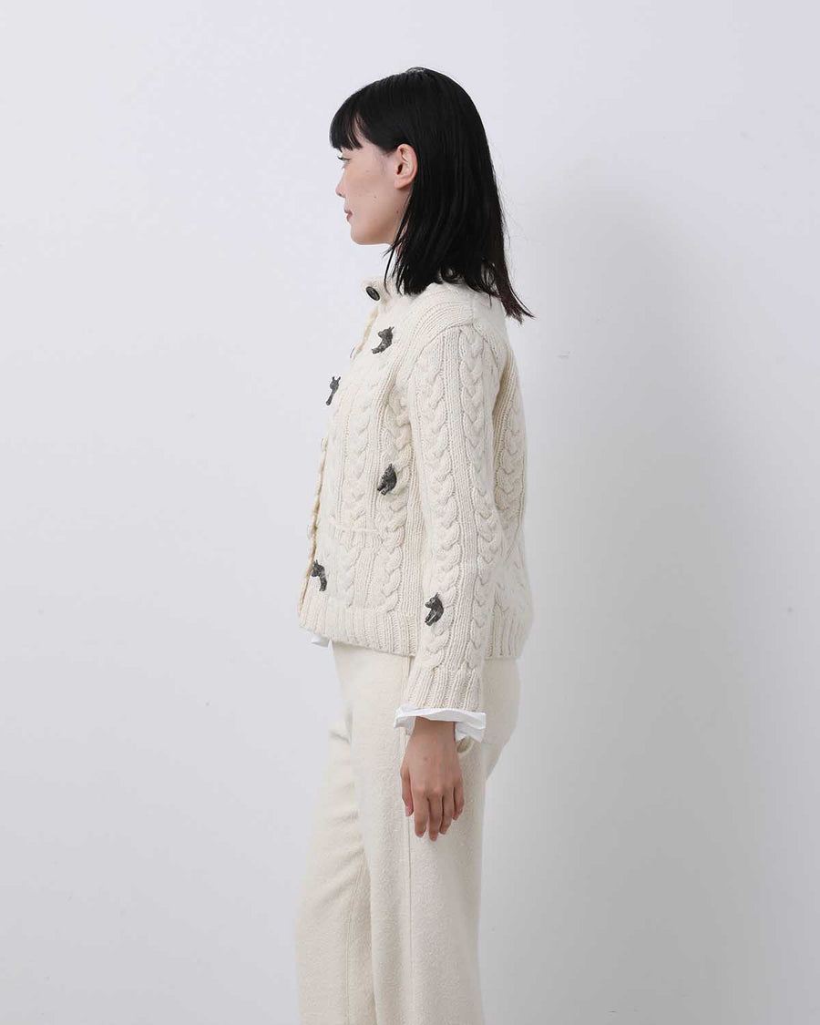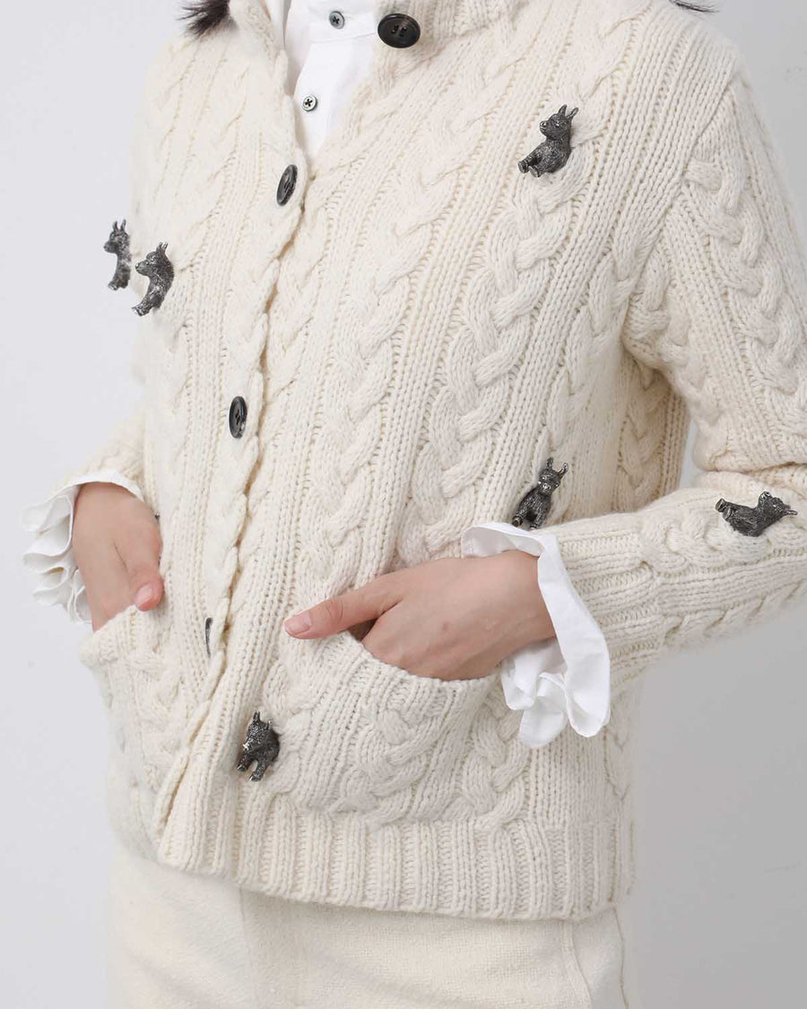 金属素材のロバモチーフのチャームを編み込んだ、ケーブルカーディガンです。