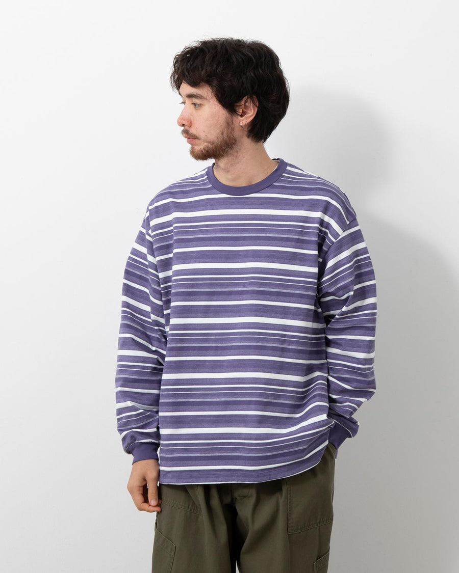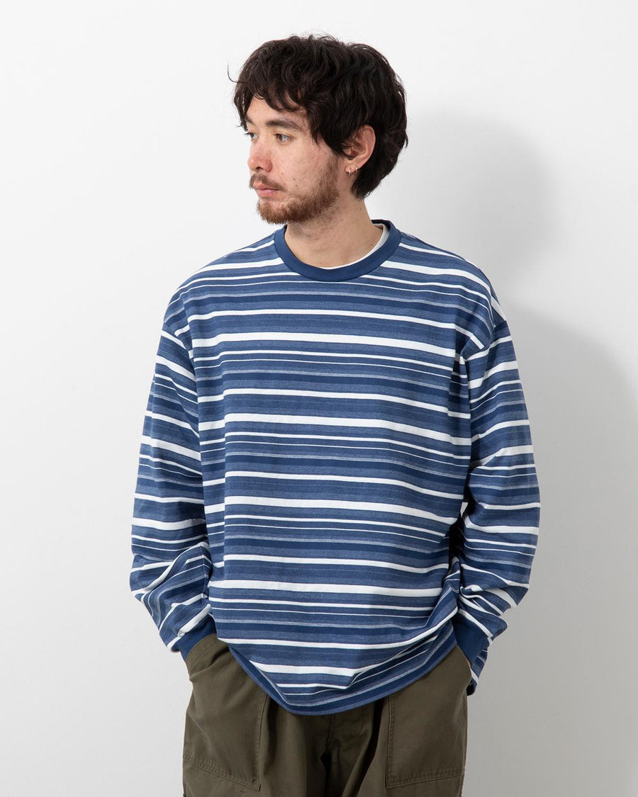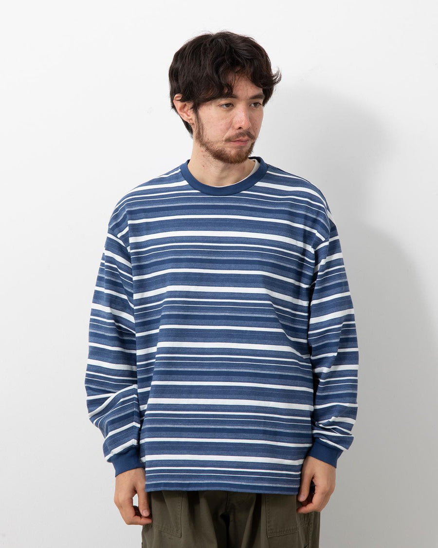 製品染めでマルチボーダー柄を表現したオリジナル天竺素材を採用した、ストレートでボックスライクなシルエットのロングスリーブTシャツです。