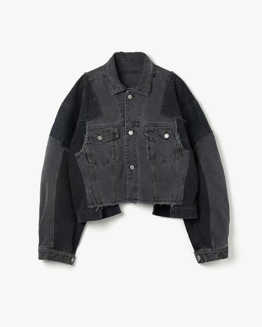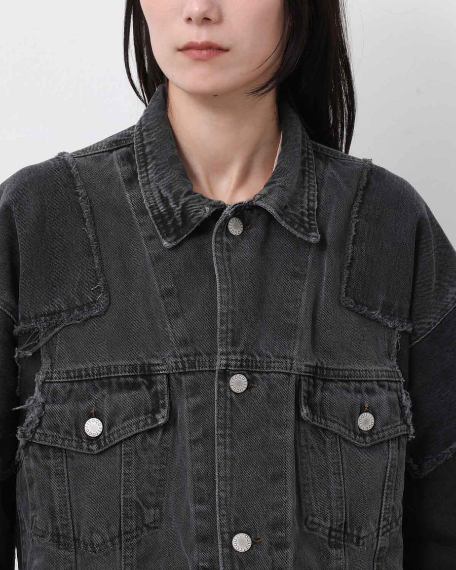 リメイク縫製後にブラックのピグメント染めとバイオウォッシュ加工を施し、古着本来の色差をわずかに残した、奥行きのあるDARK GRAYに仕上げたデニムジャケットです。