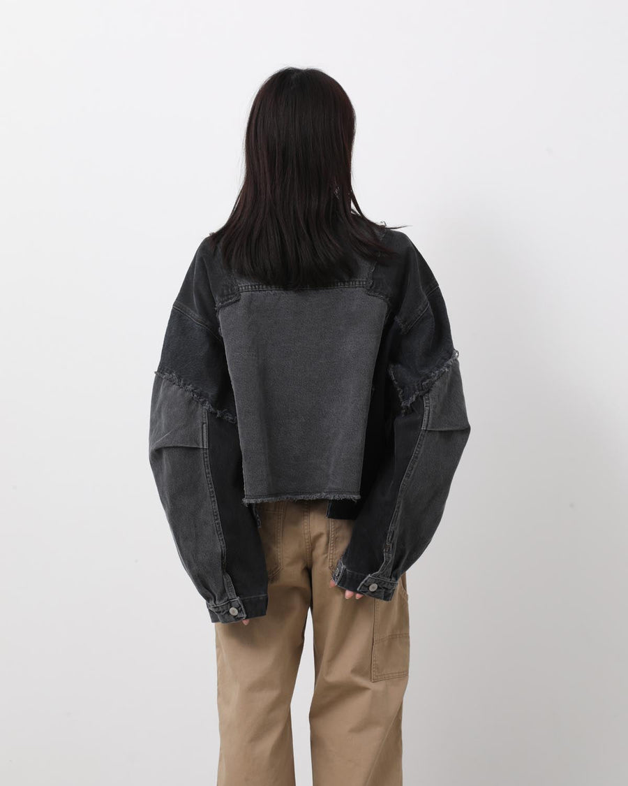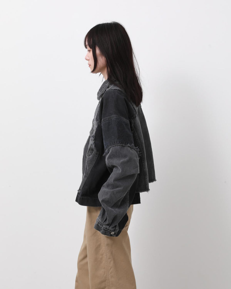 袖や身頃のバランスや、サイズ感が原因で古着卸倉庫で売れなかったGジャンを肩で切り落とし、袖とシルエットを変えながらリメイクしました。