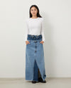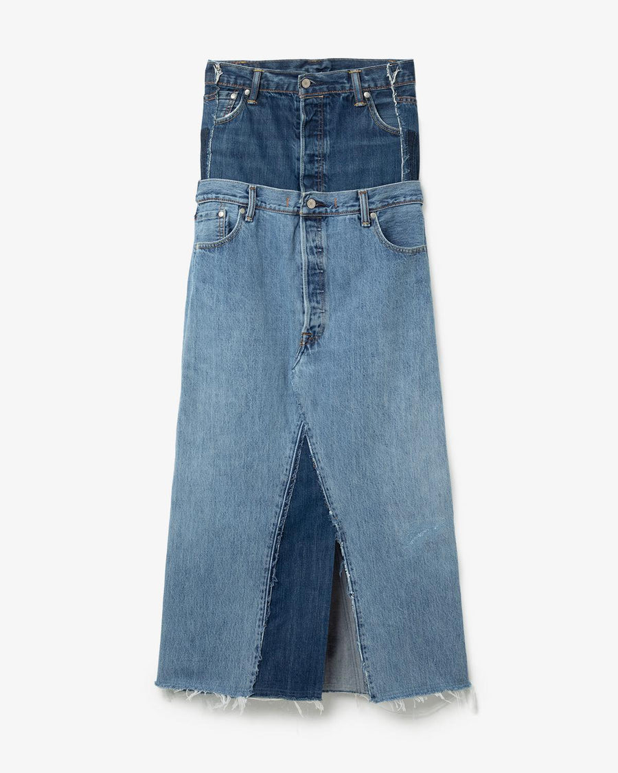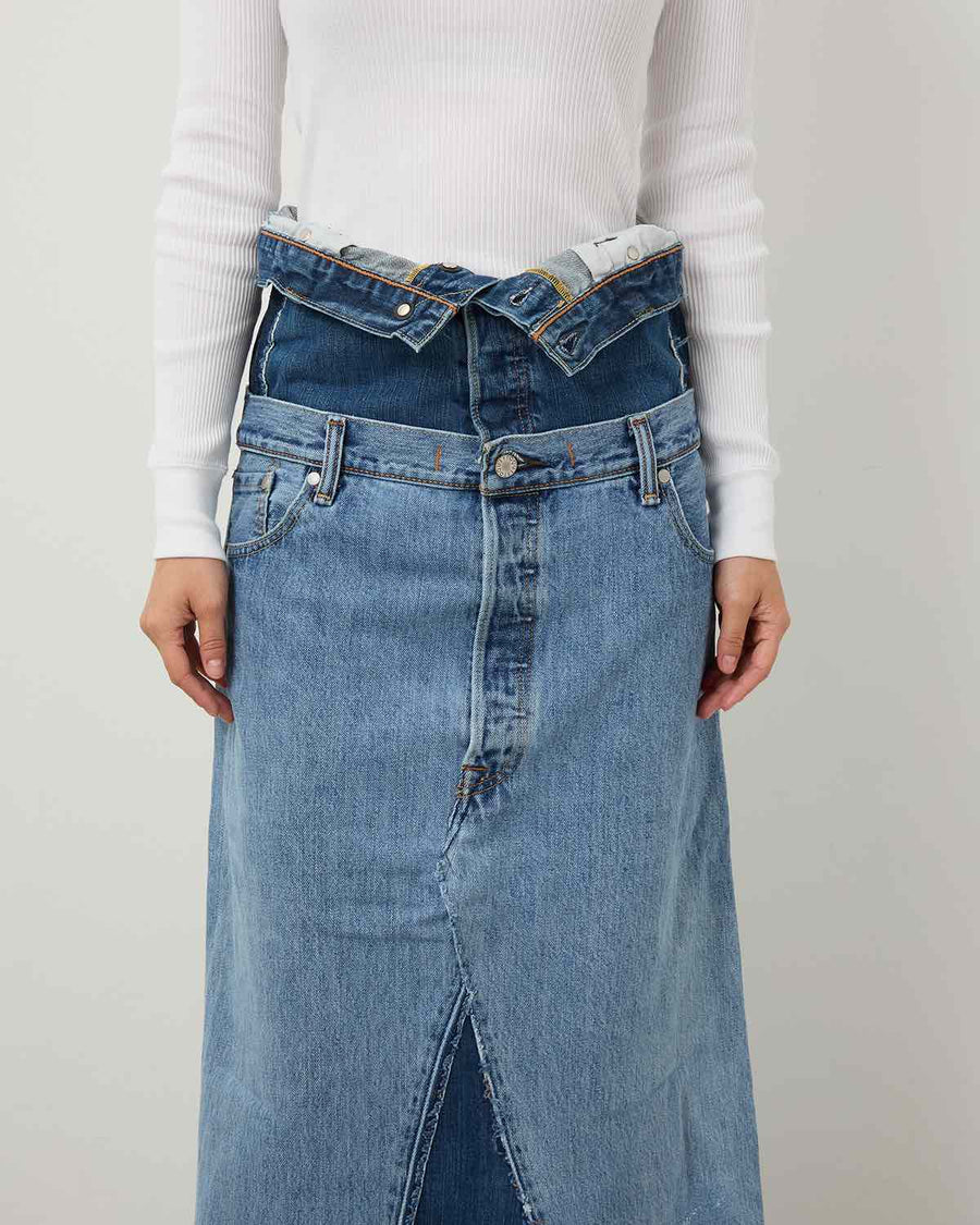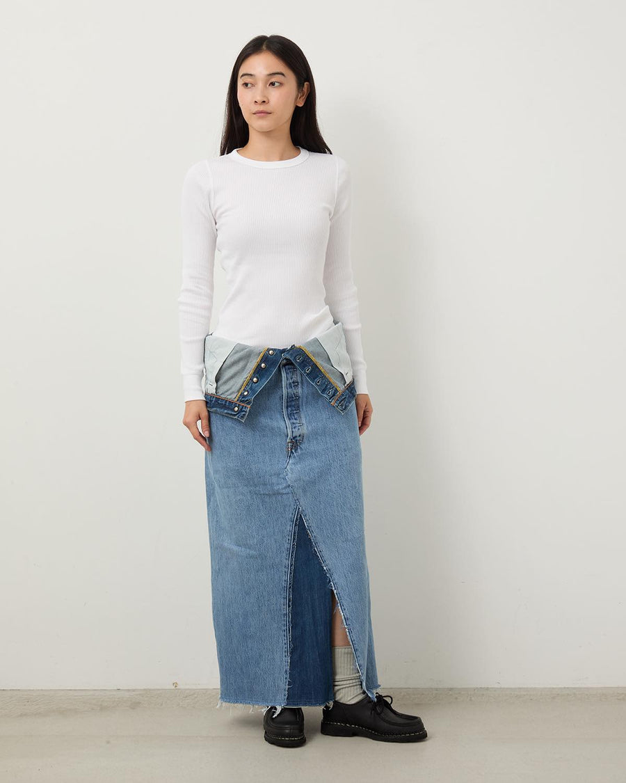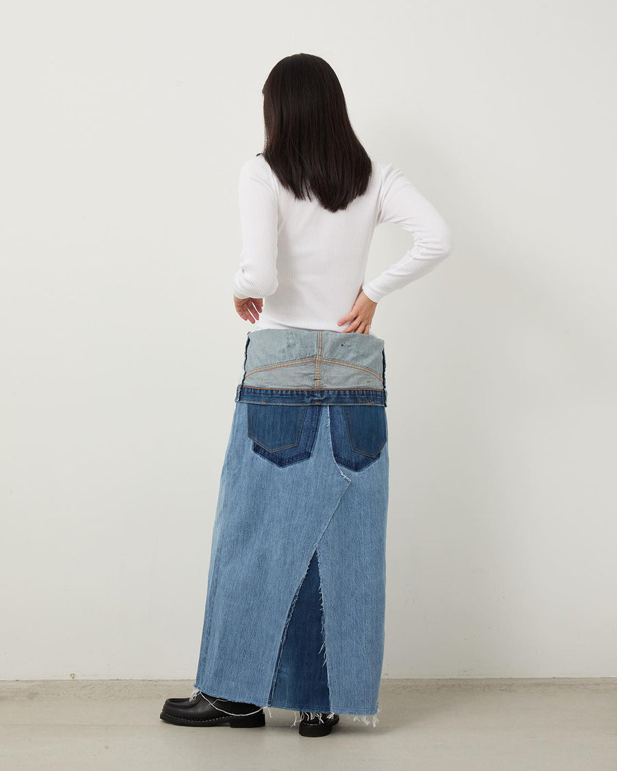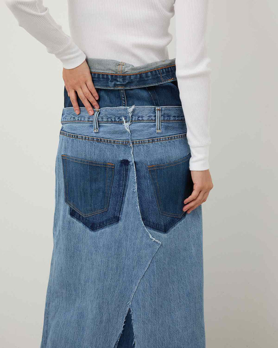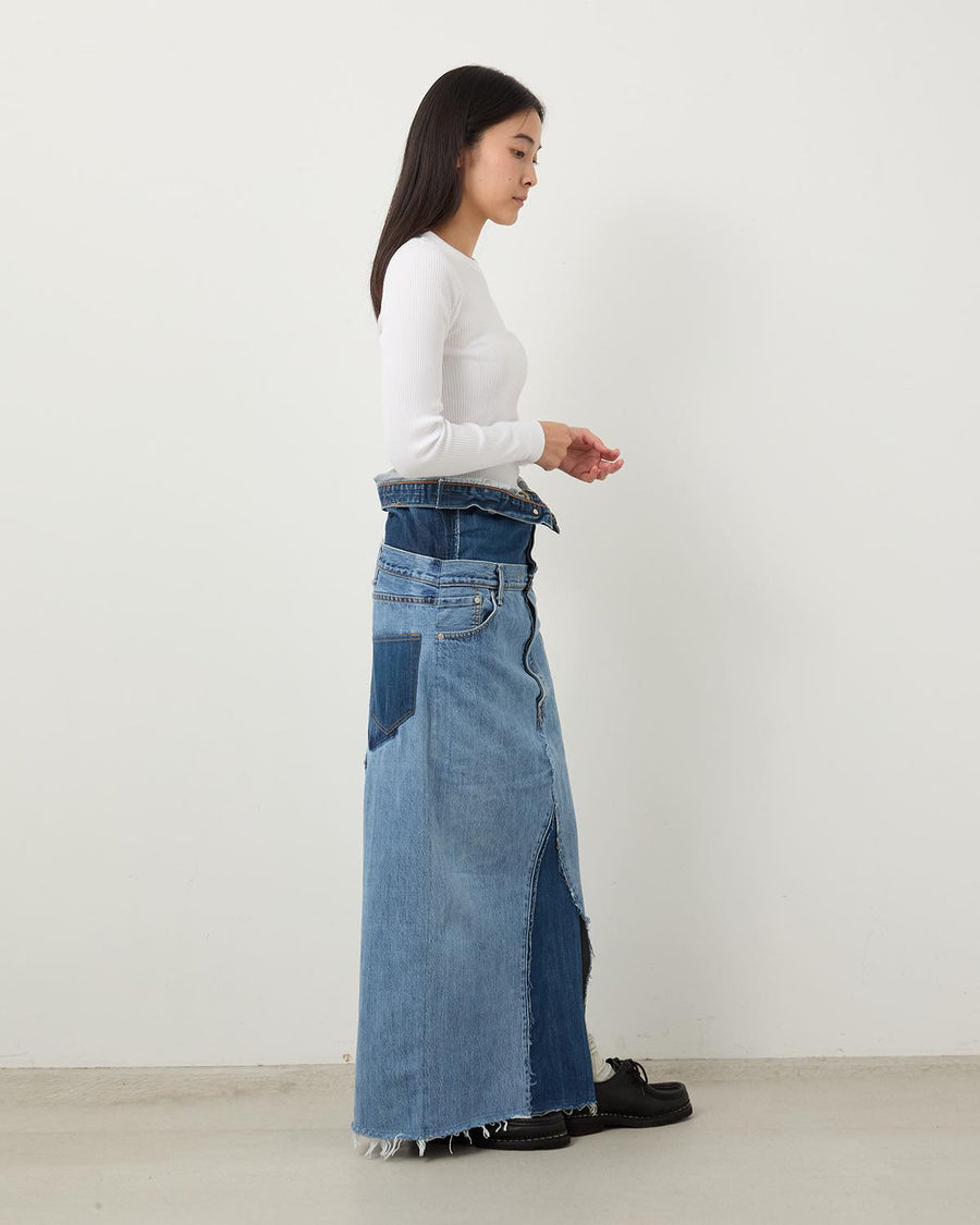 〈QUIITO〉定番のダブルウエスト仕様のデニムパンツを、アイラインスカートへと再構築したコラボレーションならでのはデザインが特徴です。