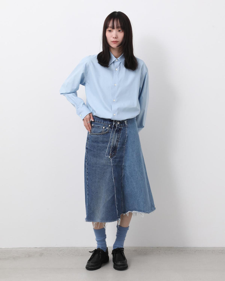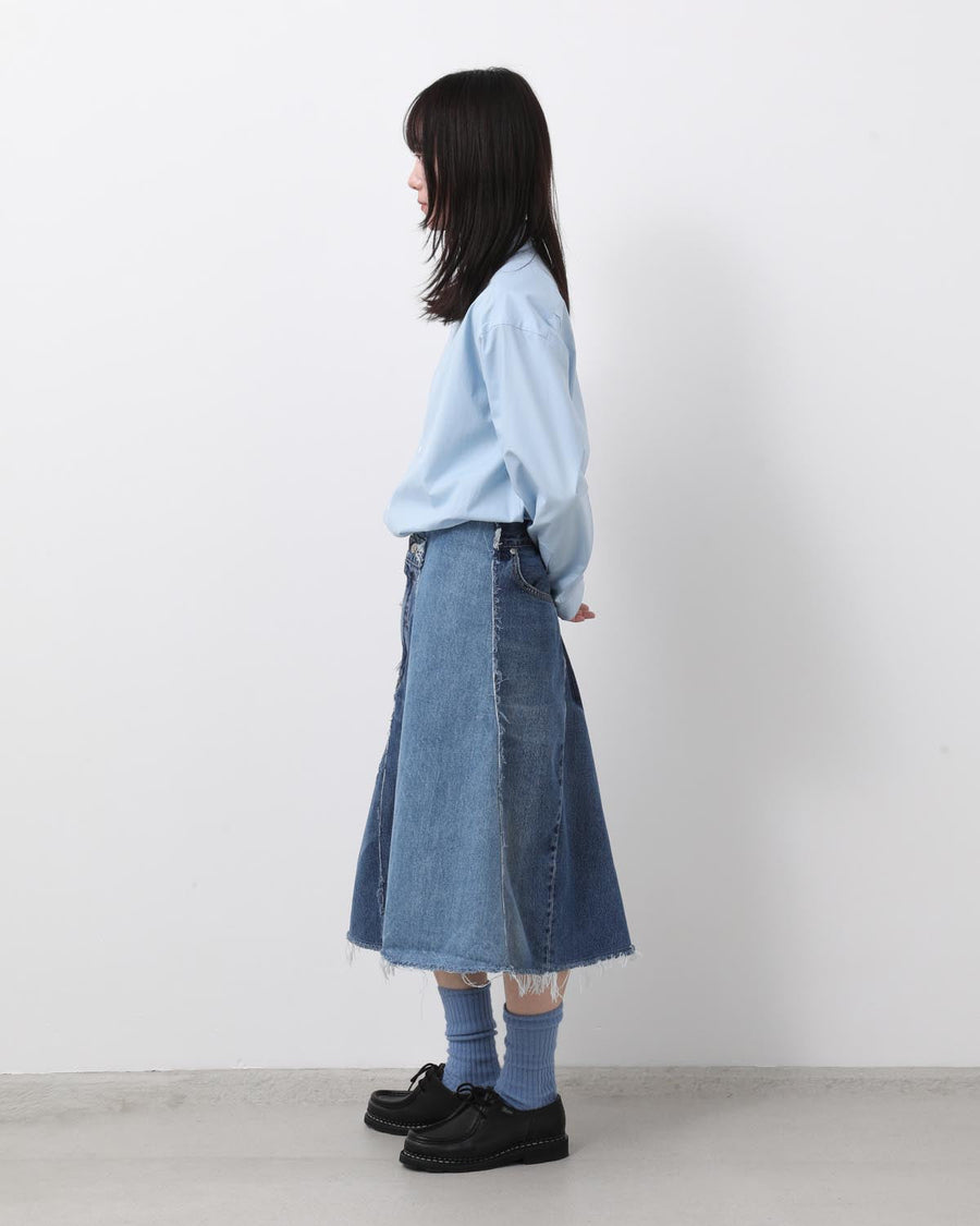古着のデニムパンツを解体して、スカートの形に再構築したミディ丈のスカートです。