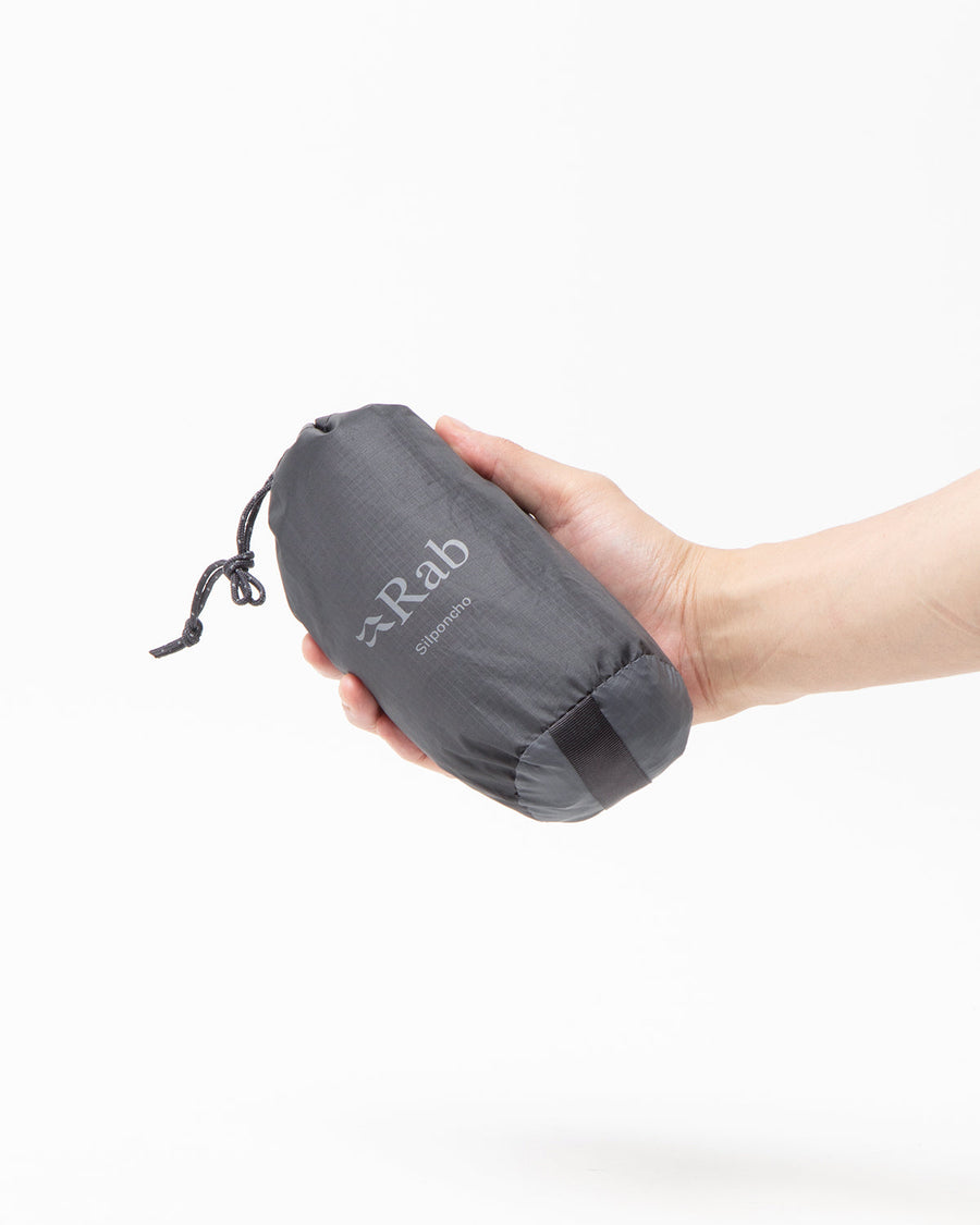 素材には超軽量で丈夫な30Dリップストップナイロンを使用しており、防水仕様ながらかさばらず付属のポーチに収納可能です。