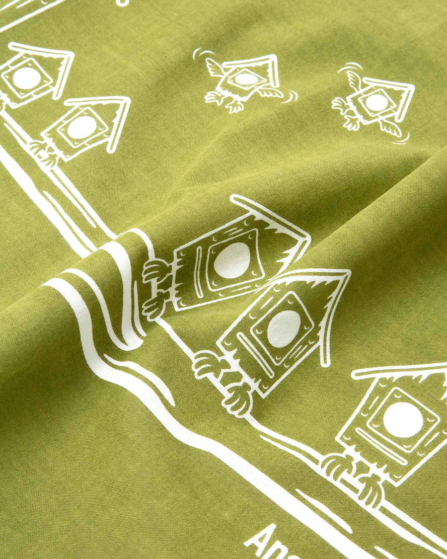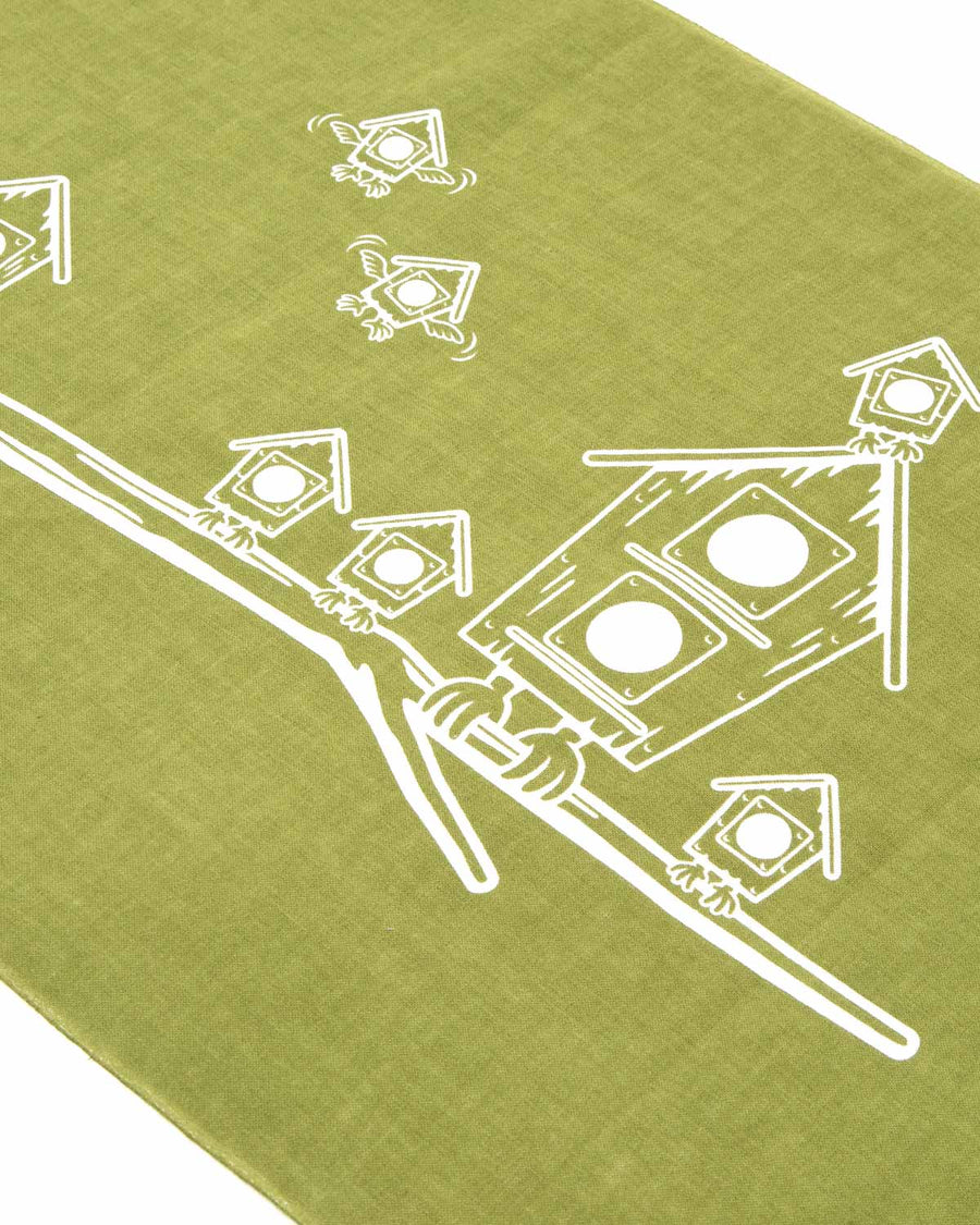〈MOUNTAIN RESEARCH〉オリジナルキャラクターの”小屋鳥”を捺染プリントで表現したデザインです。