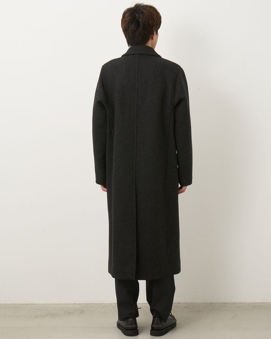 英国羊毛のシェットランドウールをブレンドしたTOP糸を原料に使用し、二重織組織で高密度に織り上げたツイード素材のロングコートです。