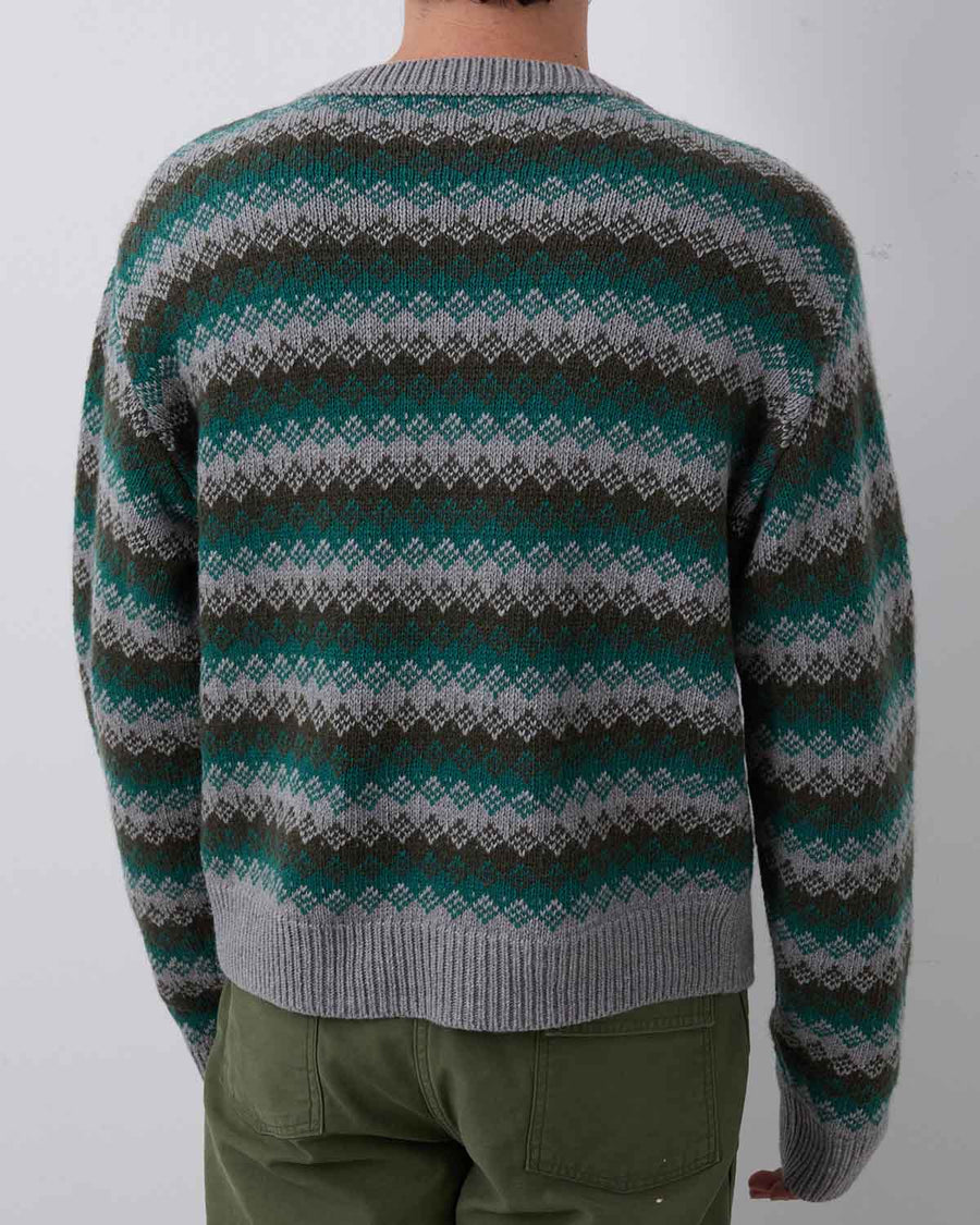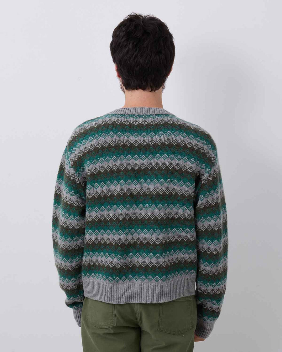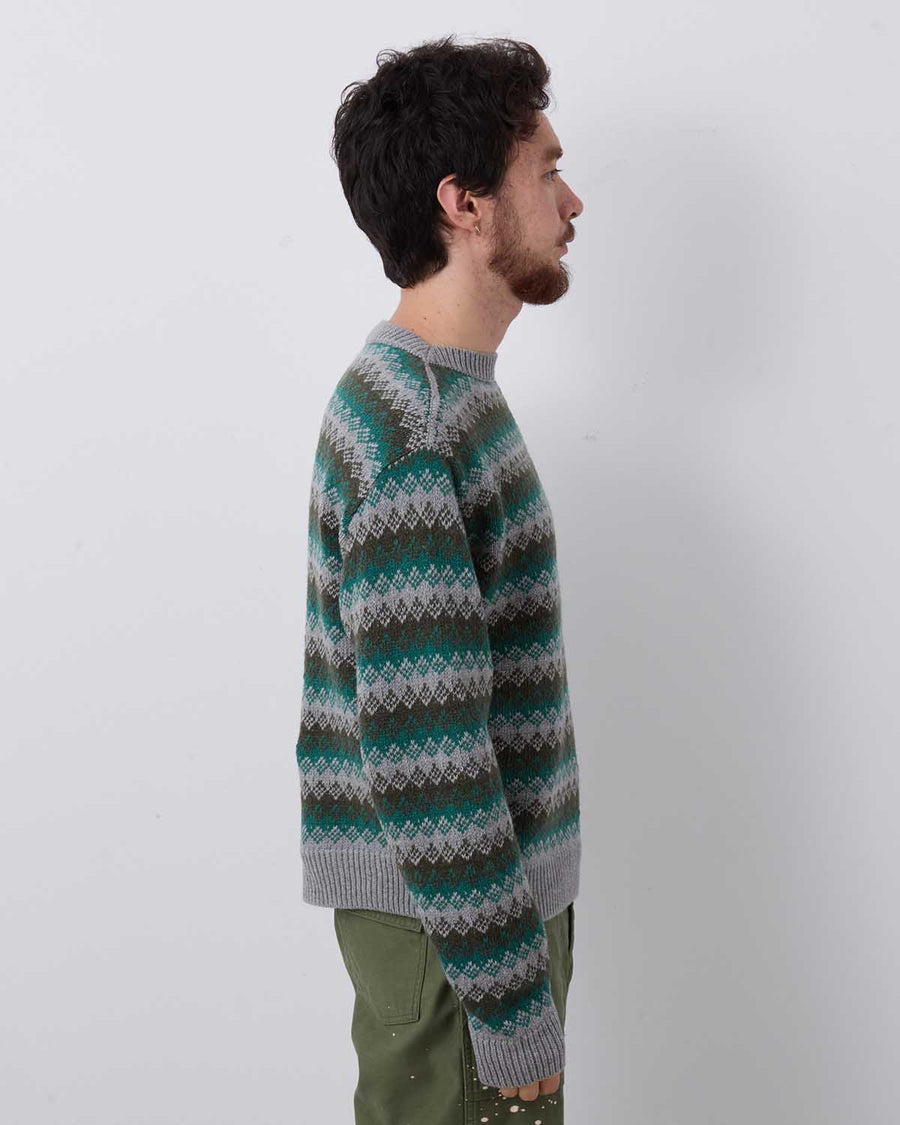 バージンカシミヤと紡績工程で発生するカシミヤの落ち綿をブレンドしたジャカードニットです。