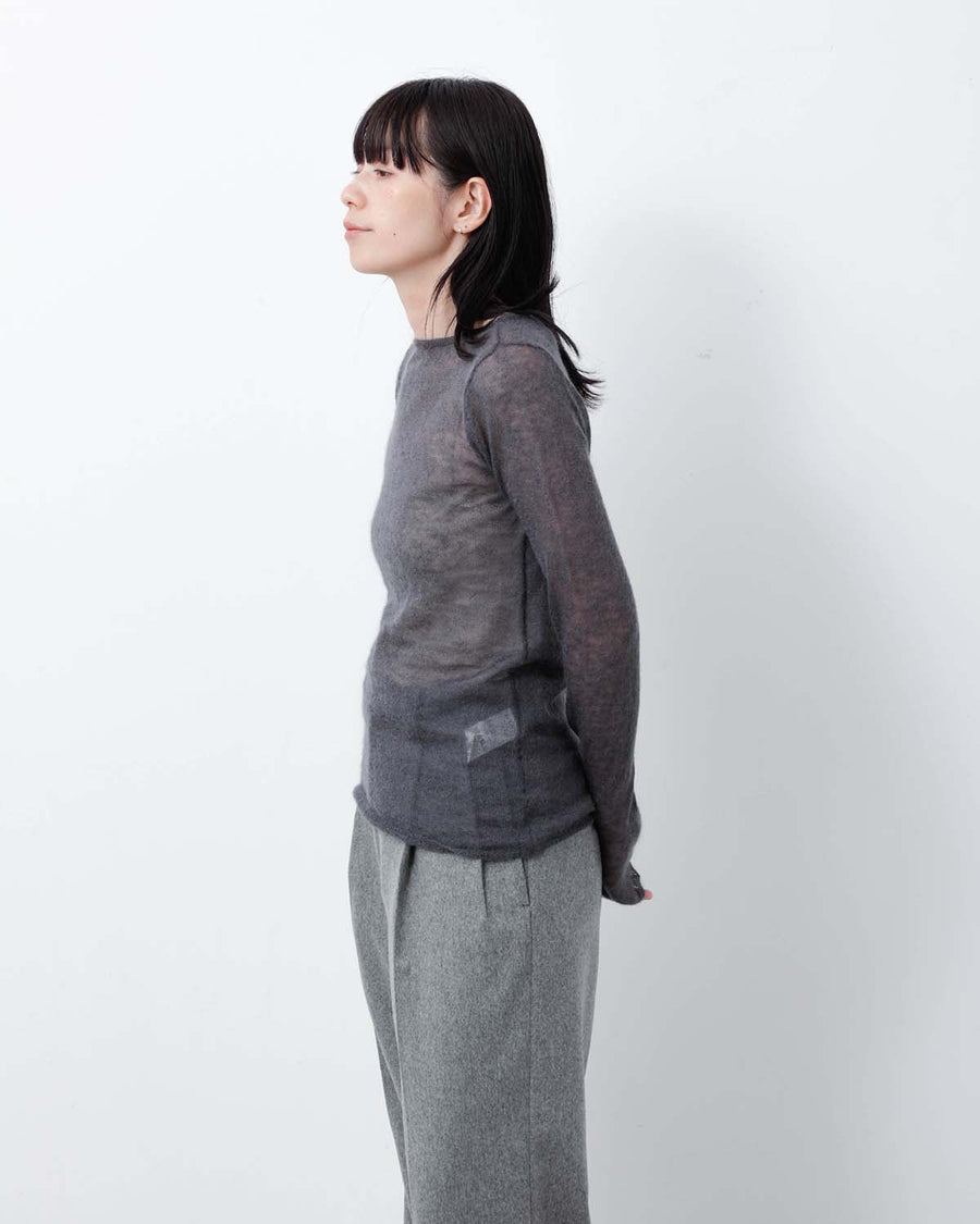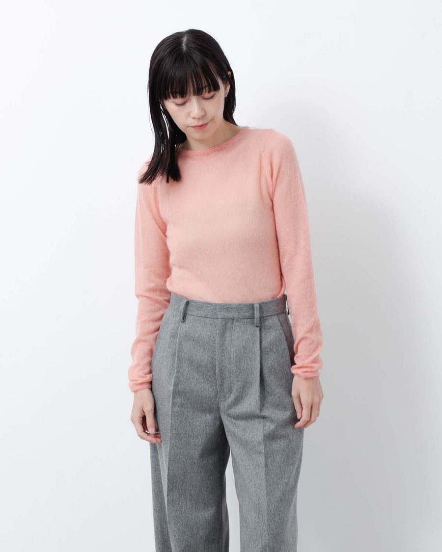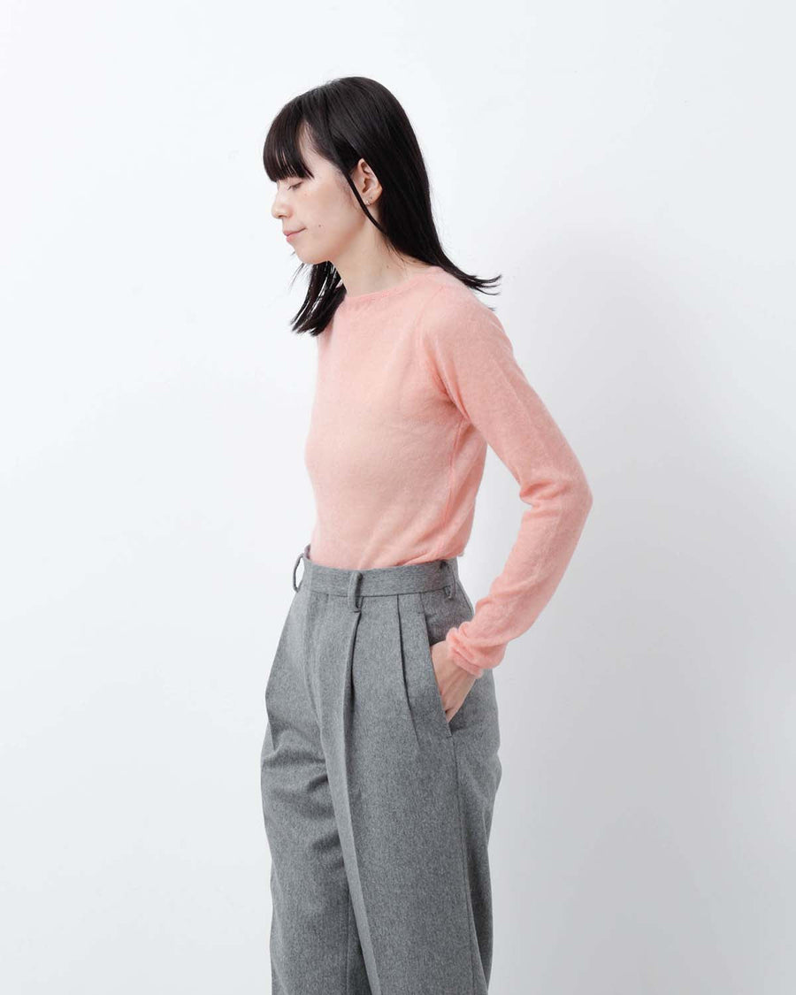 キッドモヘヤの極細糸で編み上げた、上品な透け感のあるボートネックニットです。