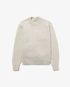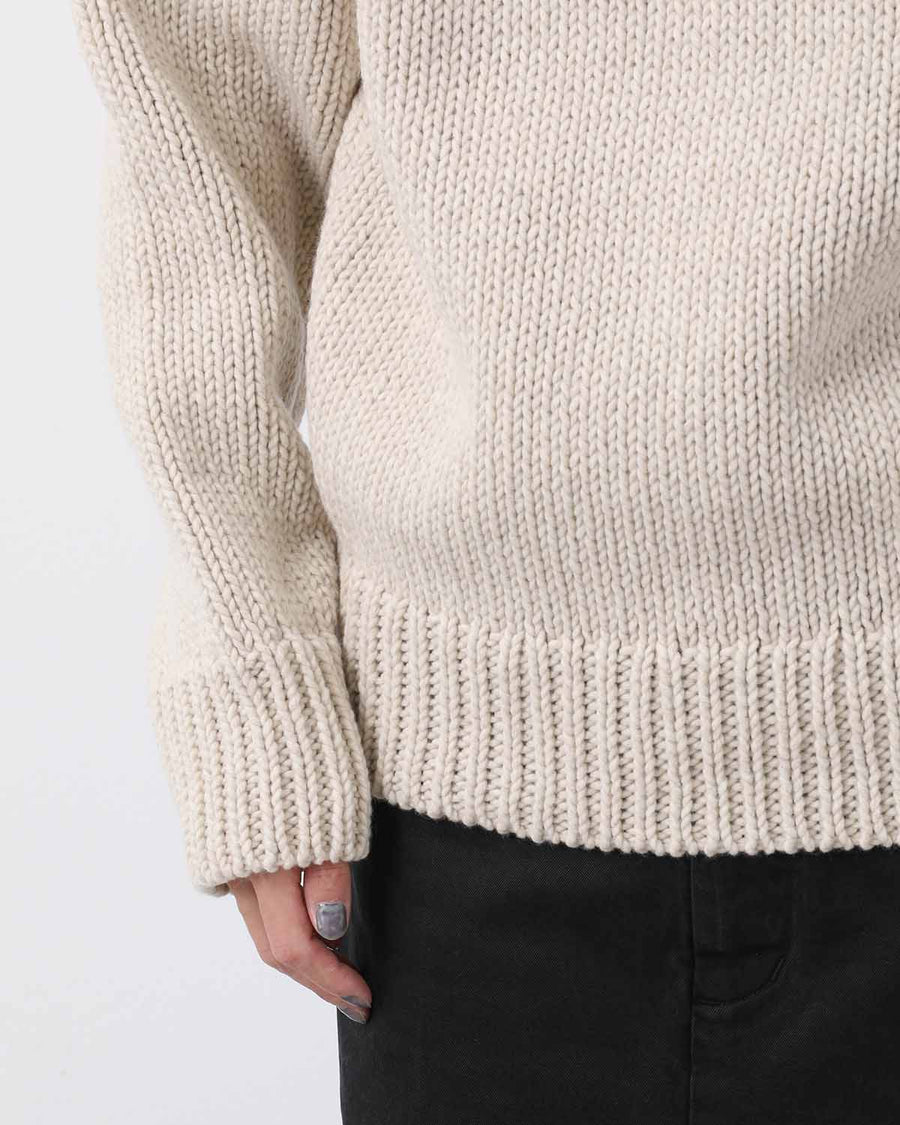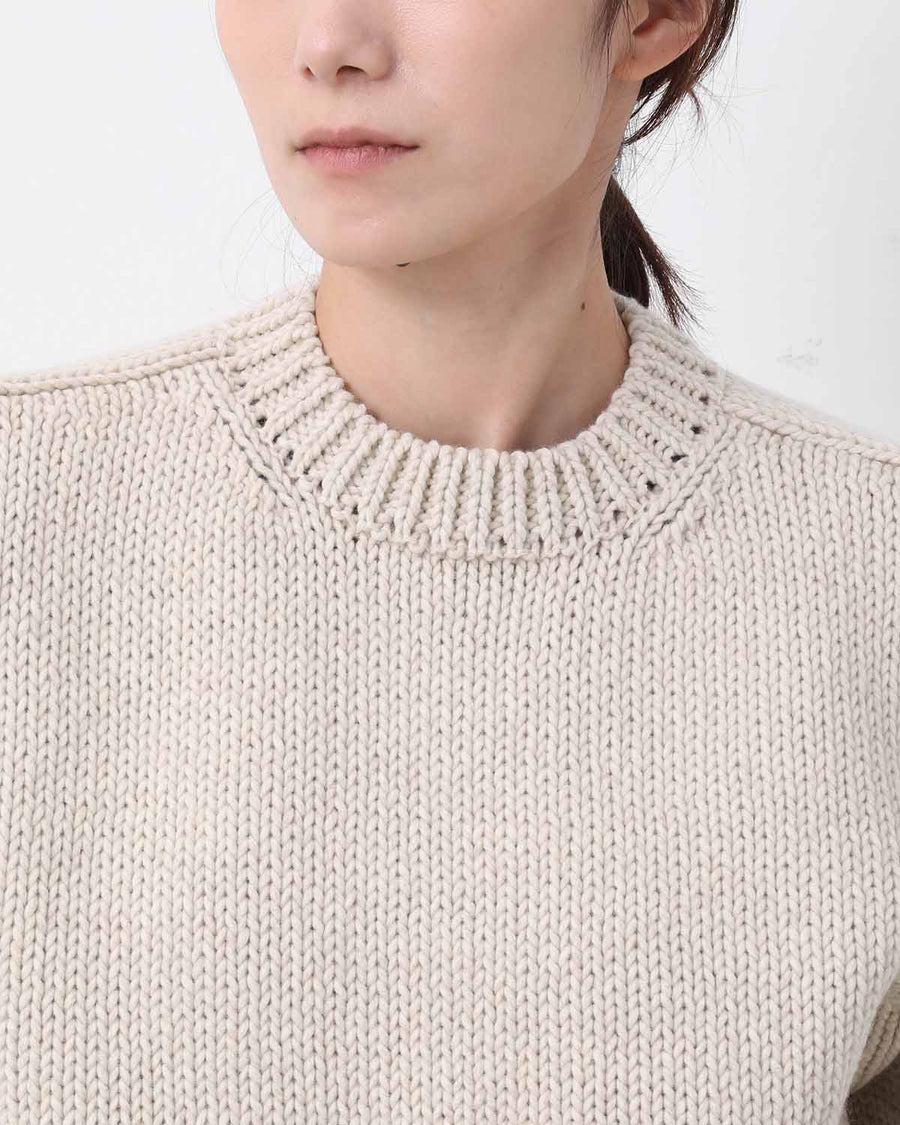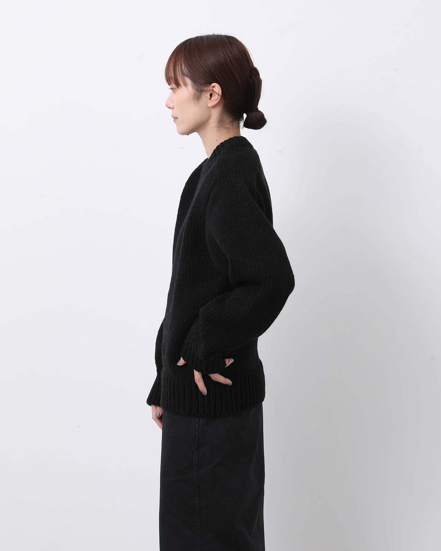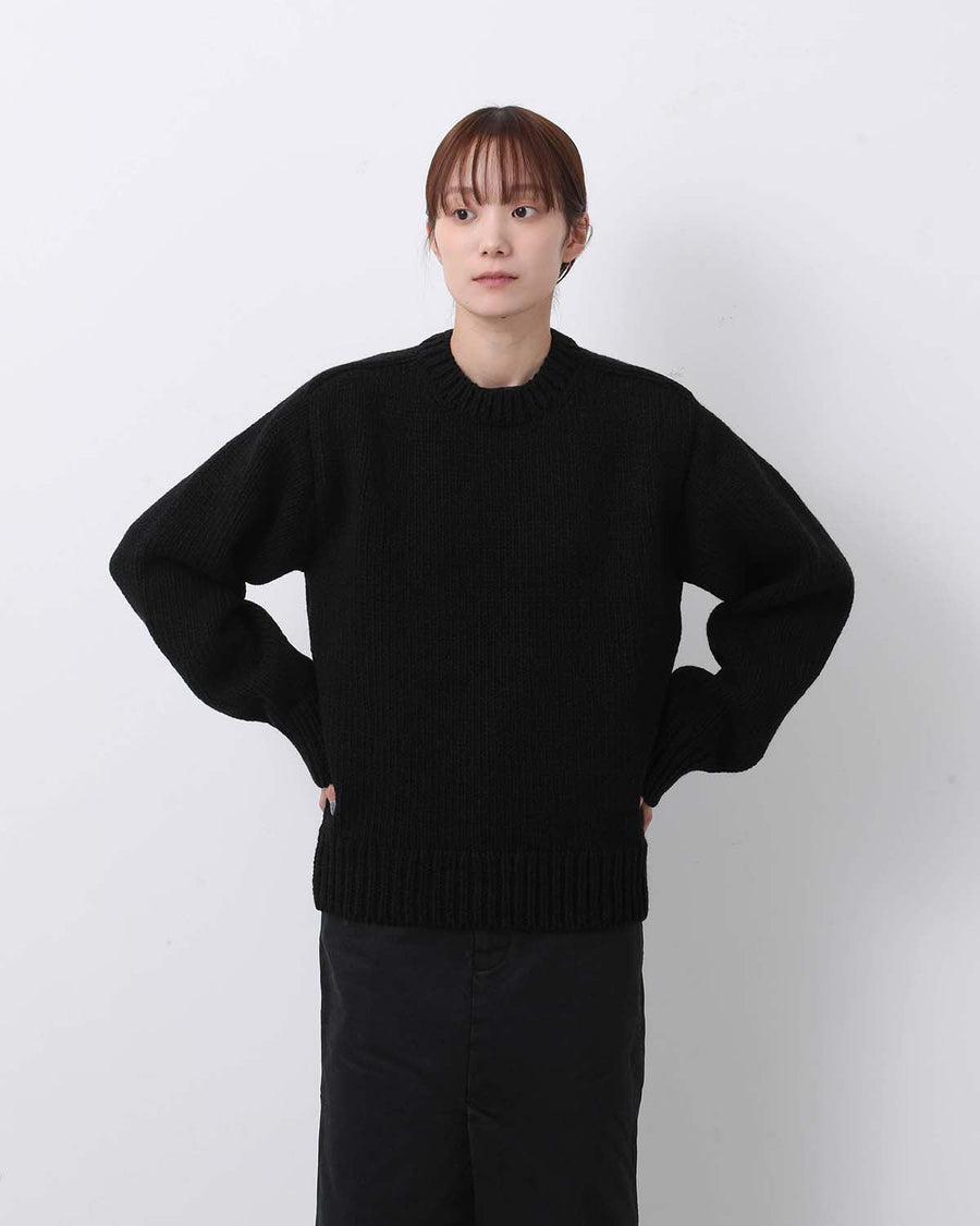 厳選された太番⼿の紡⽑ウールを他本数撚りし、⽷⾃体をフェルト化させ編み⽴てたローゲージニットです。