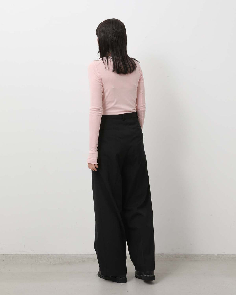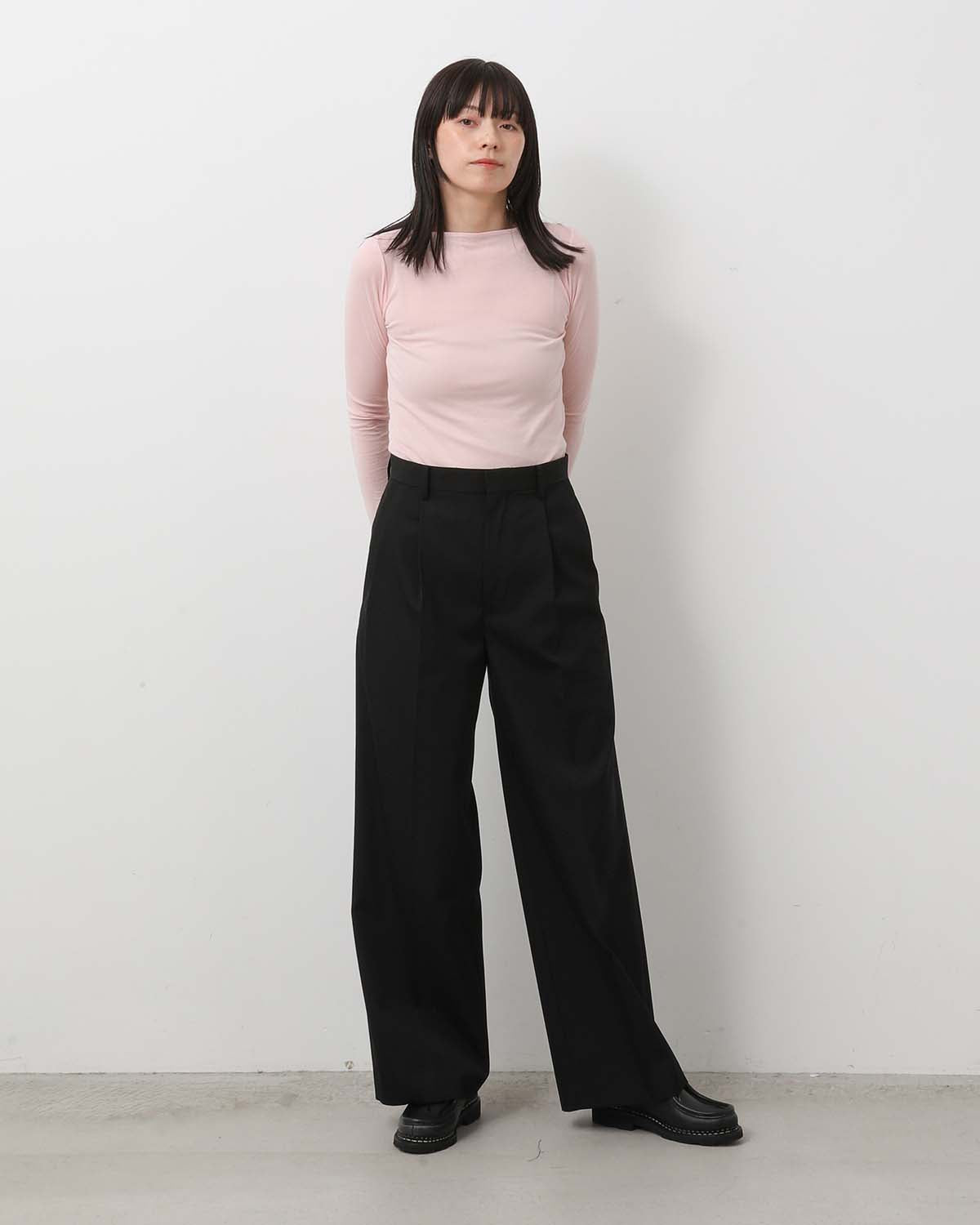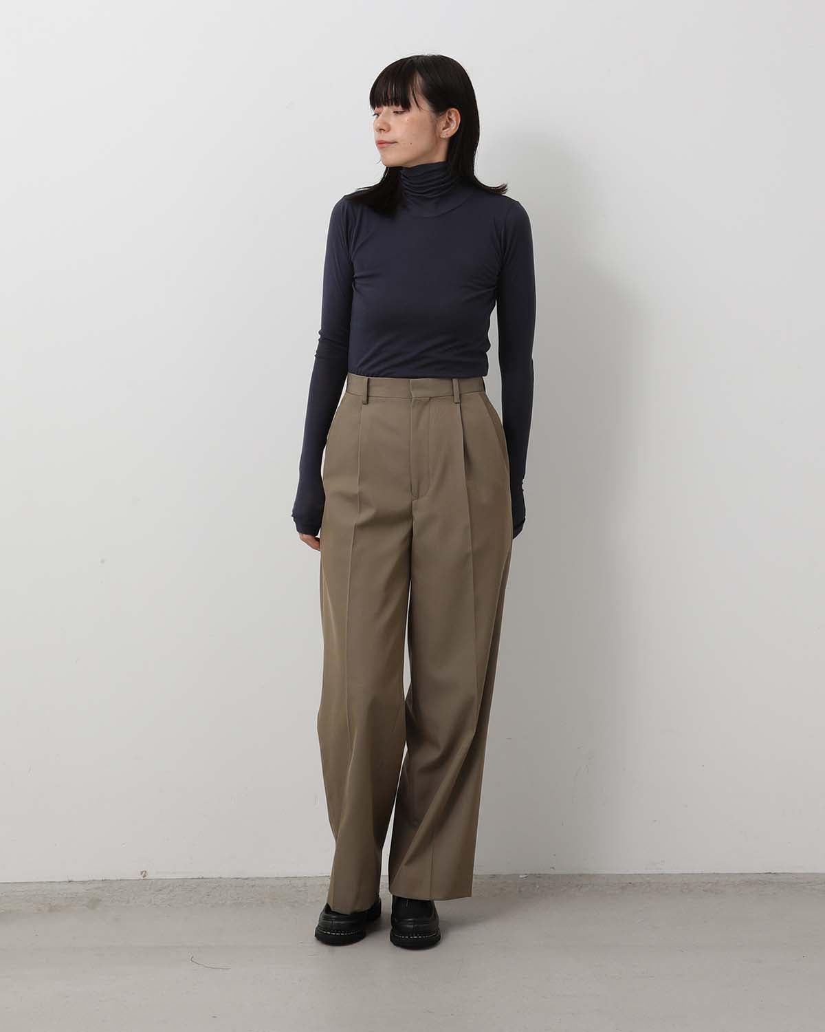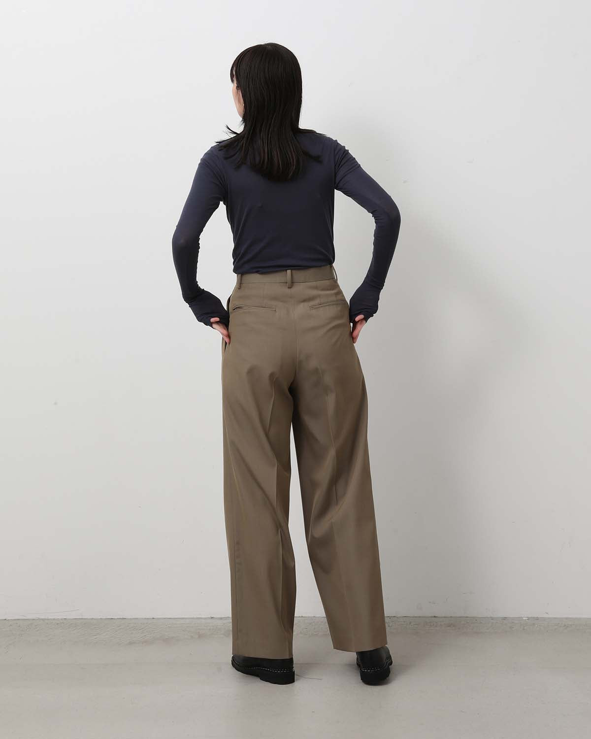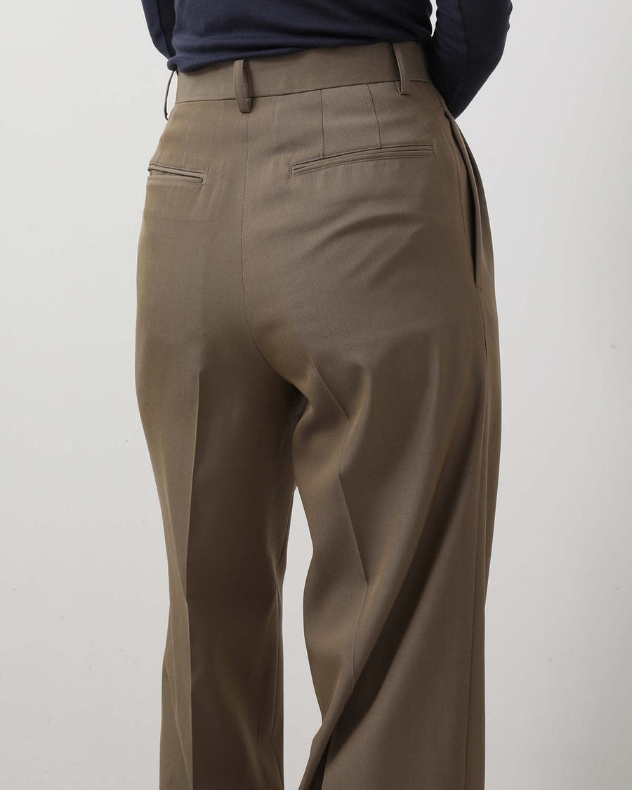 ウールの伸縮性を活かしてハリコシを最も強く出す加工と撥水加工を施し、シワになりにくく、落ち感と程よい光沢に仕上げています。
