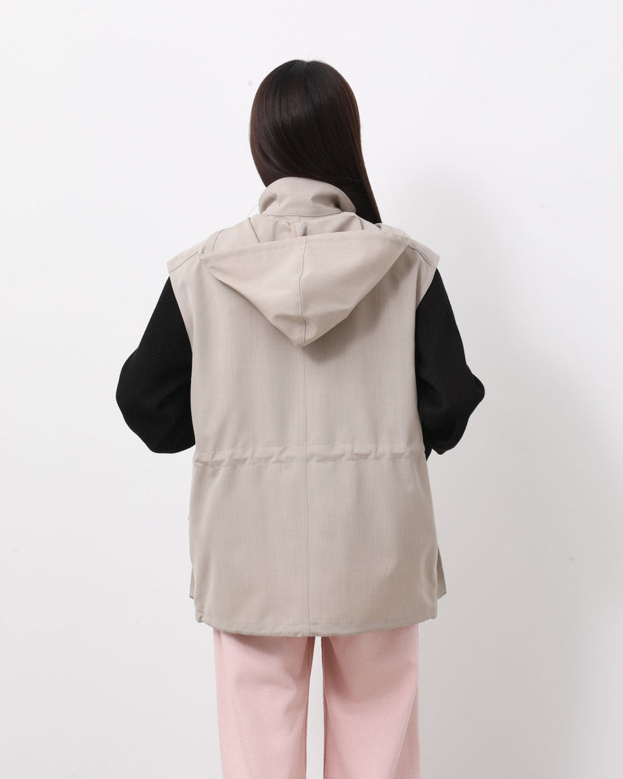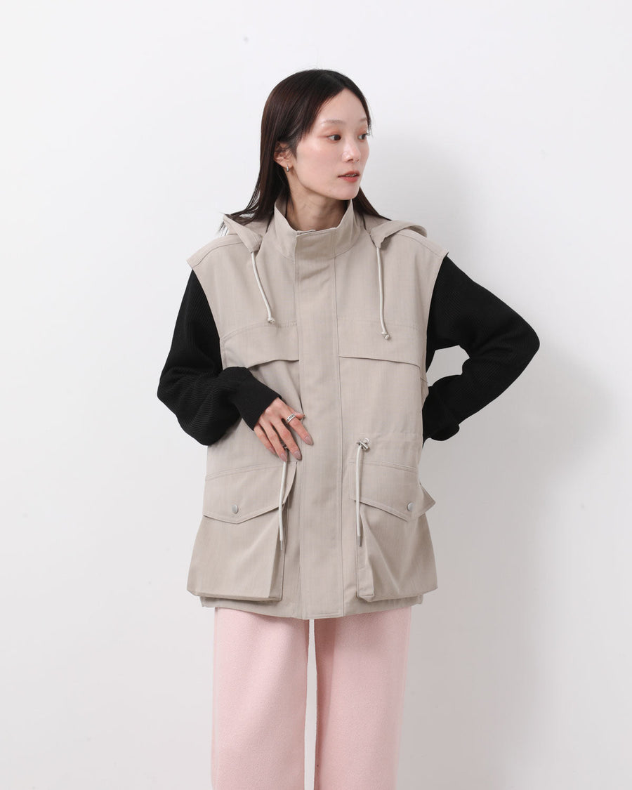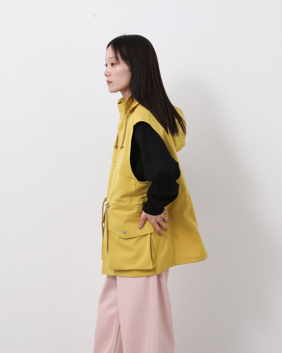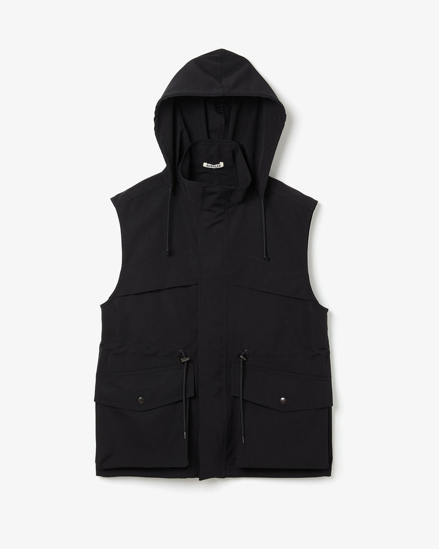Super120’sの極細原料を使用し、限界まで高密度に織り上げたウールキャンバス素材を採用したフーデッドベストです。