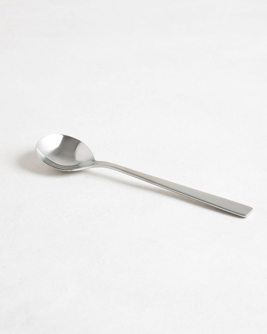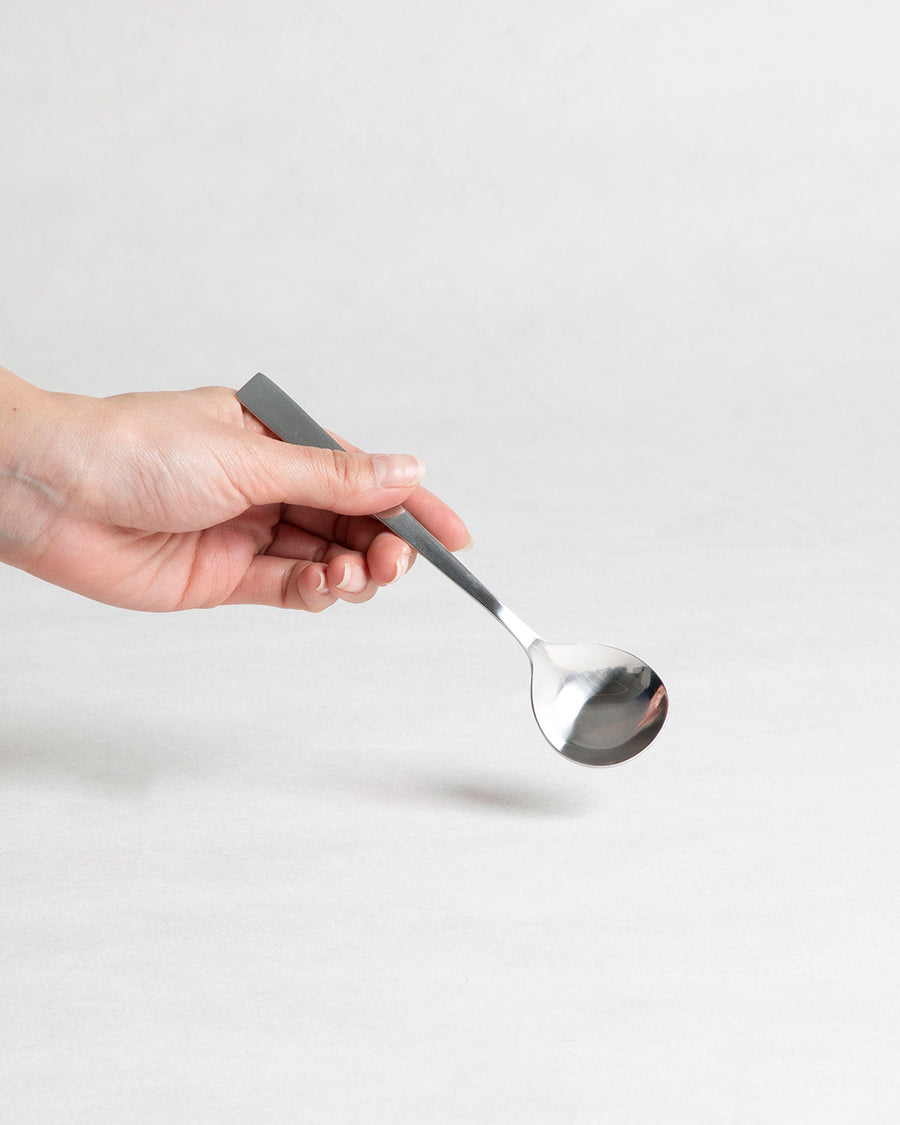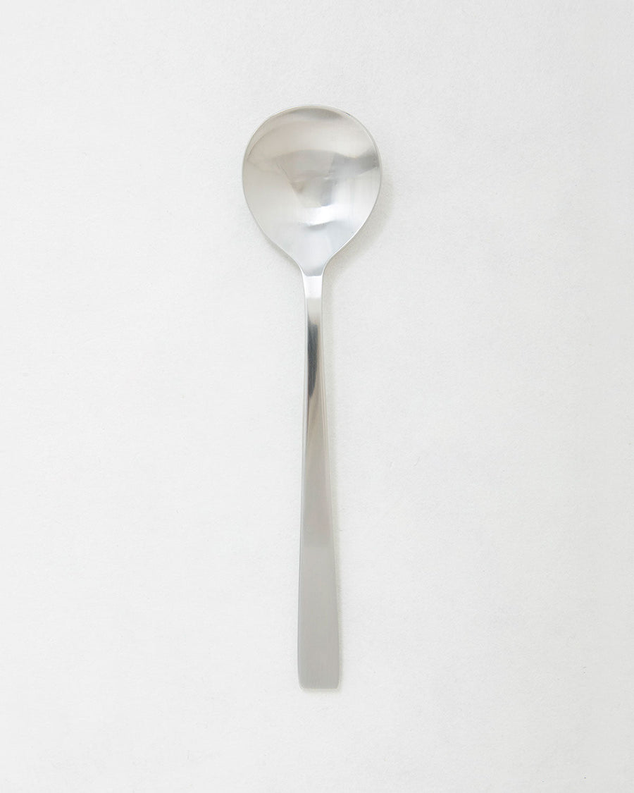 日本の食卓に溶け込むようデザインされた、マットなステンレス素材のスープスプーンです。