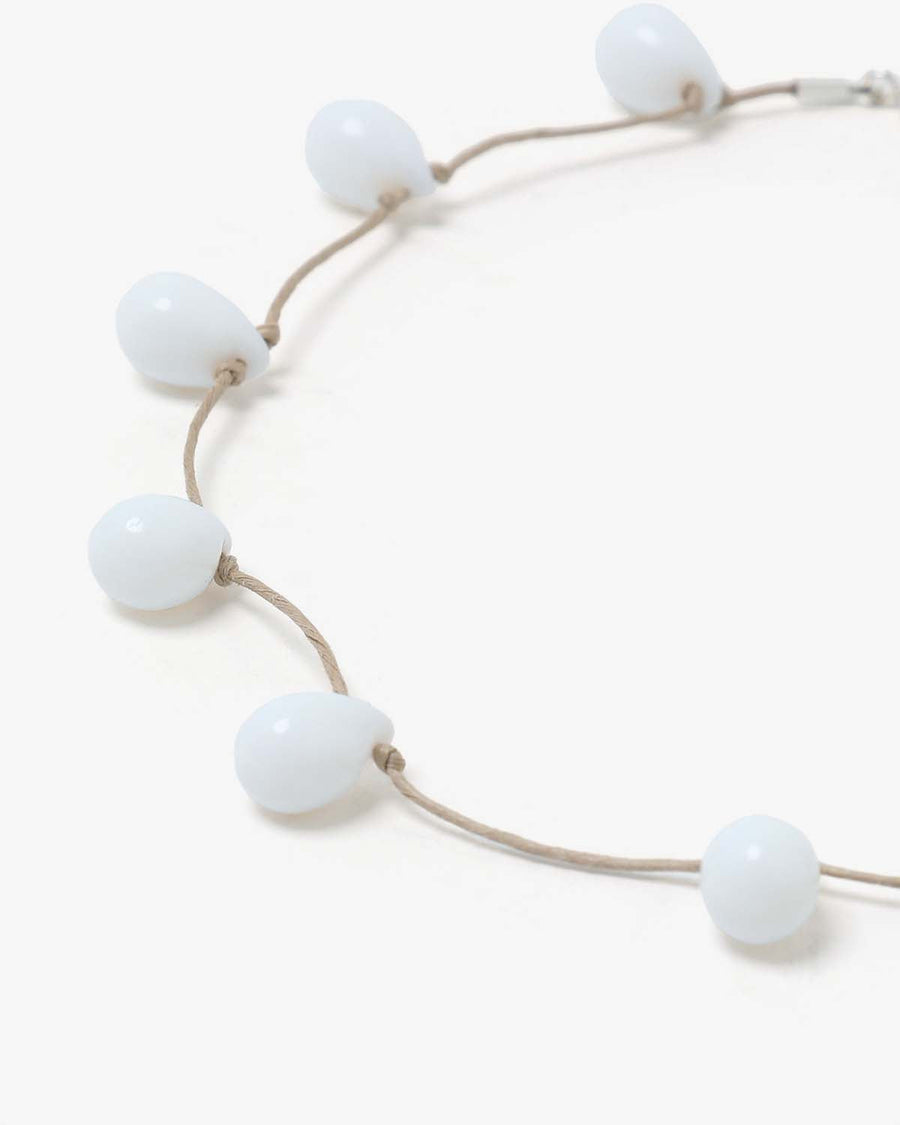 ホワイトビーズとベージュの紐を組み合わせることで、肌馴染みの良いカラーで仕上げました。