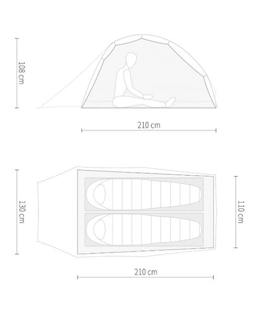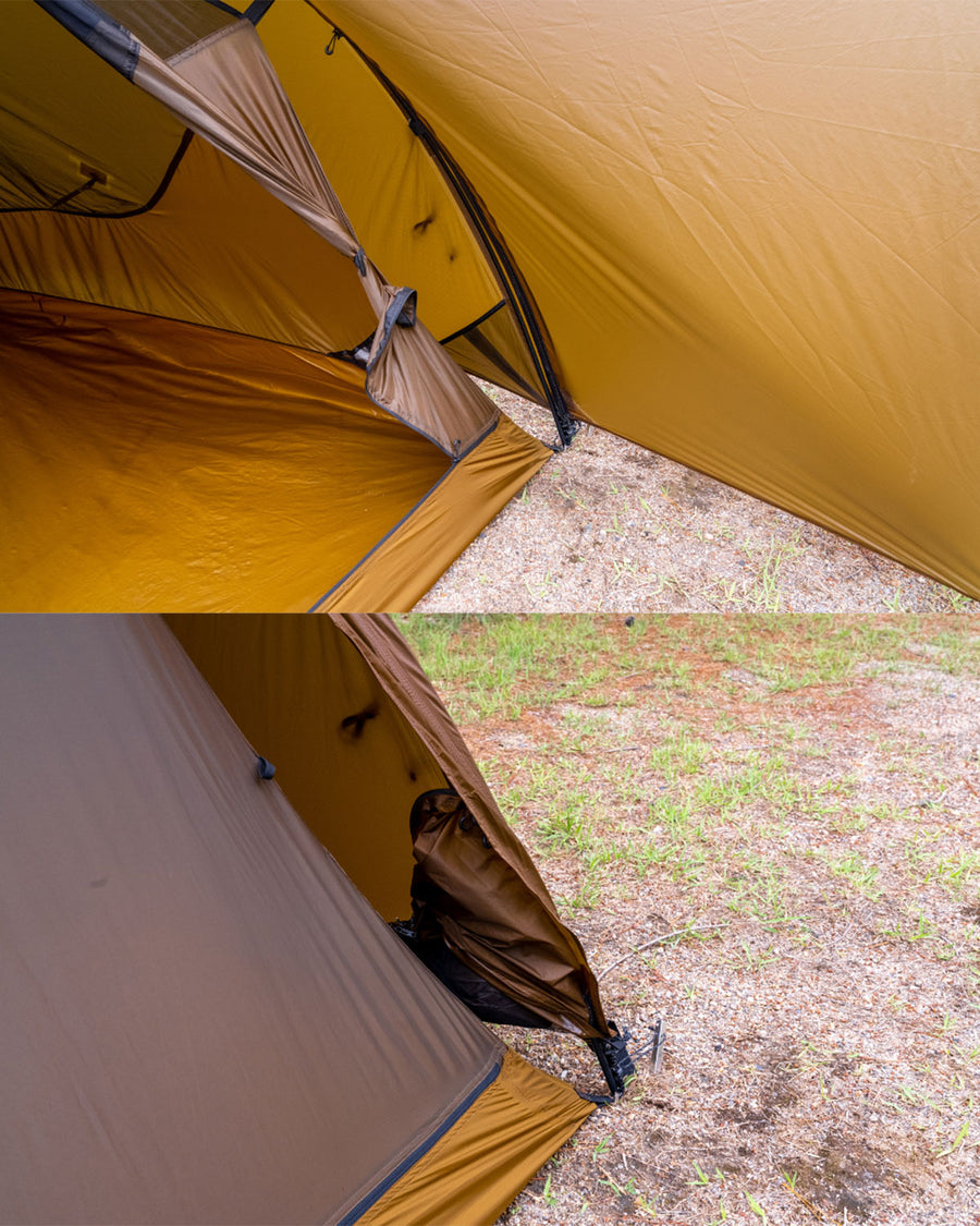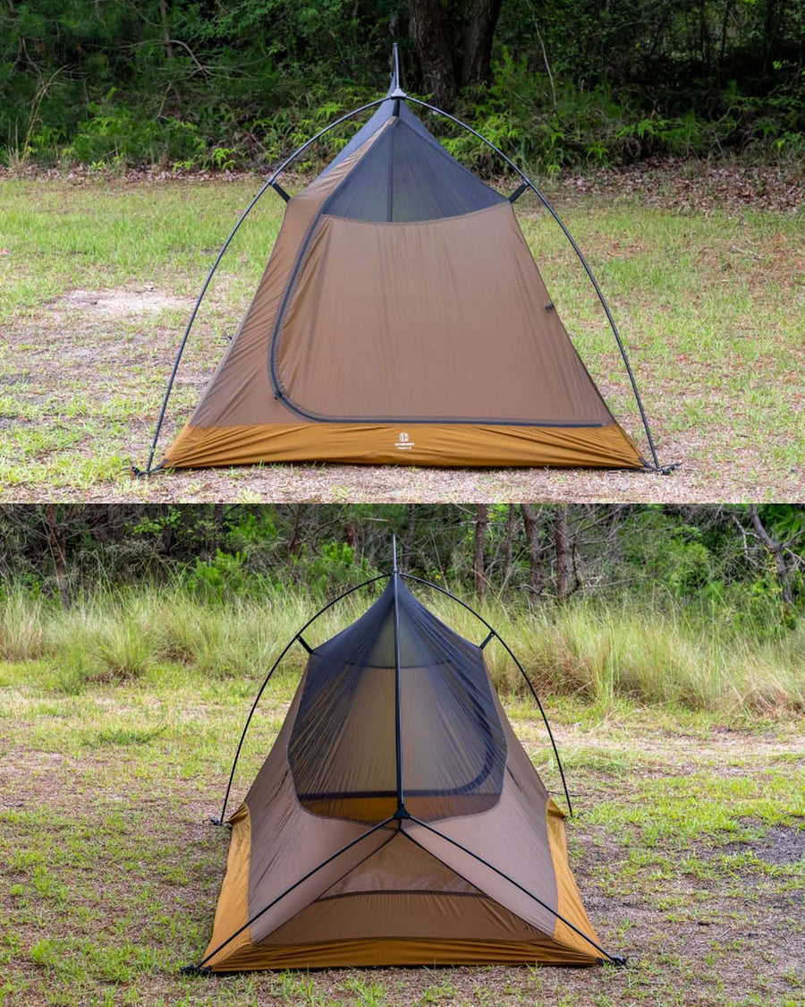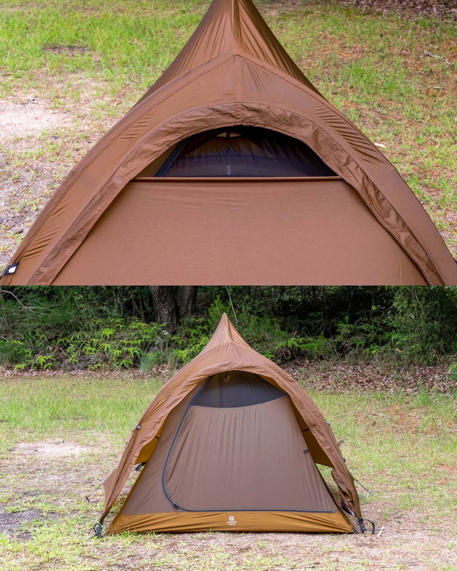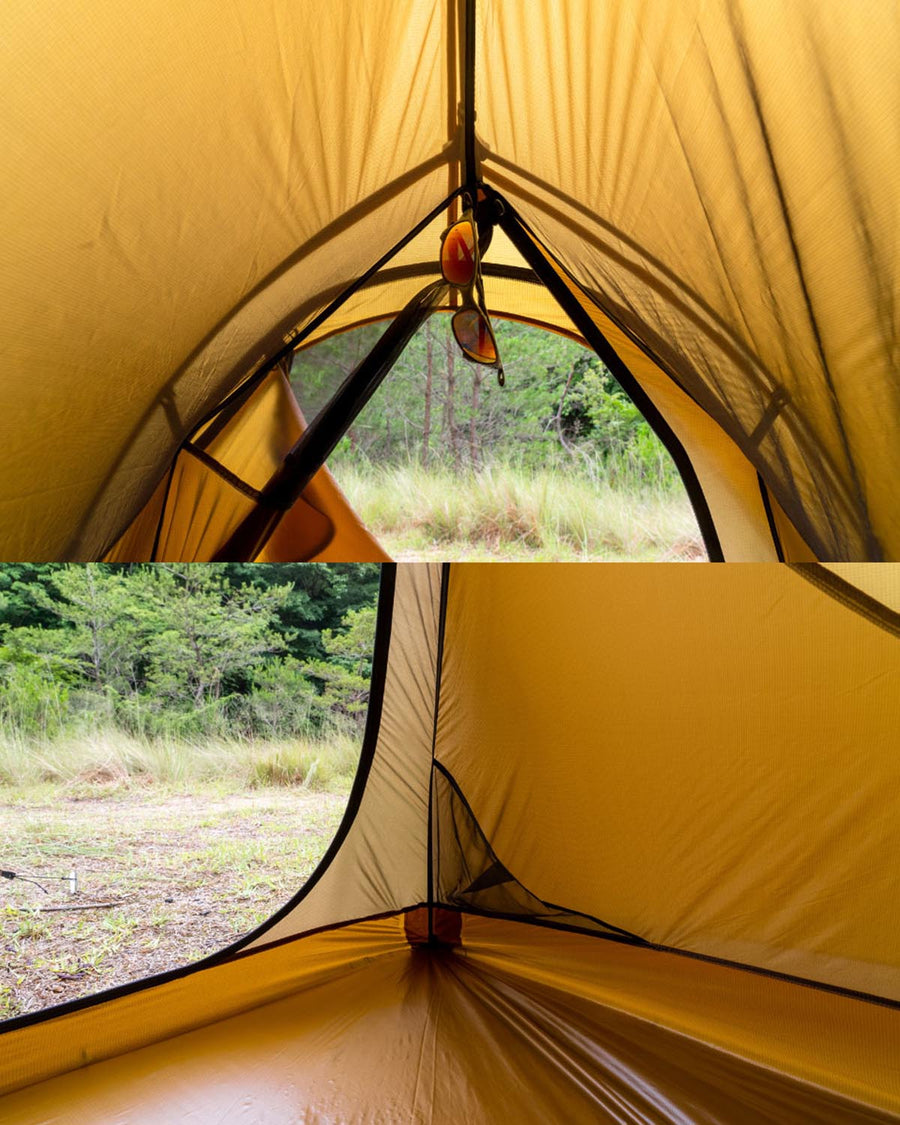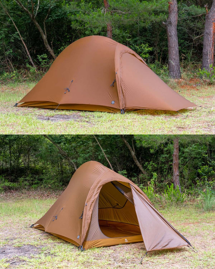 自立式ダブルウォール構造を採用し、別売りのトレッキングポールと組み合わせることで、前室をタープのように展開可能な設計です。