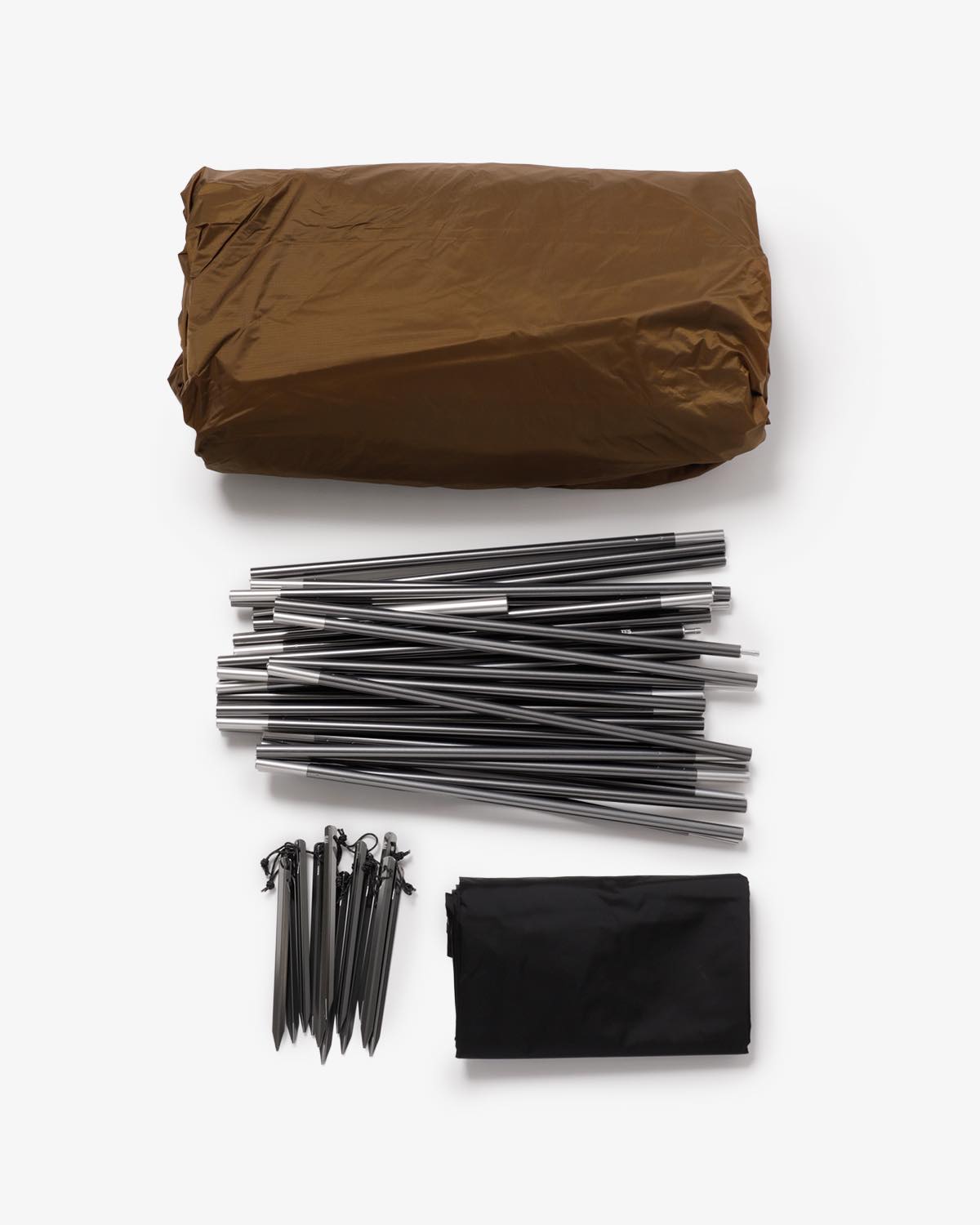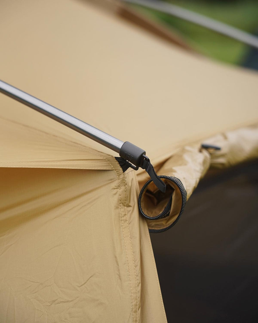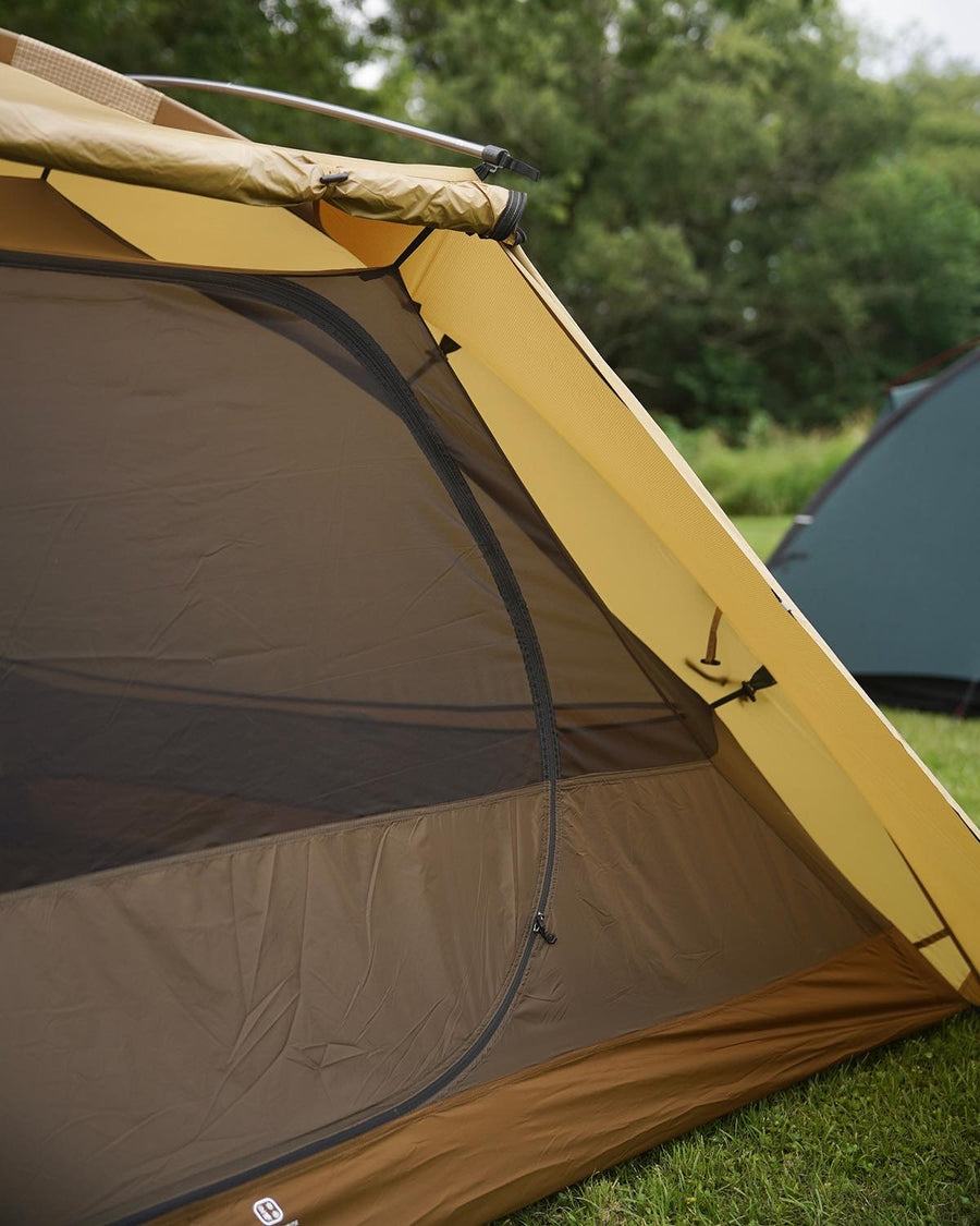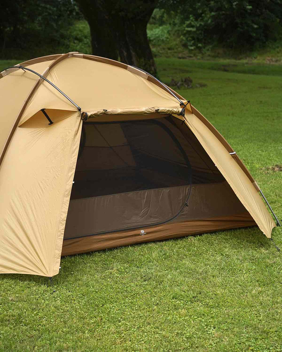 前後にメッシュとナイロン素材の二重構造ドアを設けており、別売りのストックを使用して跳ね上げることで、タープ状の前室として展開することも可能です。