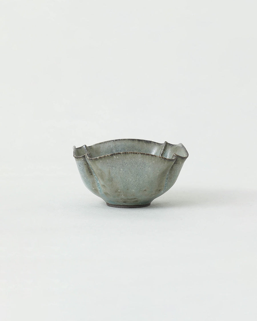 灰釉による青みがかったグレーと、有機的なフォルムが特徴です。