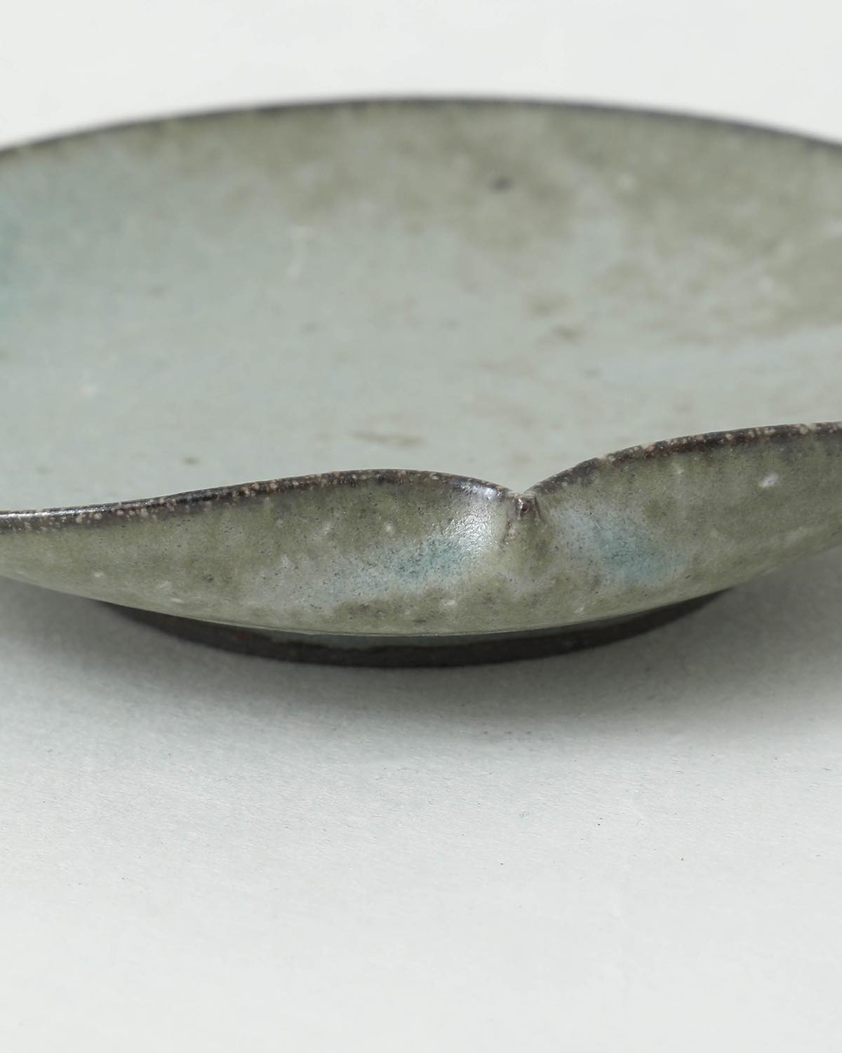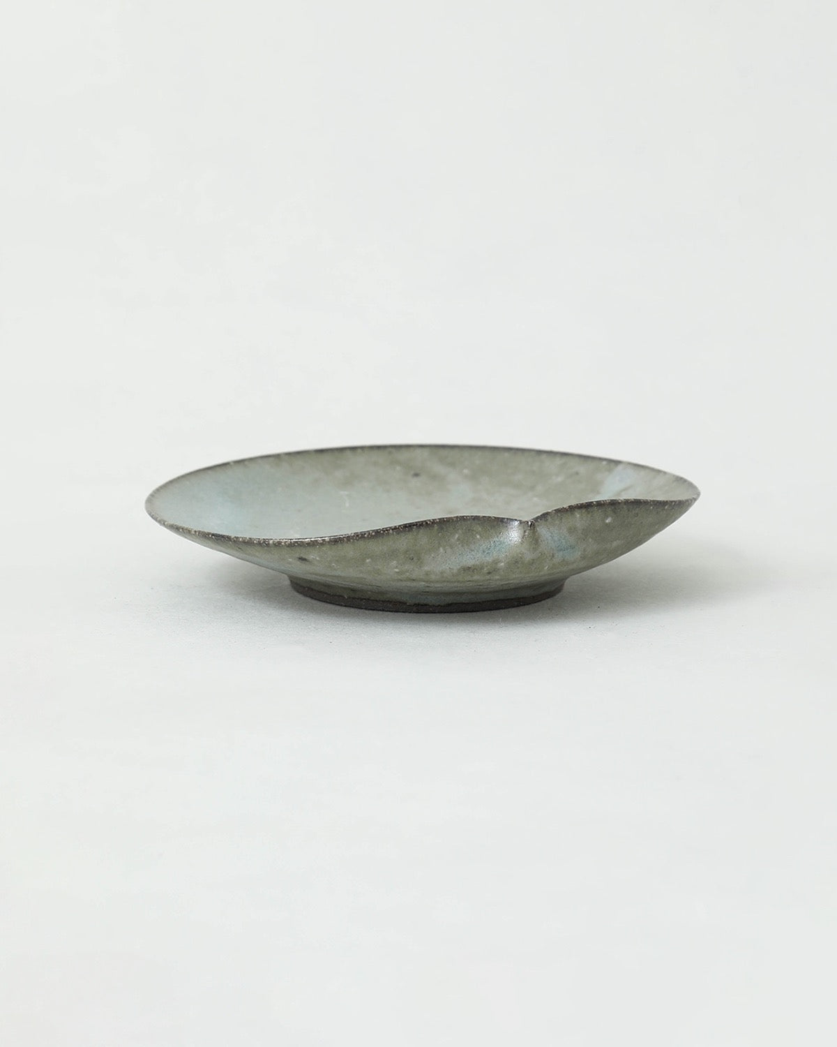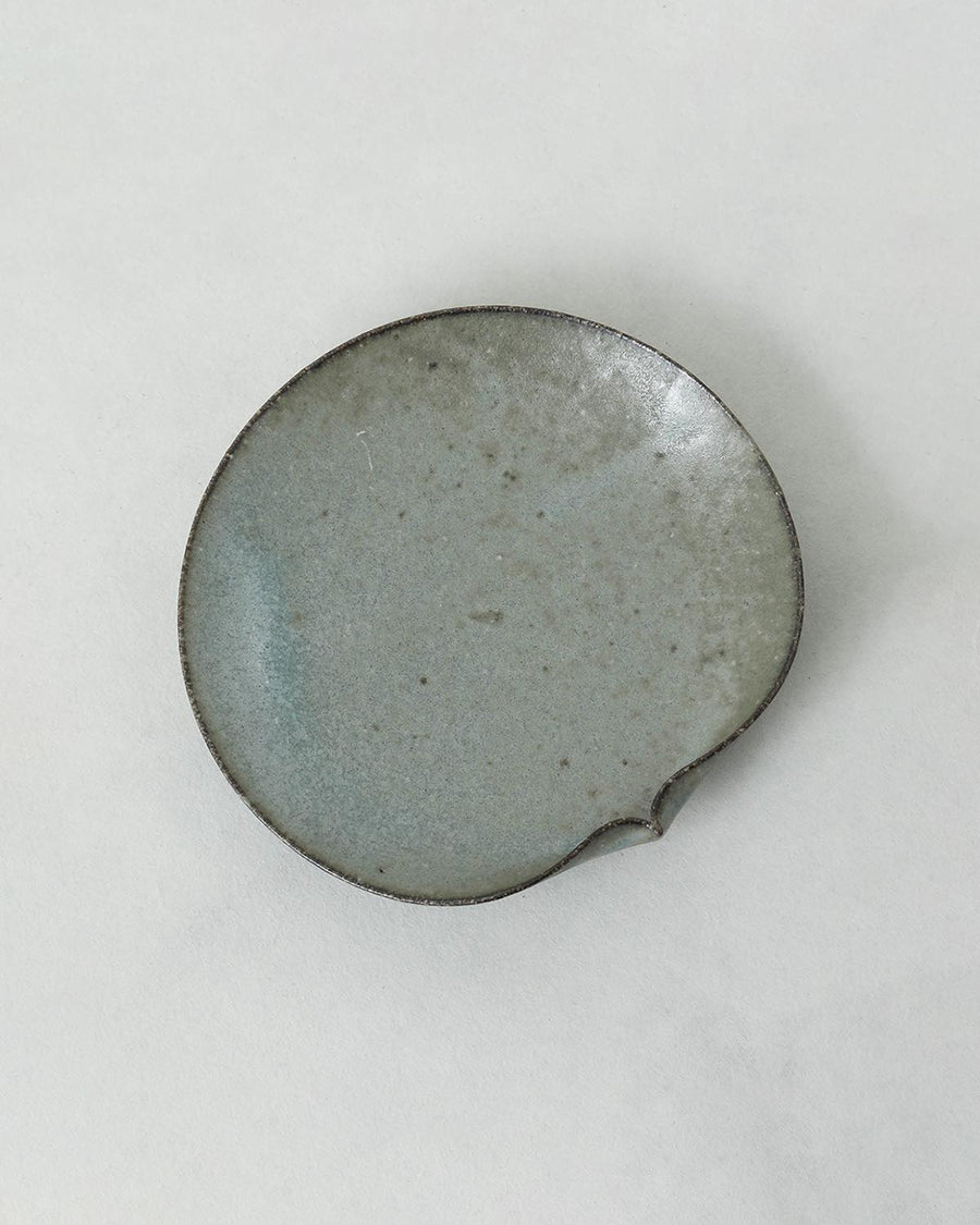 灰釉による青みがかったグレーと、有機的なフォルムが特徴です。