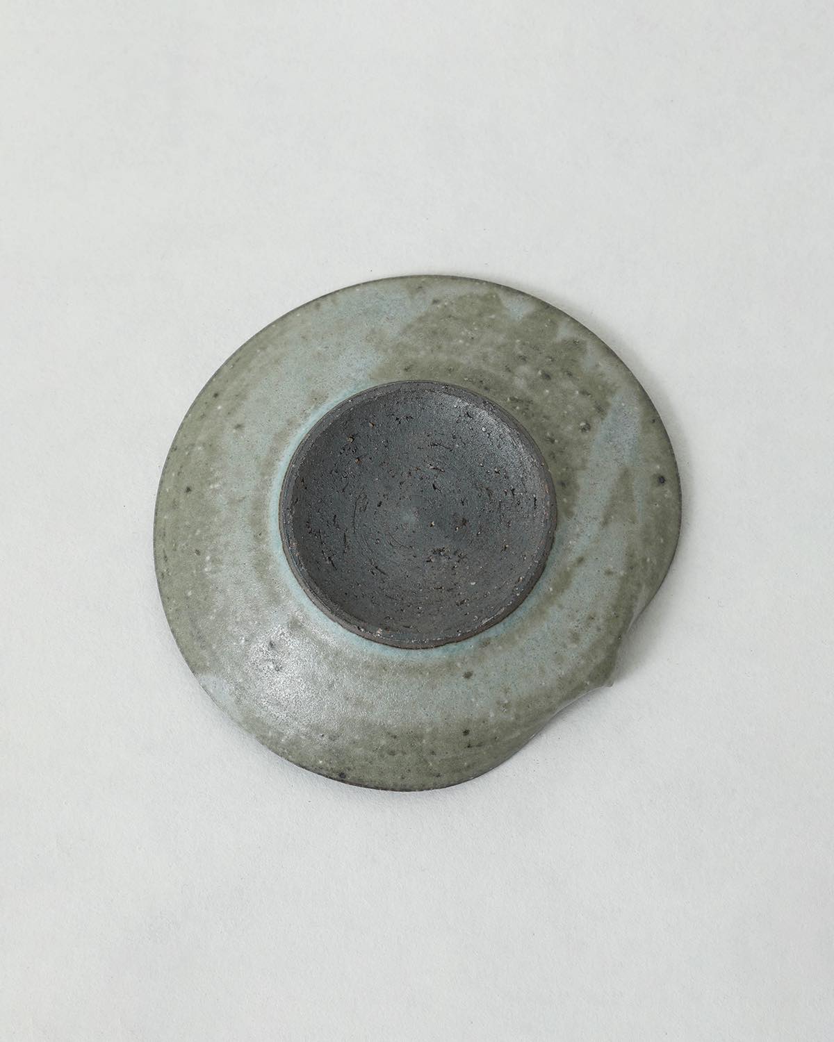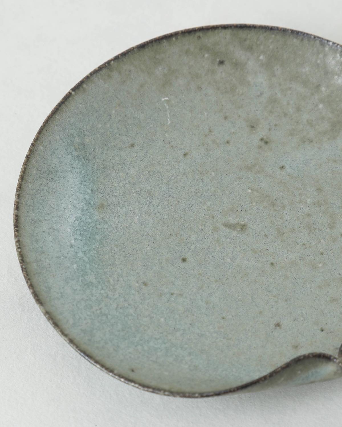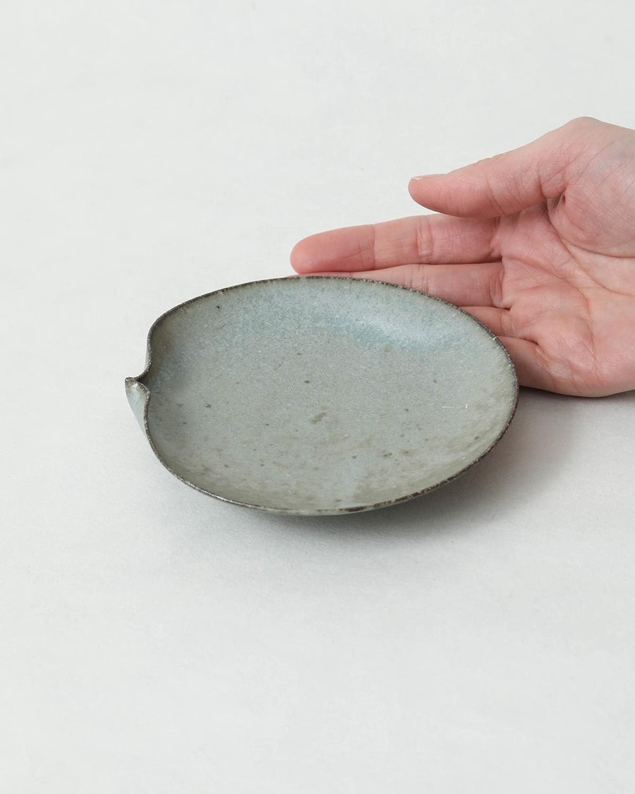 灰釉による青みがかったグレーと、有機的なフォルムが特徴です。