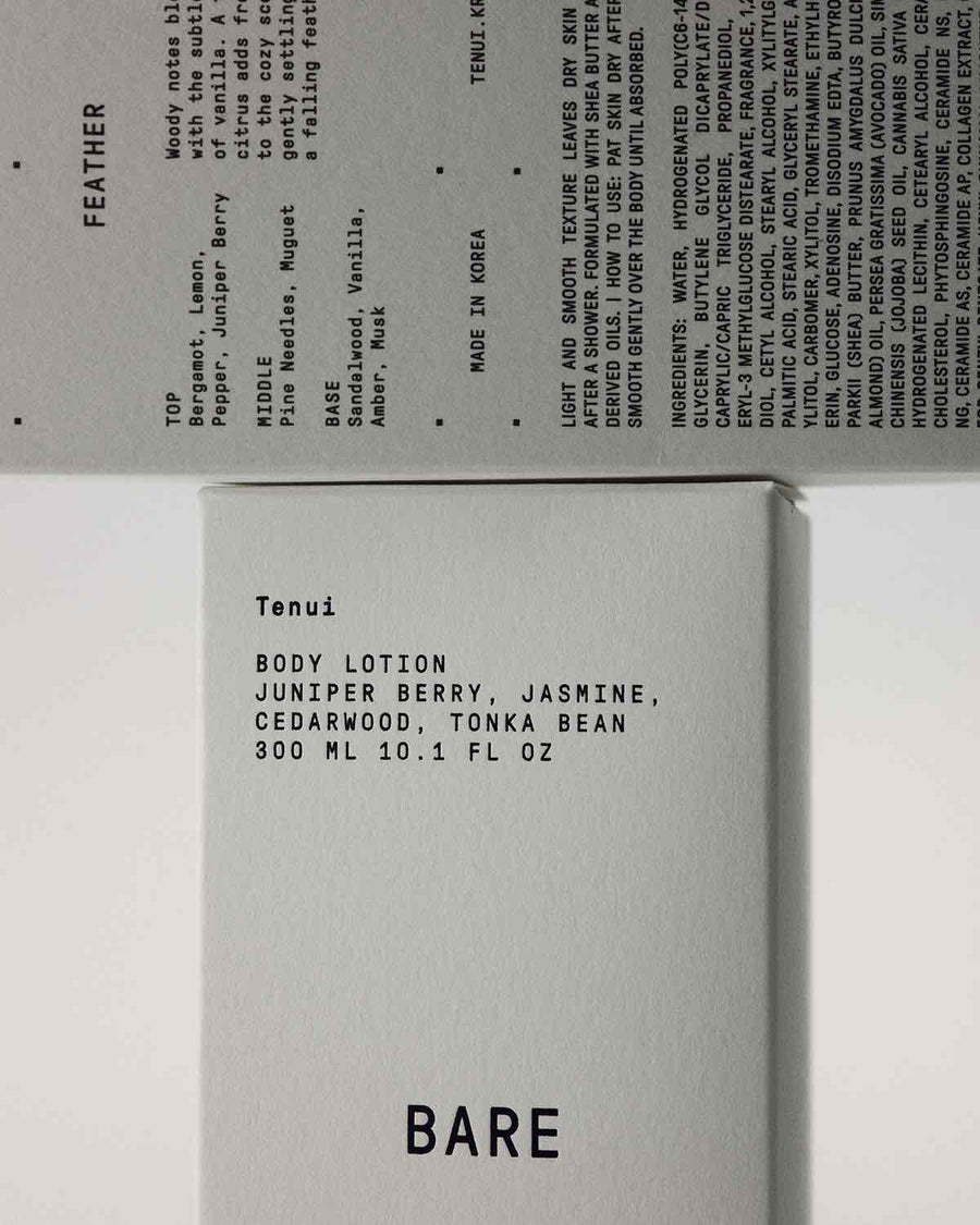 2023年、韓国ソウルを拠点にスタートしたパーソナルケア&ライフスタイルブランド。 〈Tenui〉の製品に込められた香りは、繊細かつ感覚的で、私的な時間や空間をよりムーディで特別なものにするために存在します。 洗練されたパッケージデザインや自然由来の原料を配合した成分も特徴で、個人の生活や記憶の中で長く定着するようなパーソナルなアイテムを目指しています。