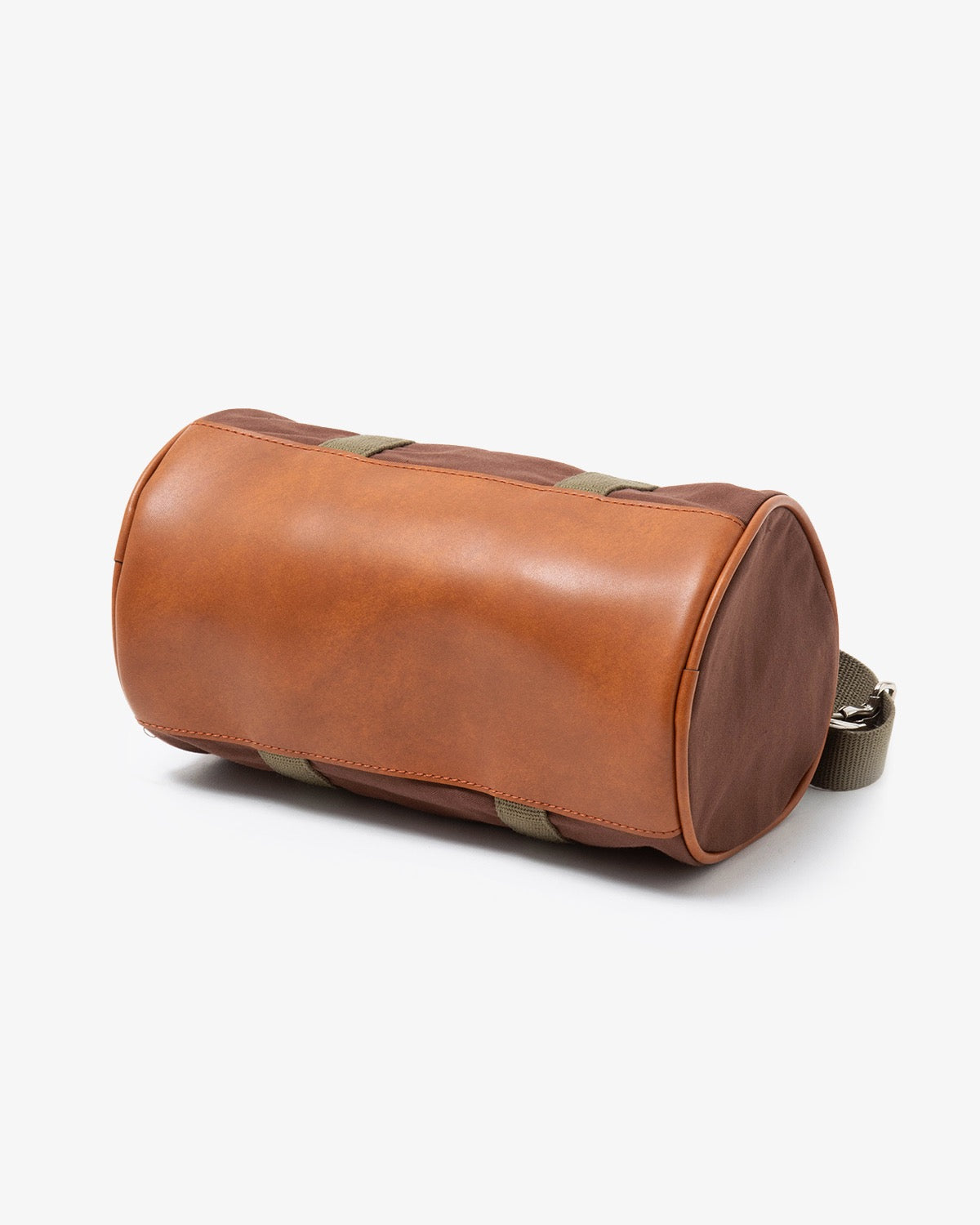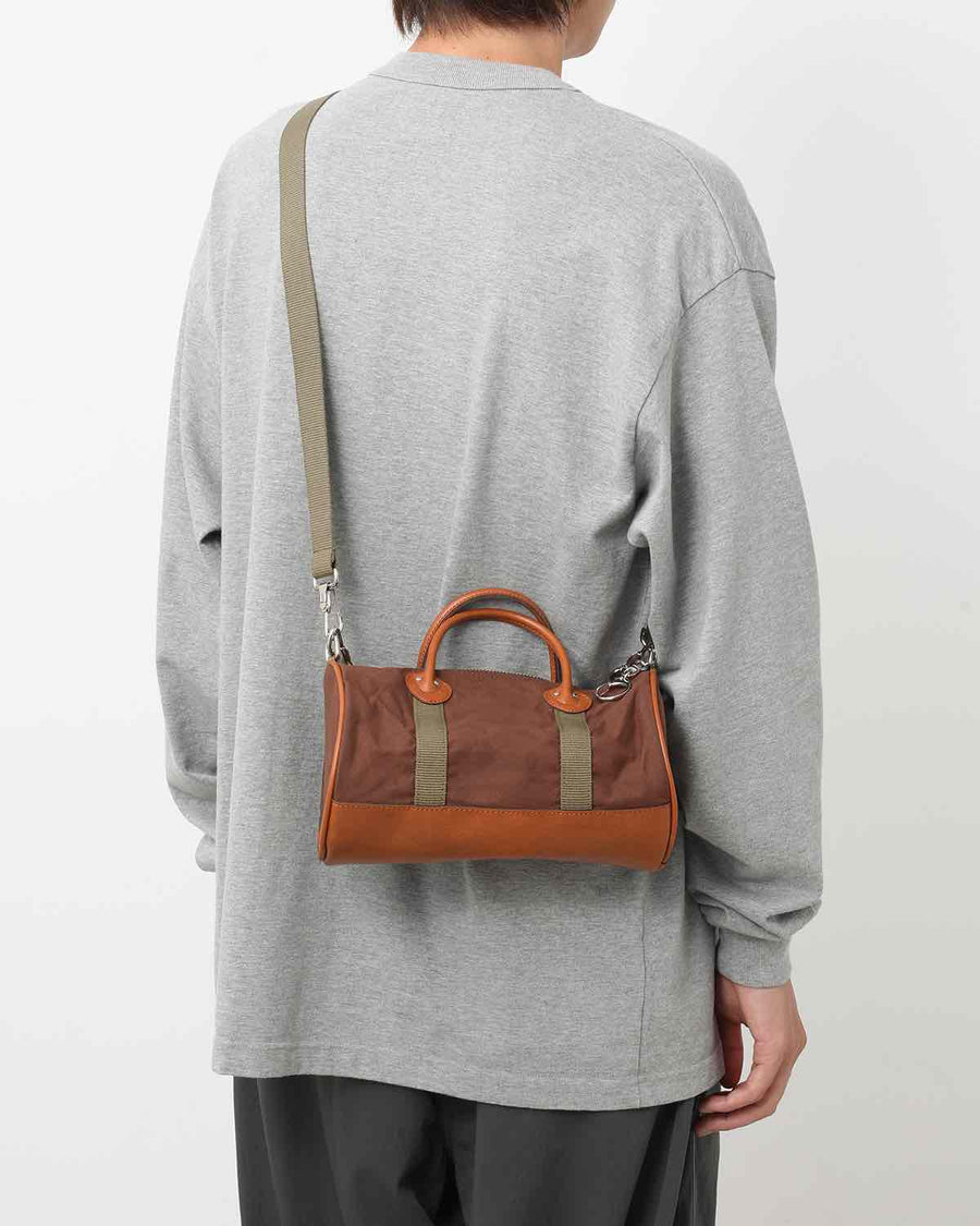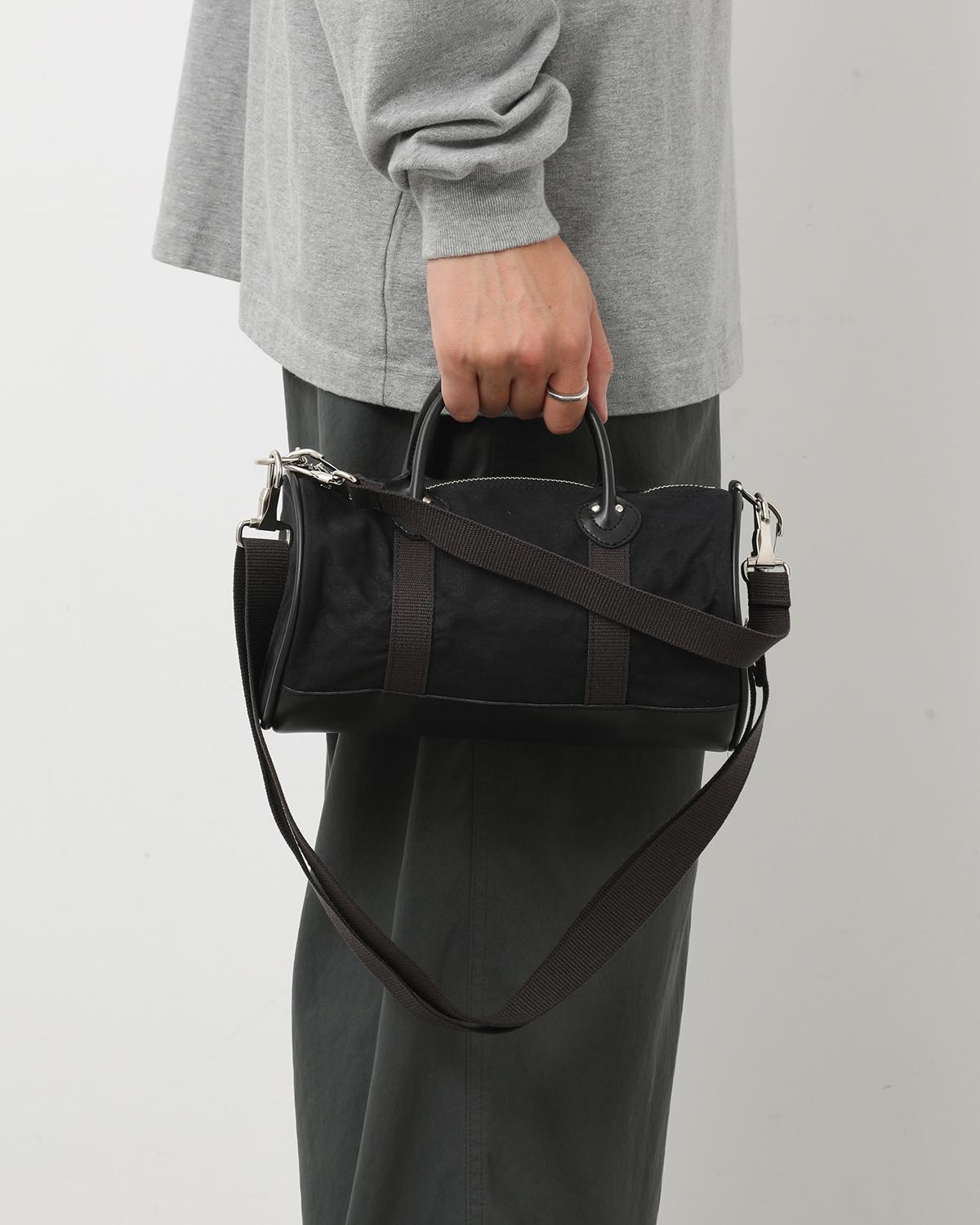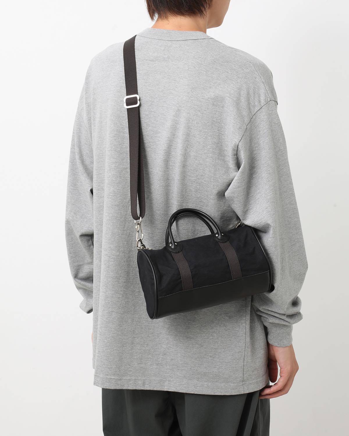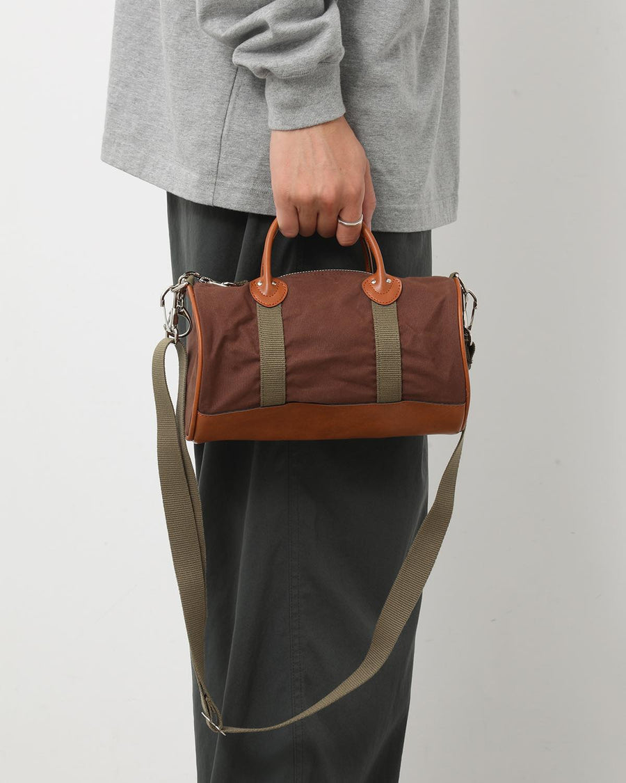 クラシカルなドラム型ダッフルバックを、小さなポシェットサイズに縮小したデザインです。キャンバス地とフェイクレザーのコンビネーションは1970年代のイメージを残したデティールワークです。