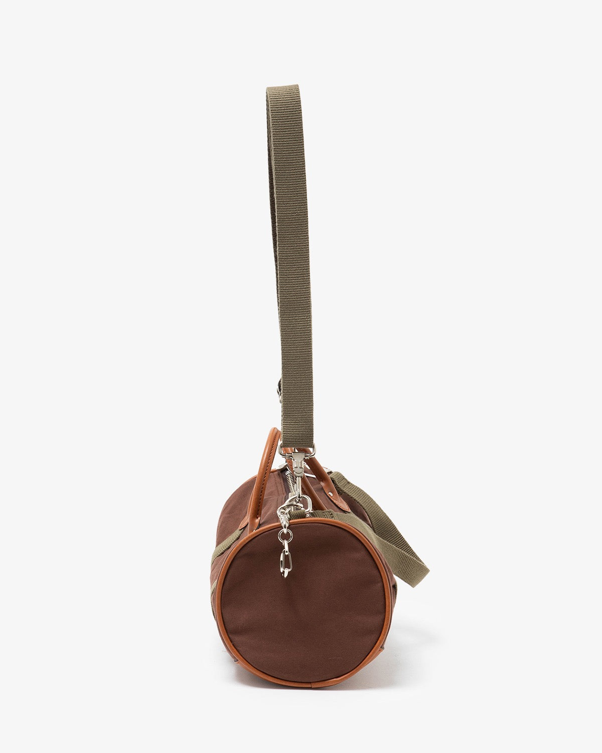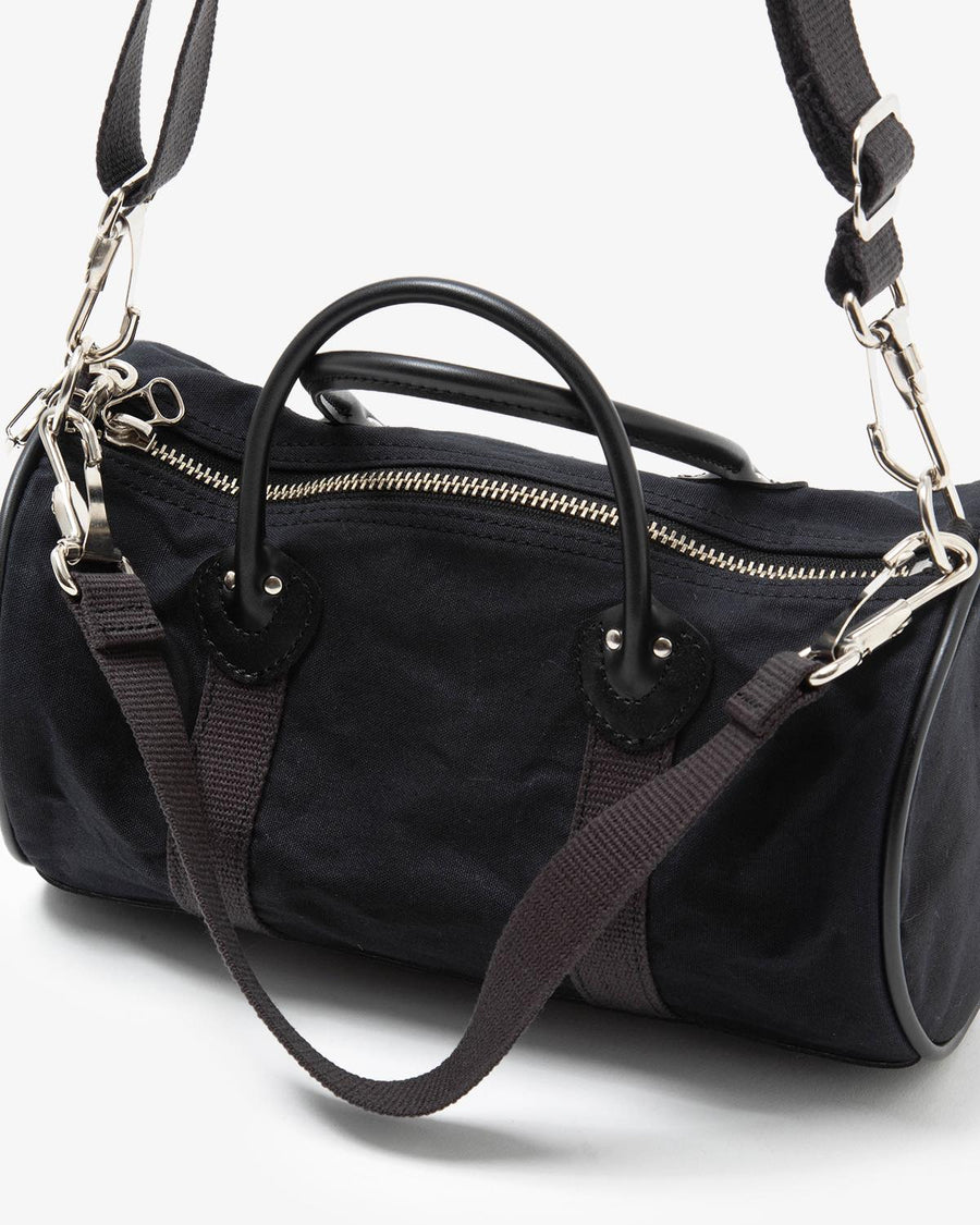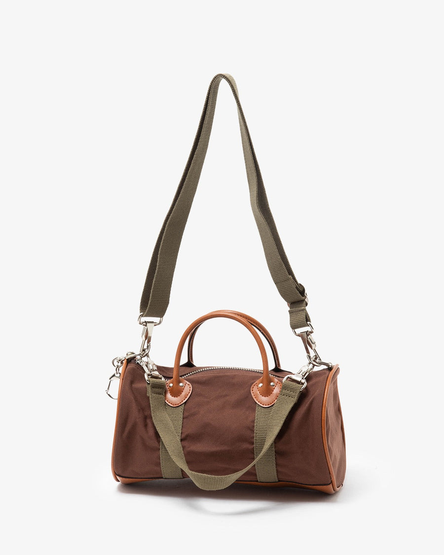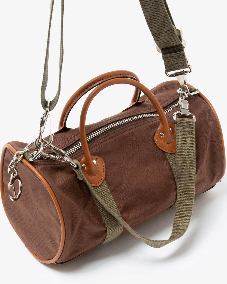 クラシカルなドラム型ダッフルバックを、小さなポシェットサイズに縮小したデザインです。キャンバス地とフェイクレザーのコンビネーションは1970年代のイメージを残したデティールワークです。