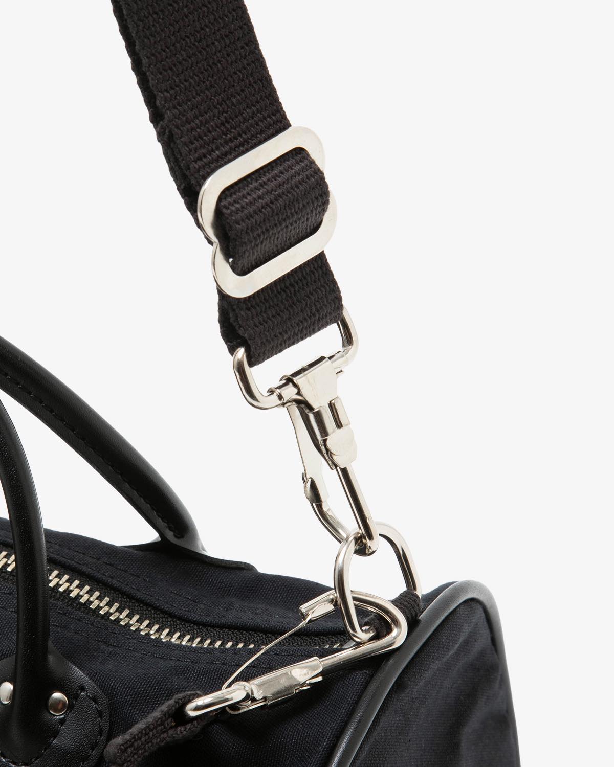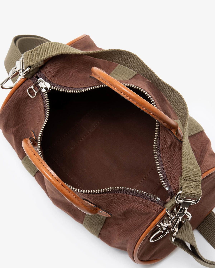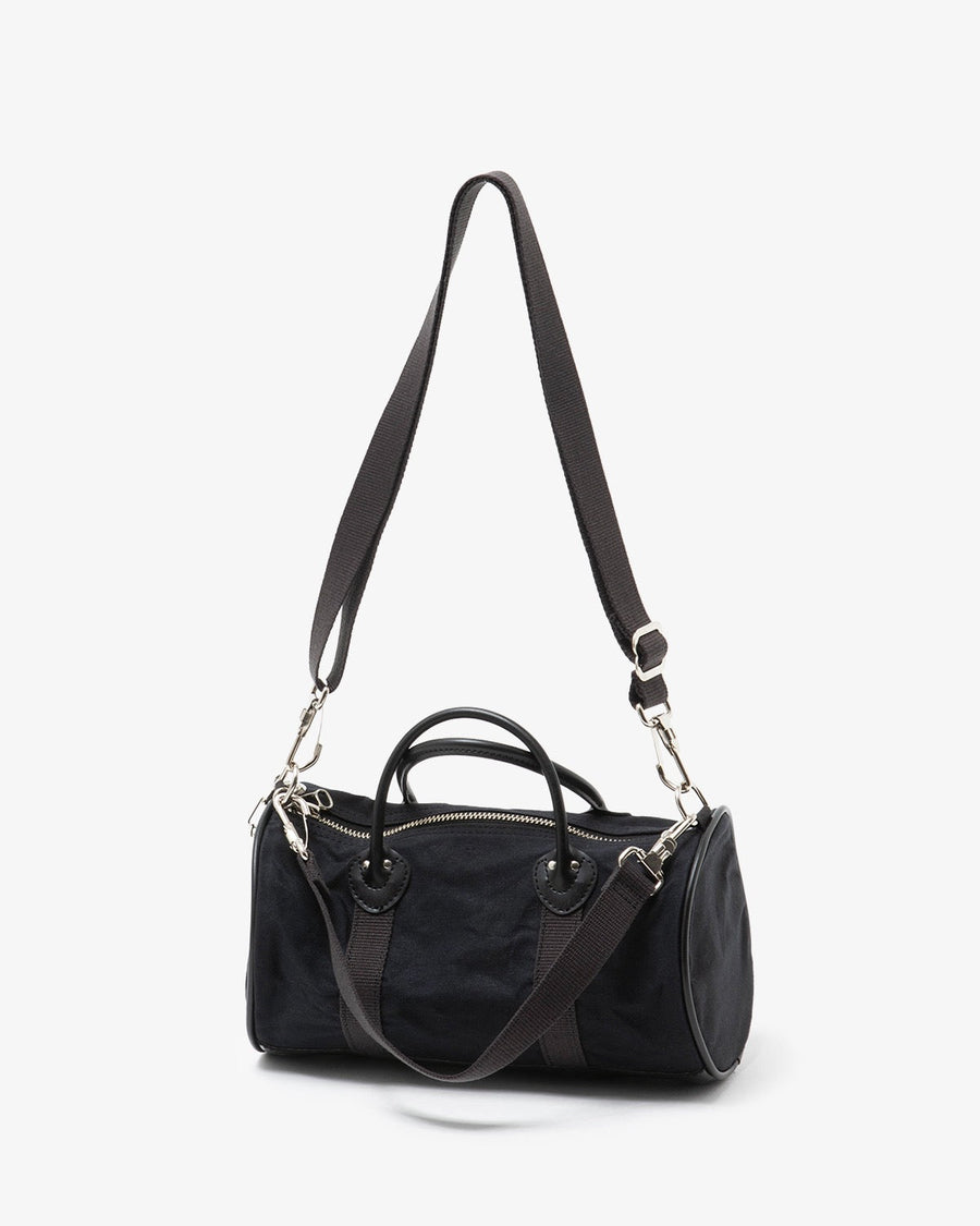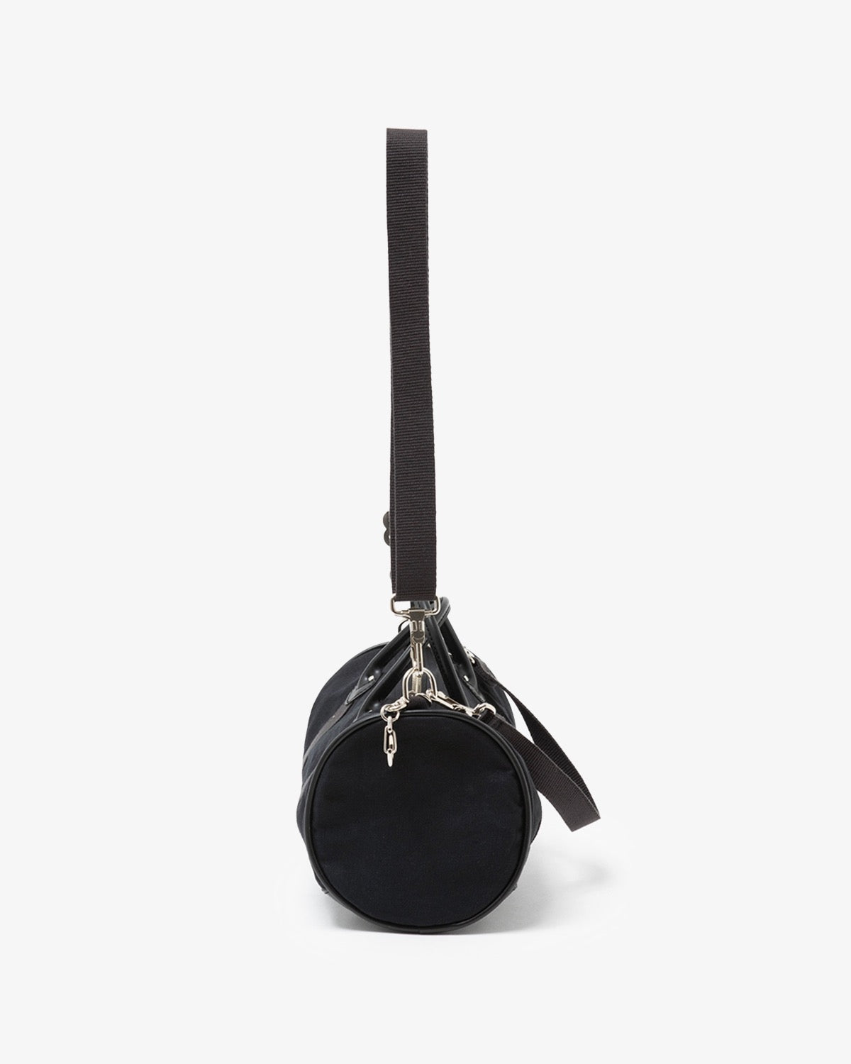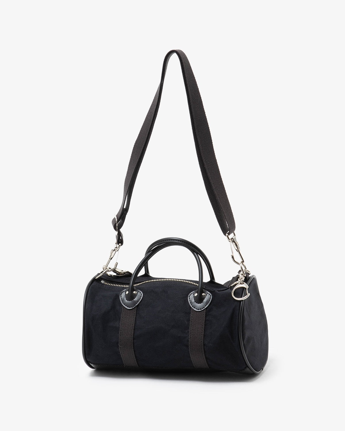 クラシカルなドラム型ダッフルバックを、小さなポシェットサイズに縮小したデザインです。キャンバス地とフェイクレザーのコンビネーションは1970年代のイメージを残したデティールワークです。