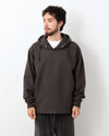 特徴的なプルオーバーフード、裾はリブがなく、ドローコードで絞り各々のアレンジで着用出来ます。
