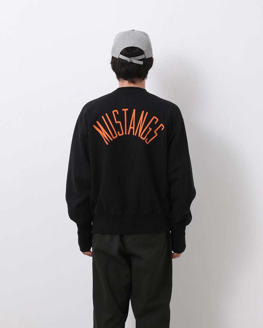 背面には、ヴィンテージウエアよりインスピレーションを受けた”MUSTANGS”の染み込みプリントを配しています。
